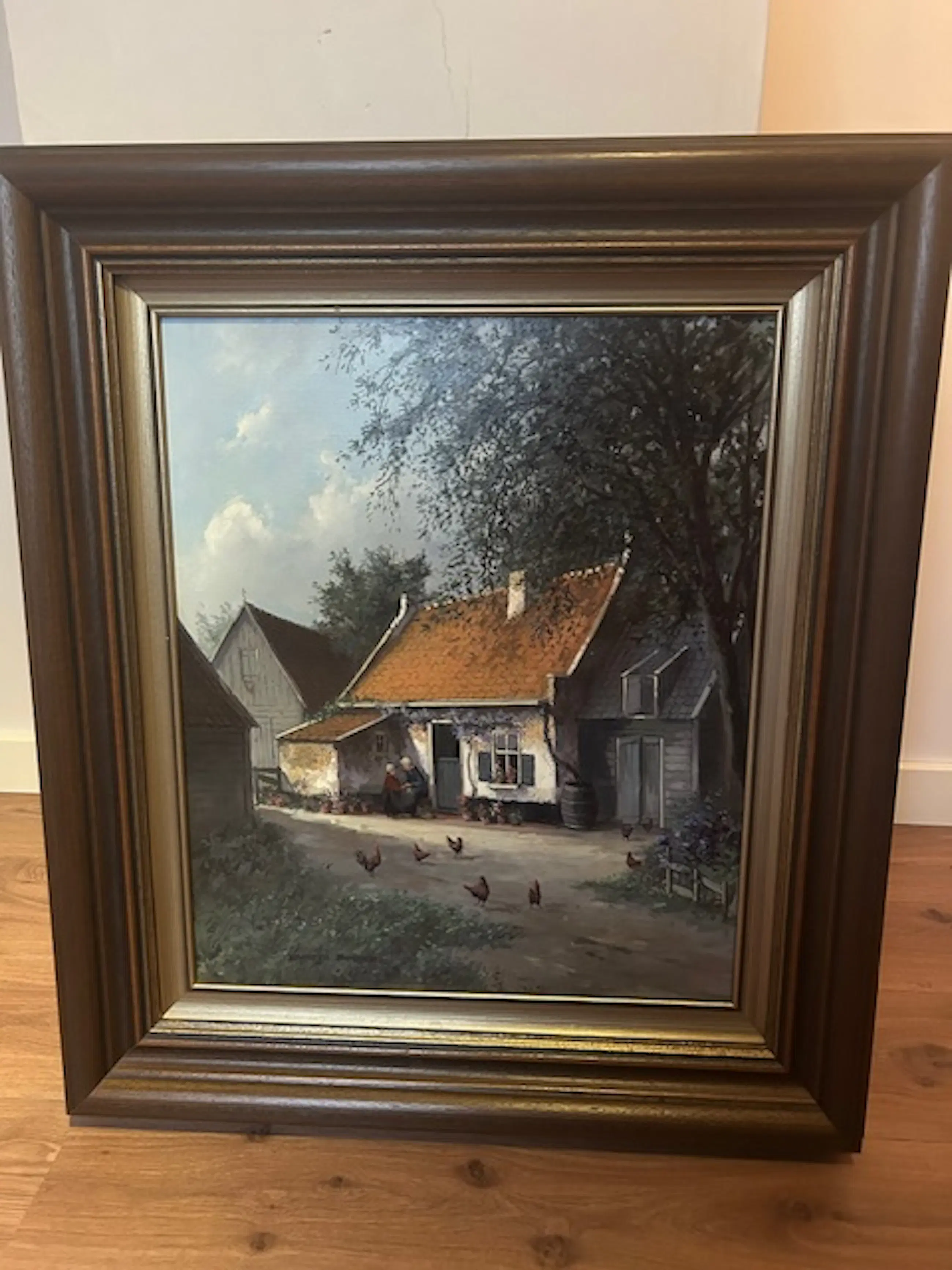 Schilderij met boerderij, 2 mensen buiten voor de boerderij aan het werk, kippen op de voorgrond