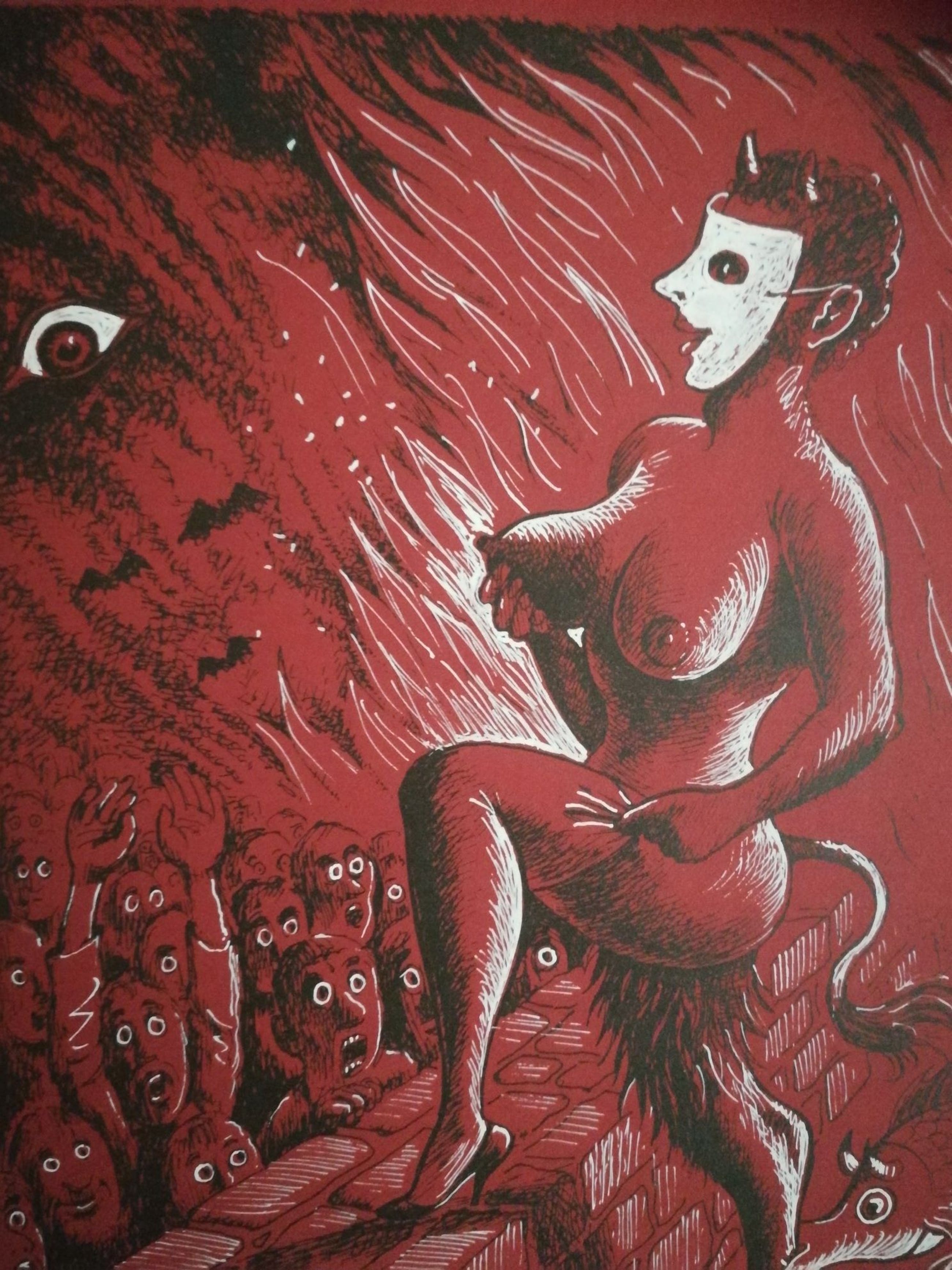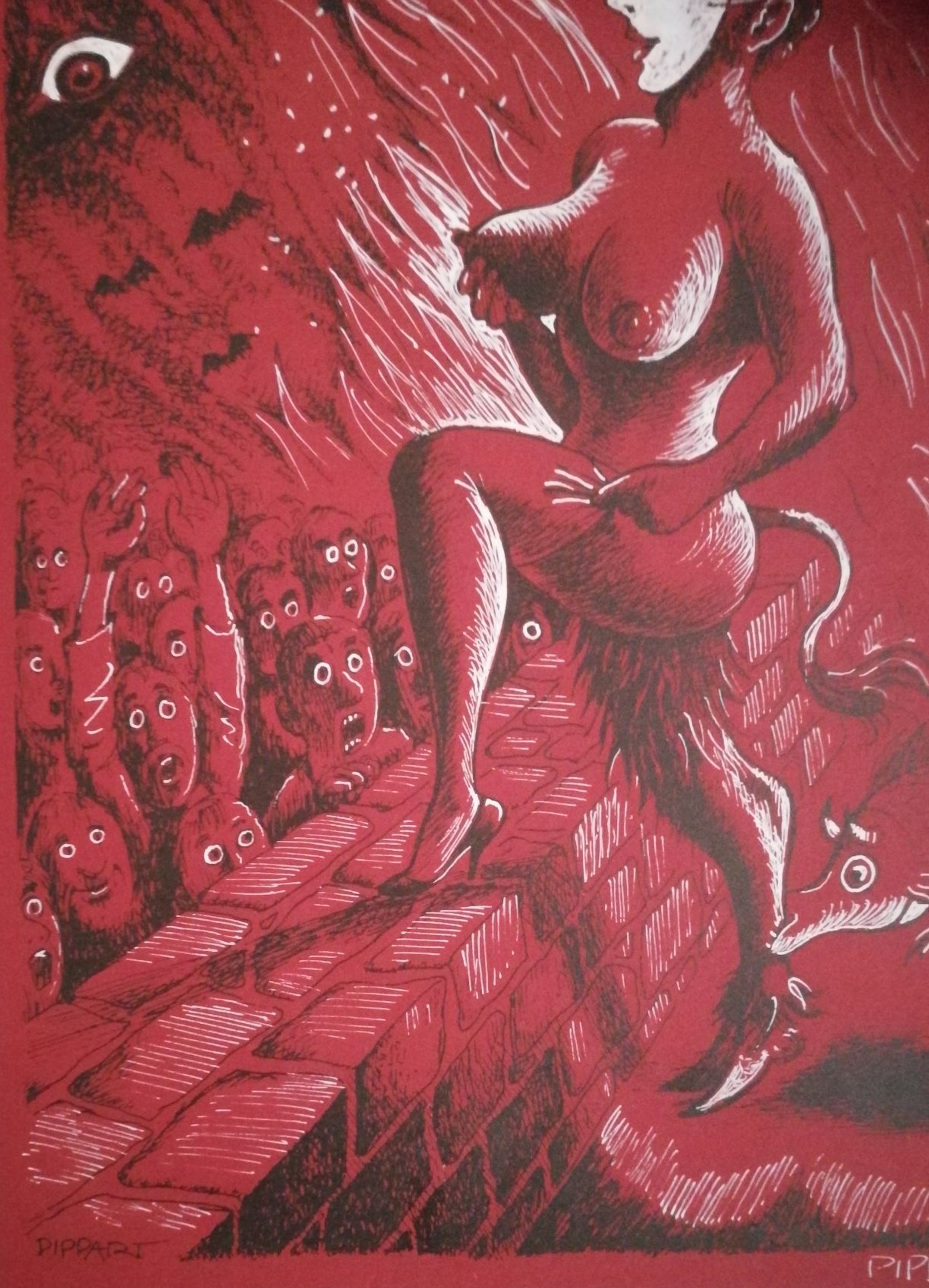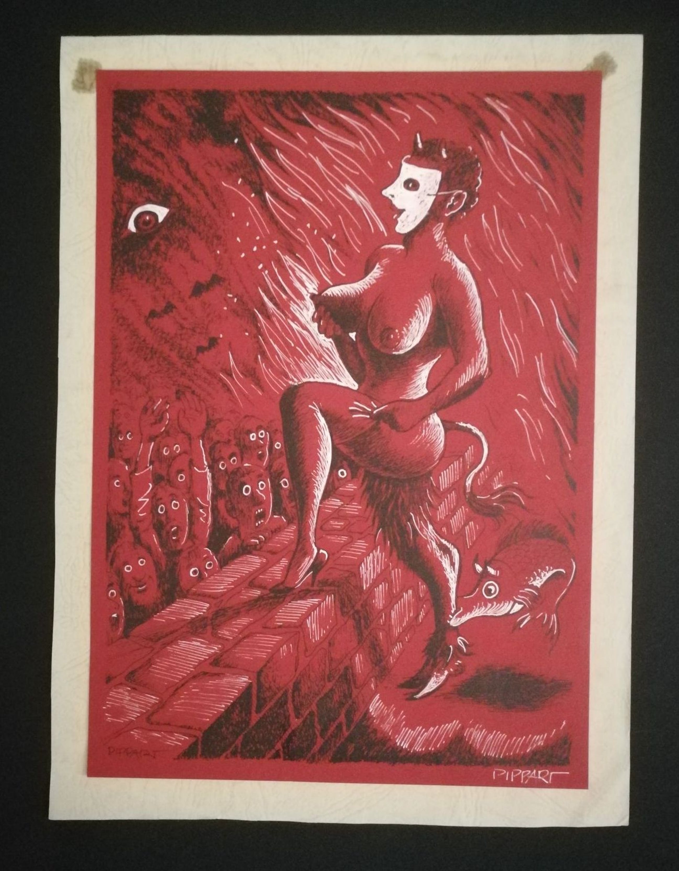 Het vroege werk van de Duitse kunstenaar Pippart heeft een duidelijke erotische component. In dit geval toont een gemaskerde duivelin haar borst aan het geschrokken mannelijk publiek, terwijl een gehoornd dier haar bij haar bokkepoot grijpt. Het werk is op rood (!) papier gedrukt en zo te zien gehoogd met wit. Het werk is zowel linksonder in de tekening meegedrukt getekend, als rechtsonder in wit handgesigneerd. Het werk heeft jarenlang in een map gezeten, is dus nog in prima staat, het rode vel is in de hoekjes geplakt op een cremekleurig papier. Bieden vanaf 1 euro