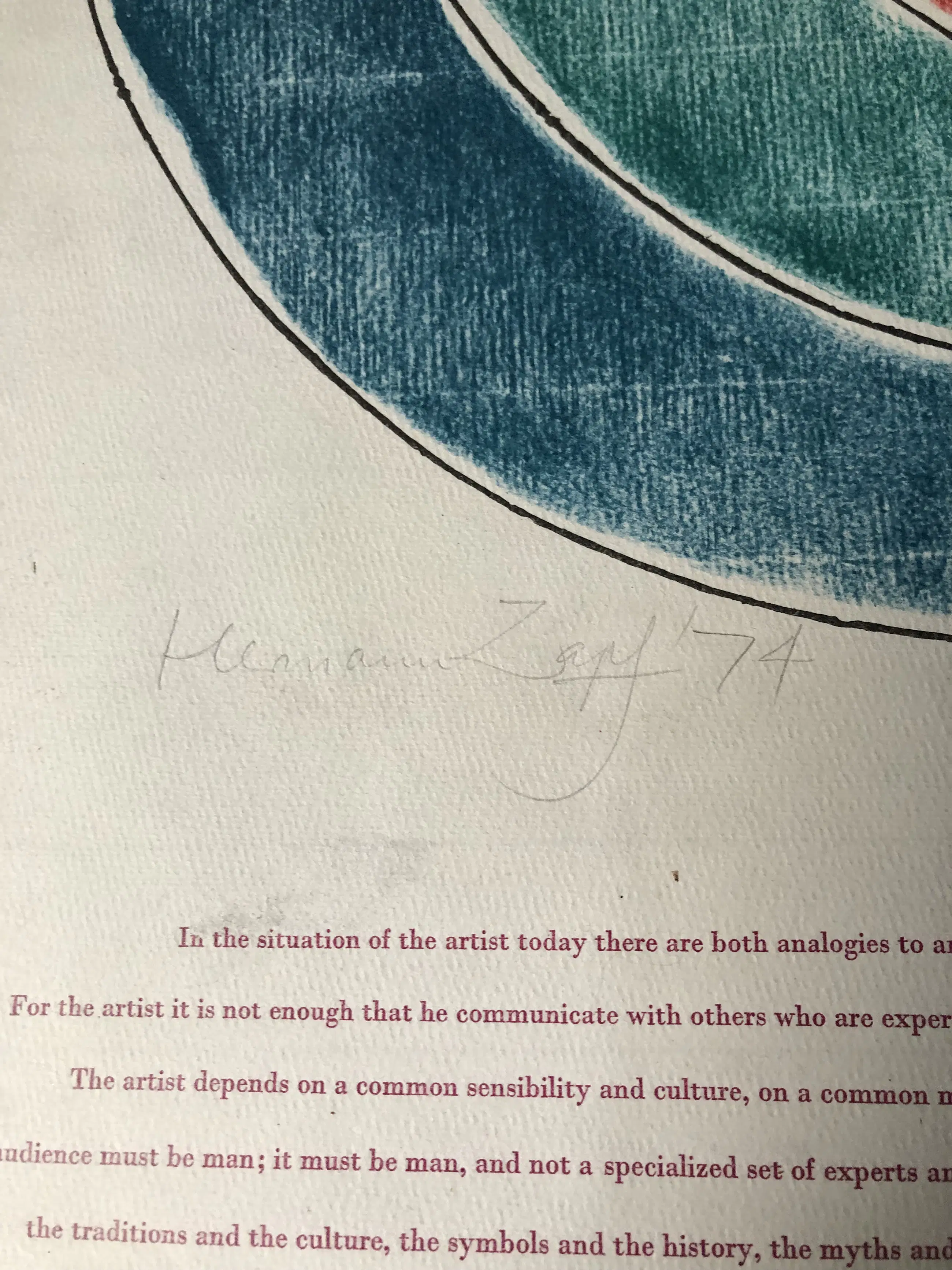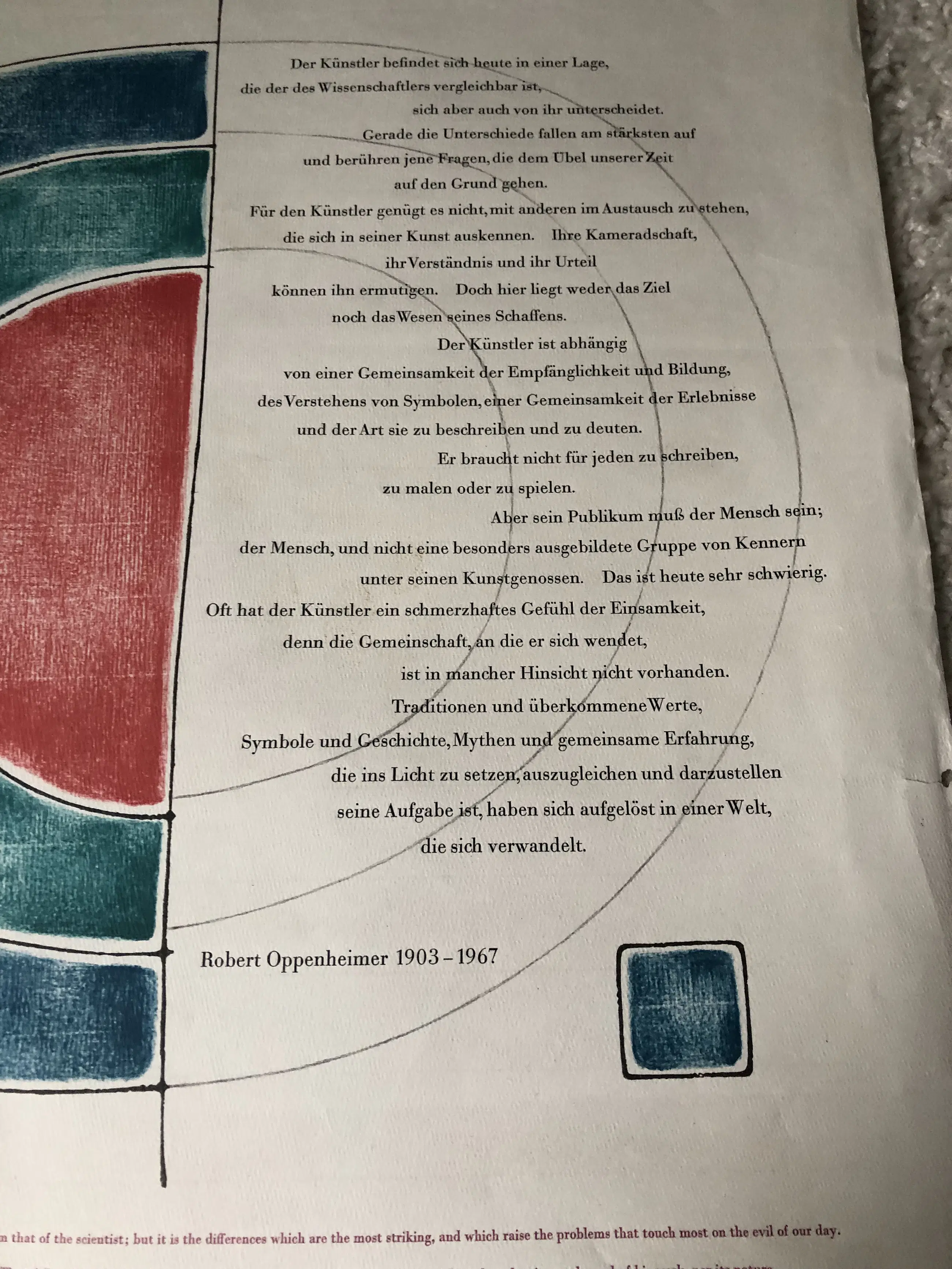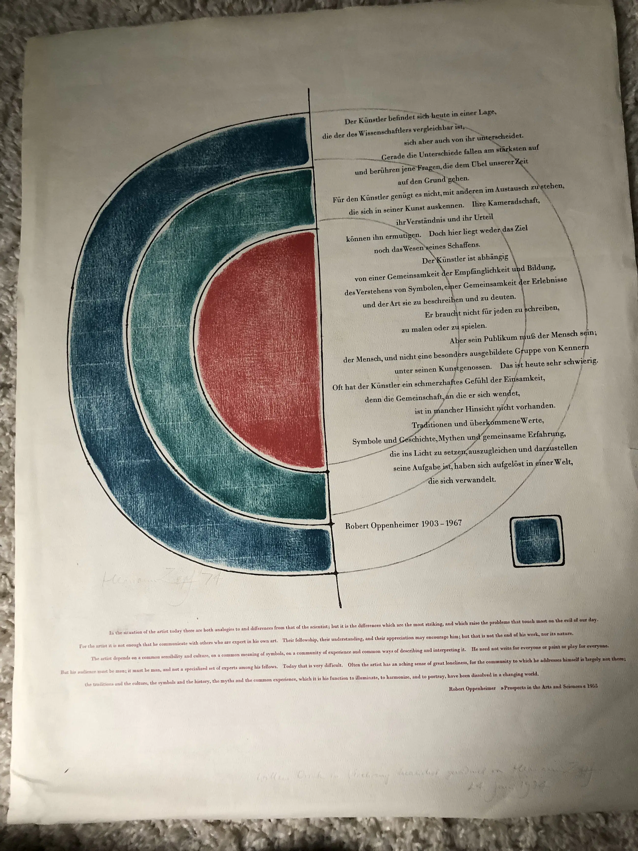 Ingekleurde werk van Herman Zapf uit 1974 Op een statement van Robert Oppenheimer Met potlood gesigneerd en met tekst Prachtig historisch document