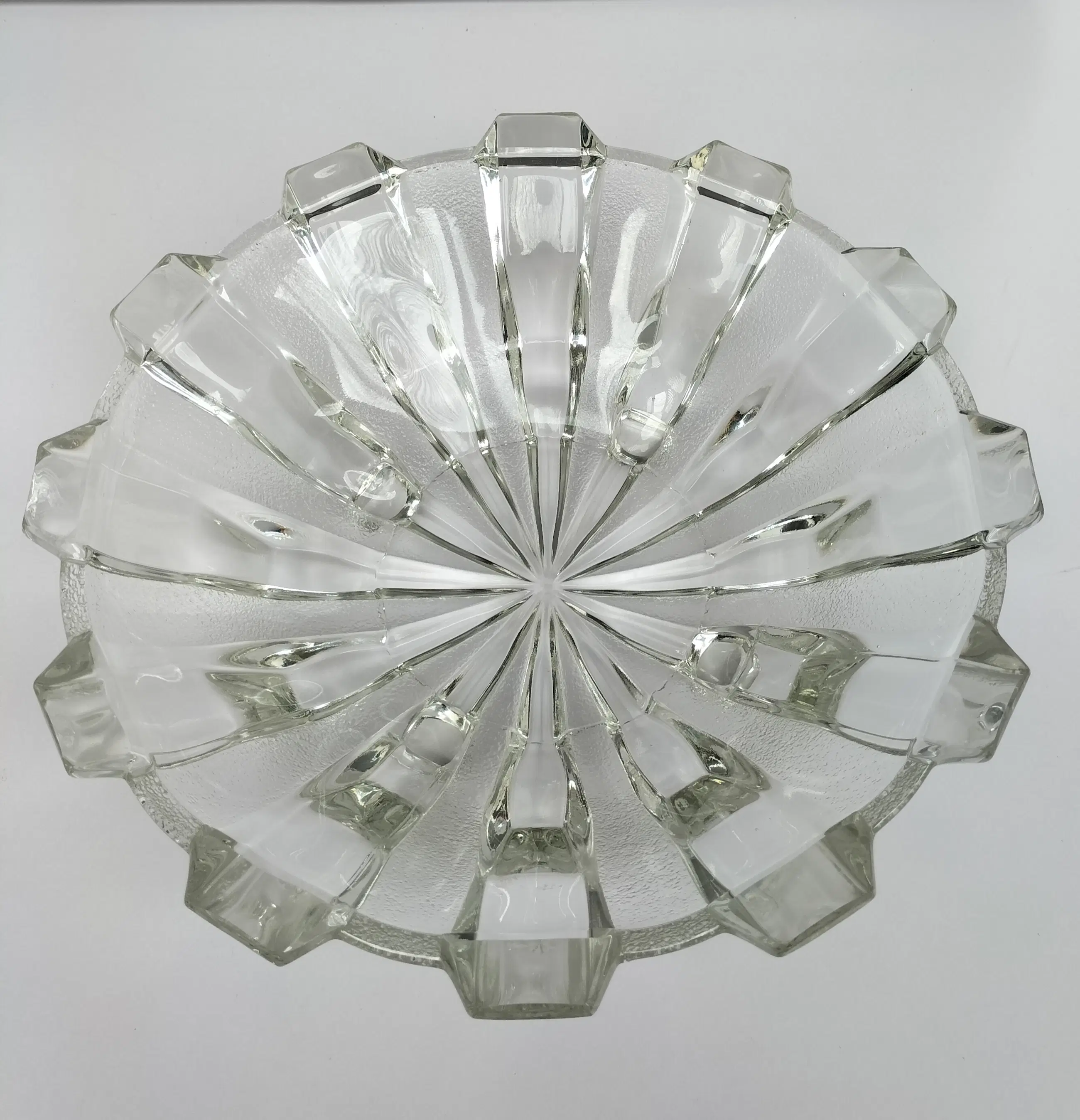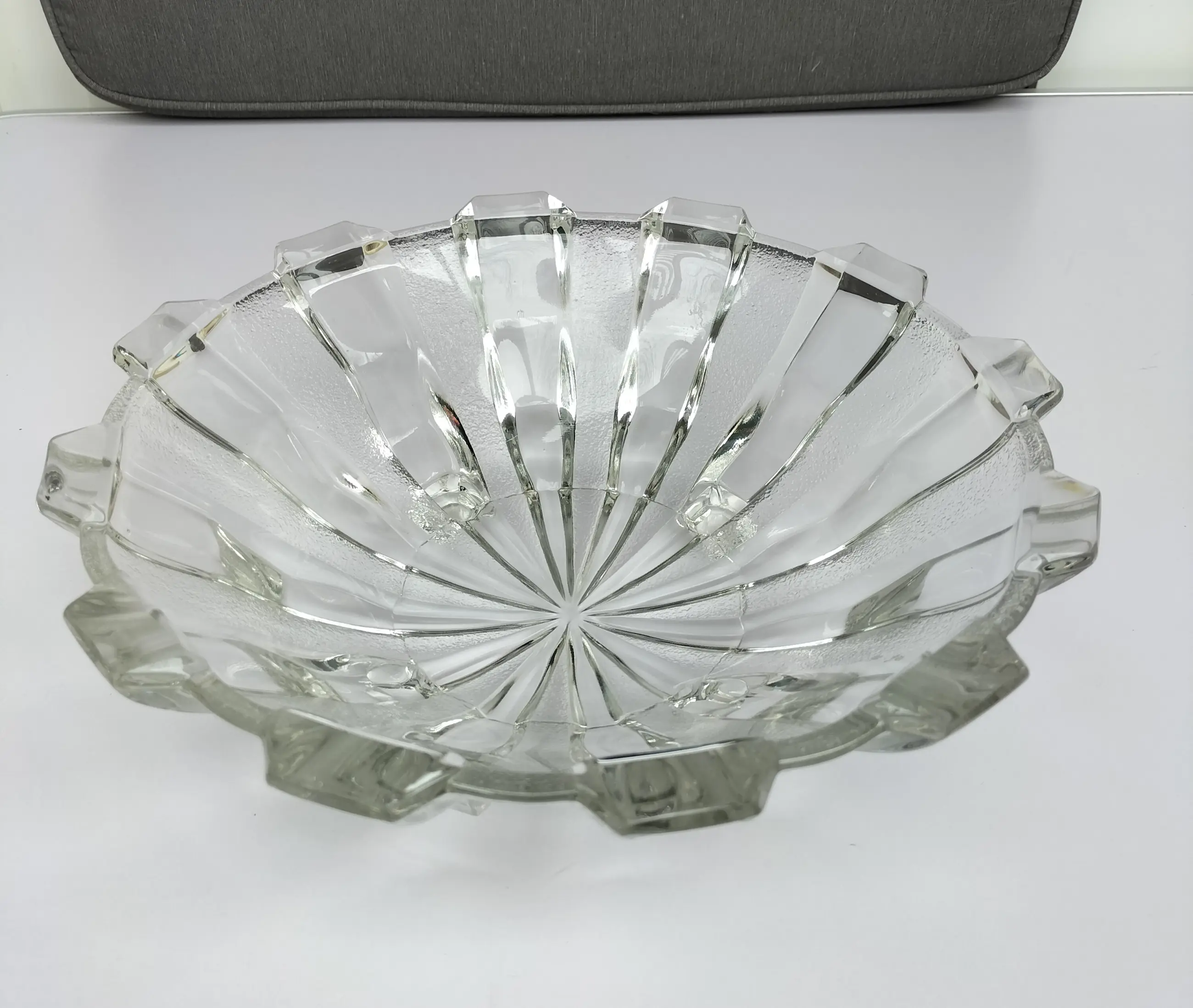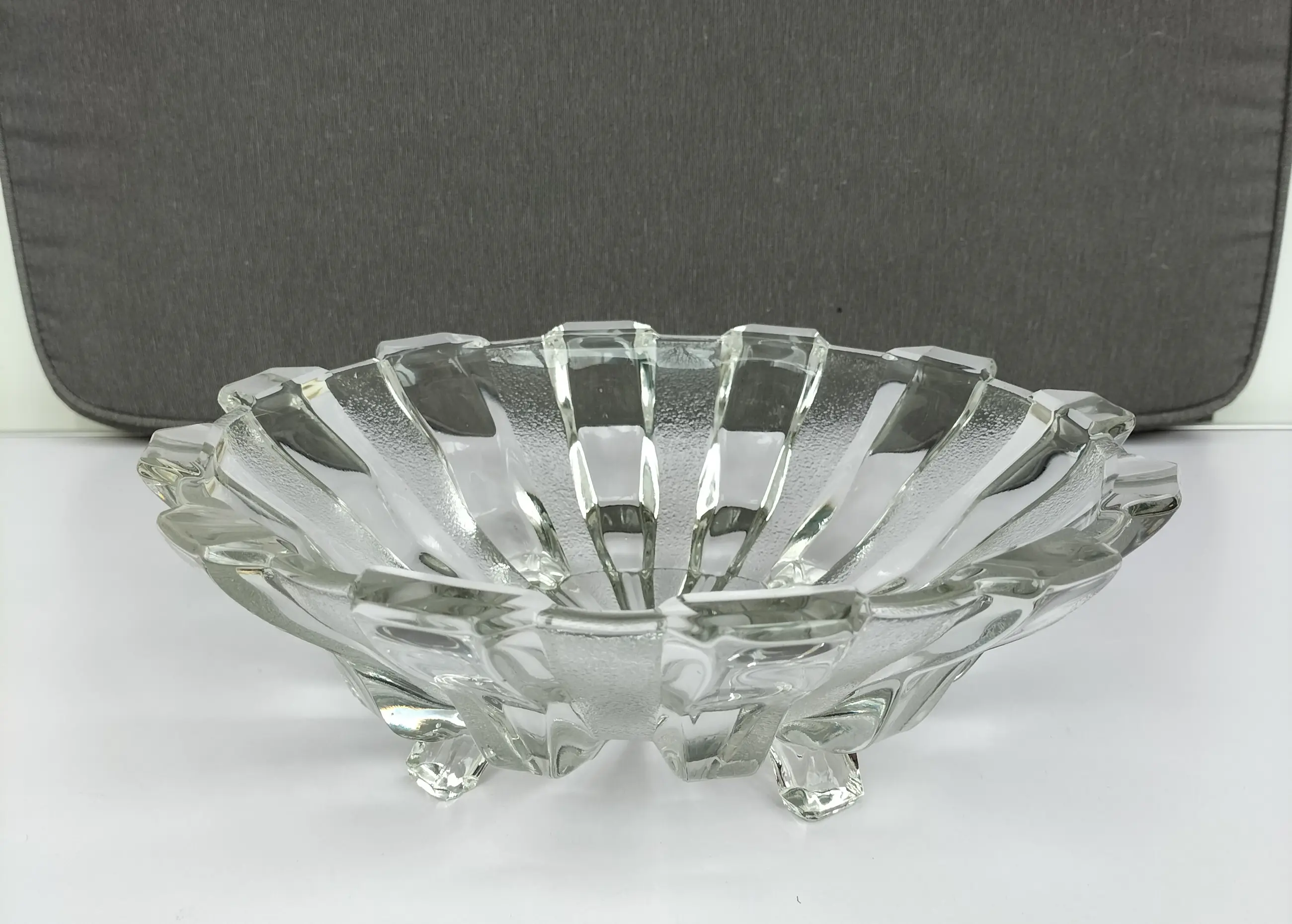 Prachtige zware schaal naar het ontwerp van Carl Stölze (Oostenrijk) , geproduceerd bij de Tsjechische Hermanova Hut fabriek rond 1930. De schaal is rond en wordt gesierd door banen van afwisselend helder en gematteerd geribbeld glas, die onder in een mooie punt samenkomen. De schaal staat op drie pootjes, waarvan er eentje een chip heeft (niet zichtbaar als de schaal staat-zie foto's). Onderop de pootjes zitten zeer lichte gebruikssporen. Verder is de schaal in werkelijk uitstekende staat zonder beschadigingen/krassen. Een zeer fraai object dat met zorg verpakt en verzonden zal worden.