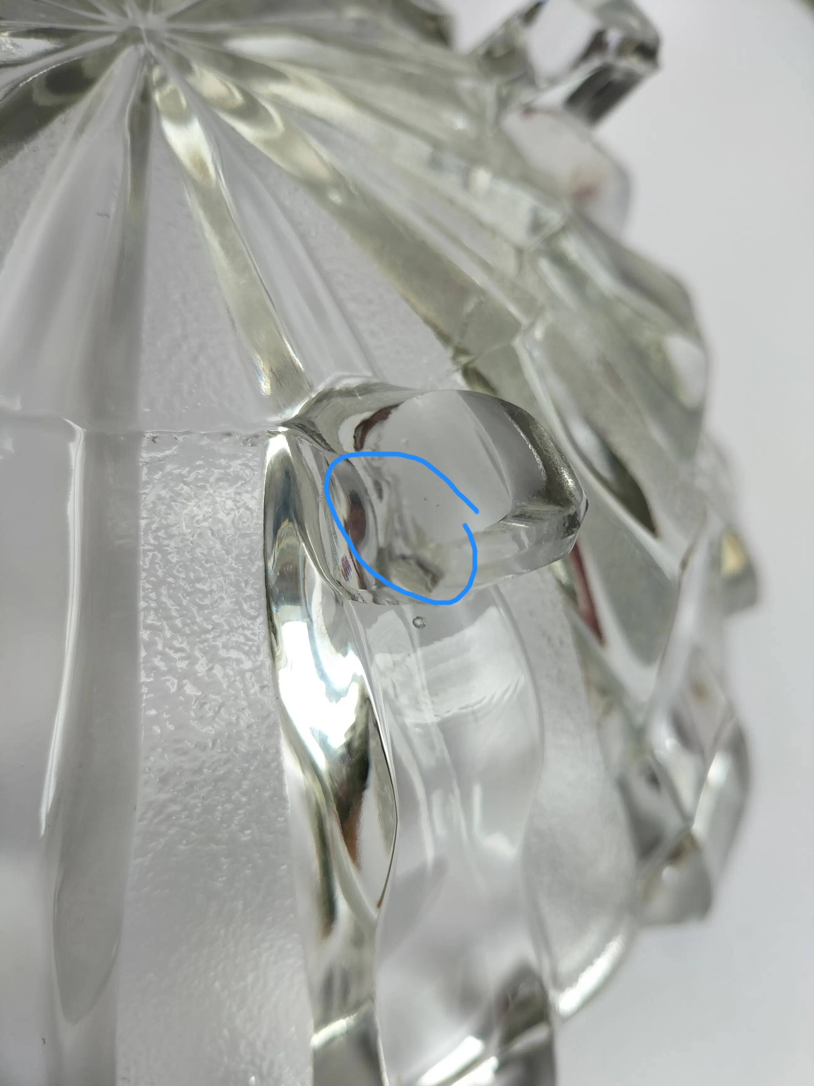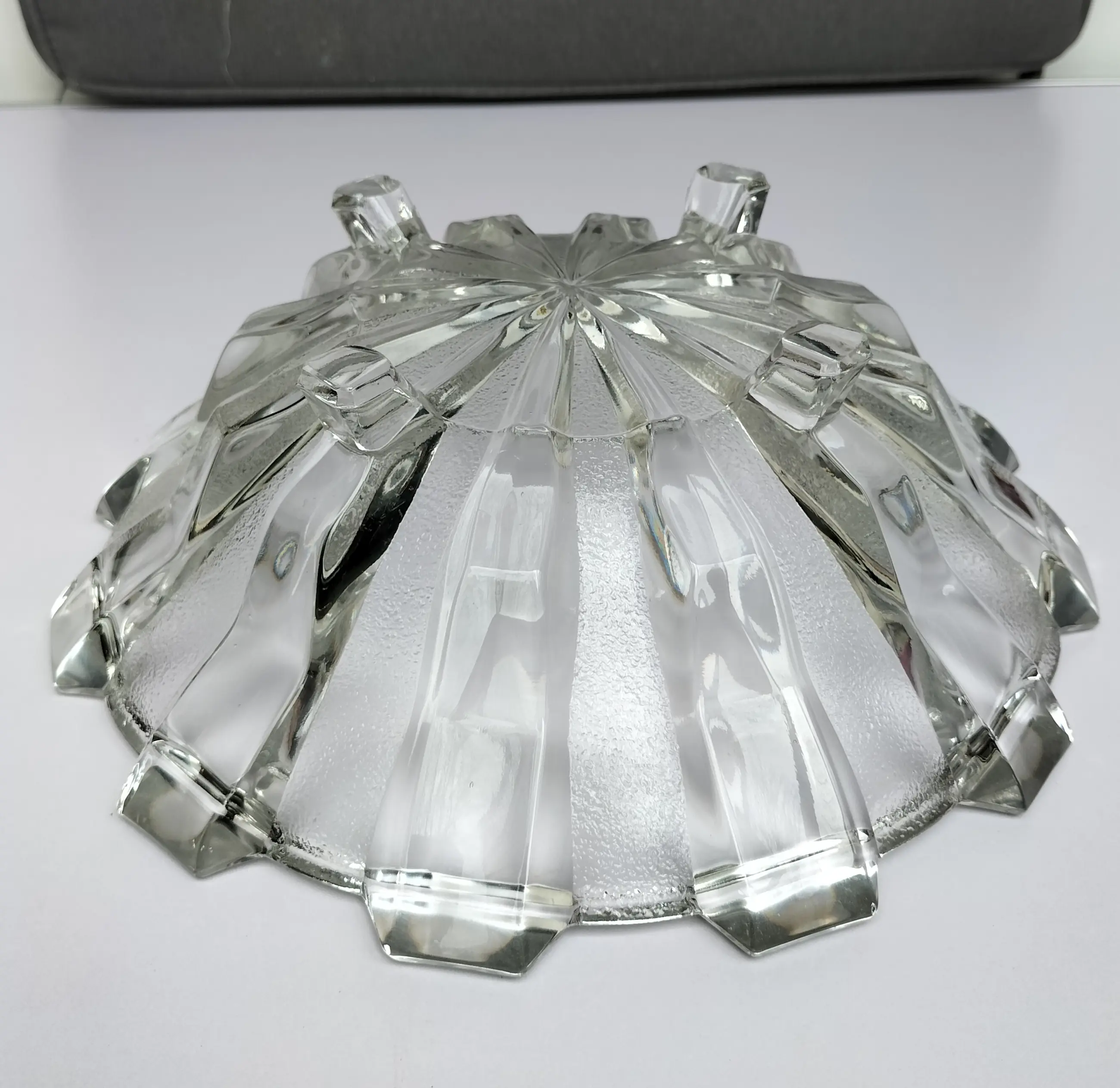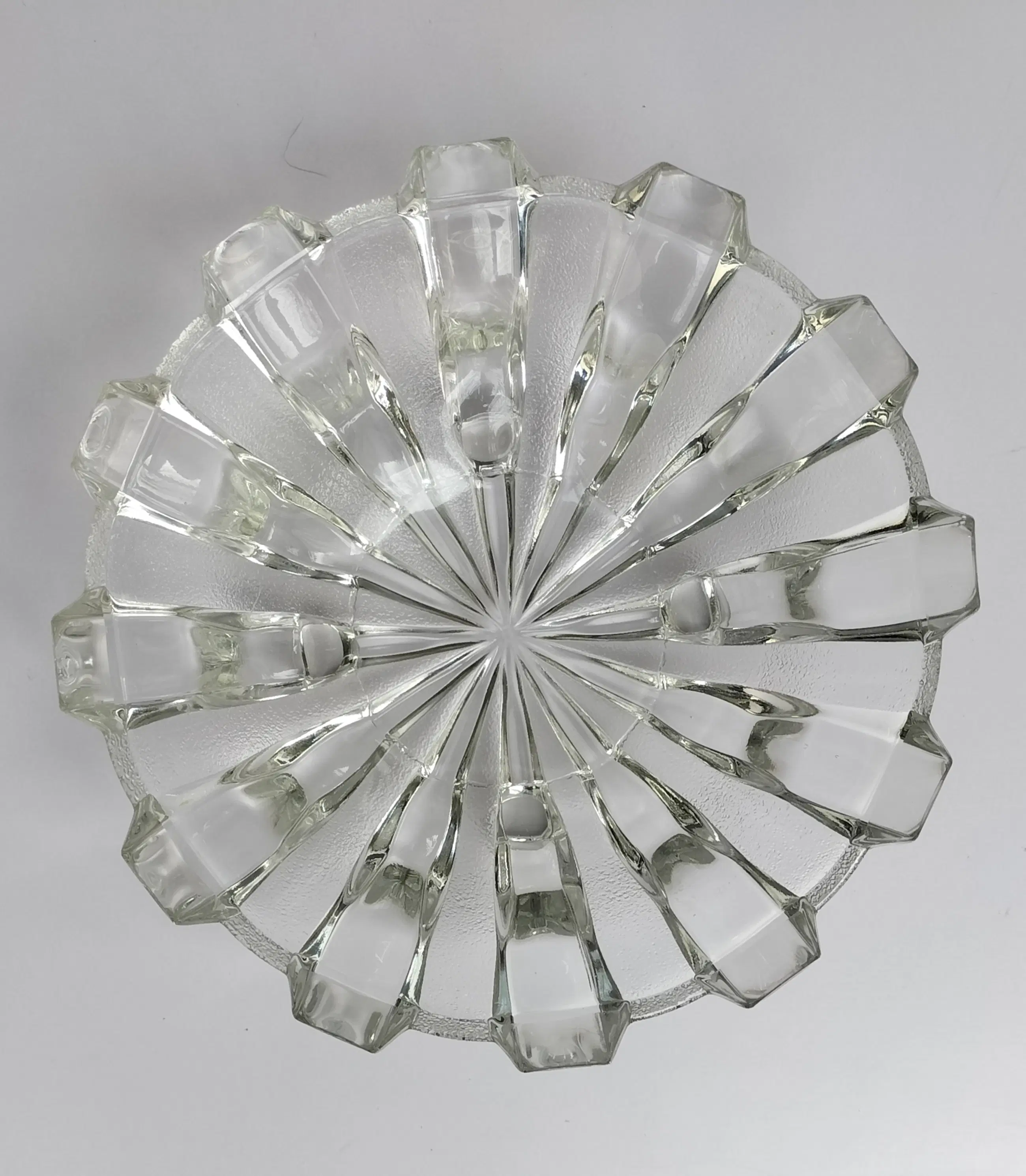 Prachtige zware schaal naar het ontwerp van Carl Stölze (Oostenrijk) , geproduceerd bij de Tsjechische Hermanova Hut fabriek rond 1930. De schaal is rond en wordt gesierd door banen van afwisselend helder en gematteerd geribbeld glas, die onder in een mooie punt samenkomen. De schaal staat op drie pootjes, waarvan er eentje een chip heeft (niet zichtbaar als de schaal staat-zie foto's). Onderop de pootjes zitten zeer lichte gebruikssporen. Verder is de schaal in werkelijk uitstekende staat zonder beschadigingen/krassen. Een zeer fraai object dat met zorg verpakt en verzonden zal worden.