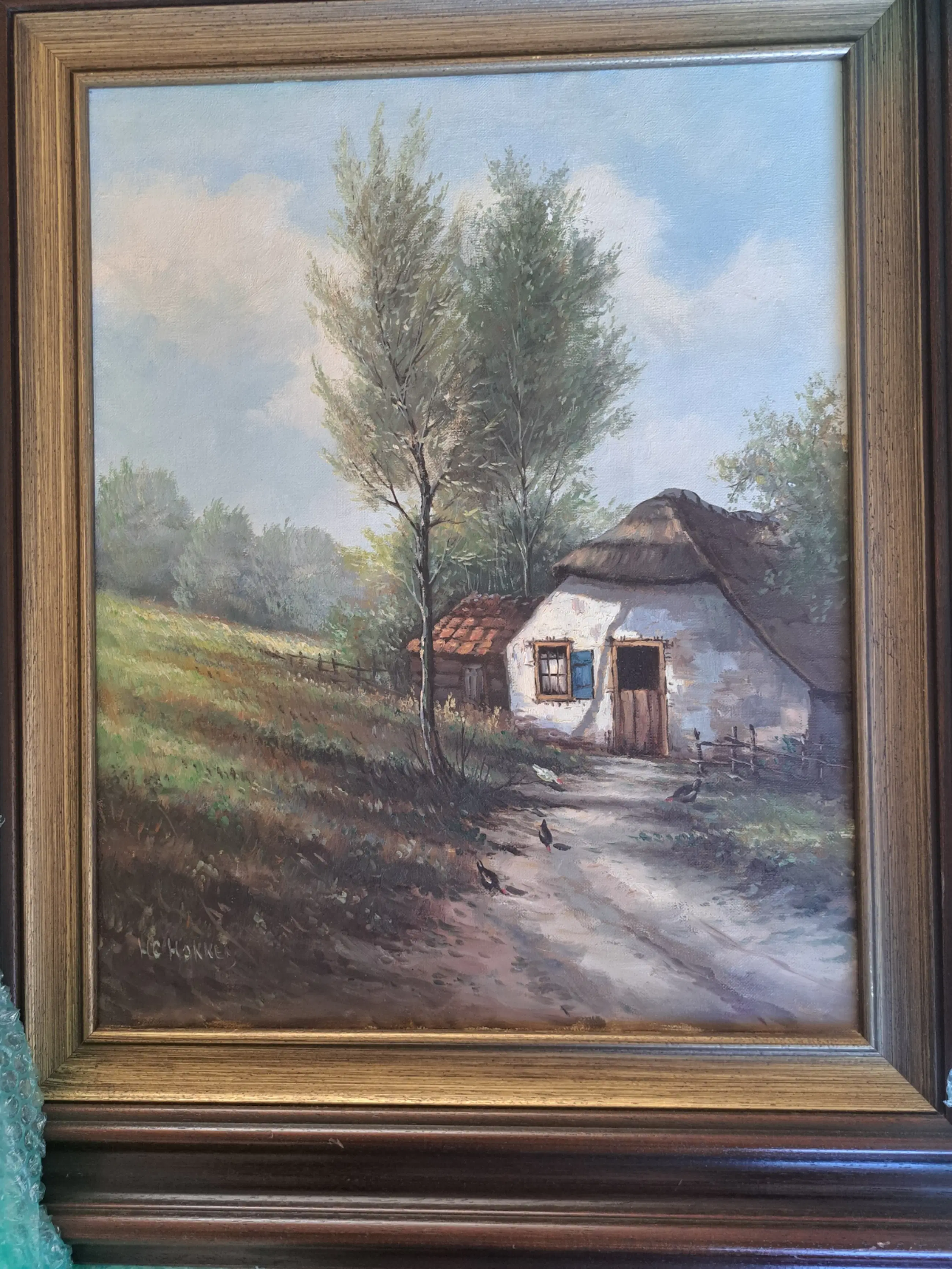 Prachtig olieverfschilderij van de Nederlandse schilder HC Hokker. Het werk toont een rustiek Hollands landschap met een boerderijtje, bomen en een zandpad. Het doek is in uitstekende staat, strak gespannen, zonder scheuren of craquelé. De lijst is netjes en complementeert het schilderij perfect. De achterkant is schoon en origineel. Gesigneerd door HC Hokker.