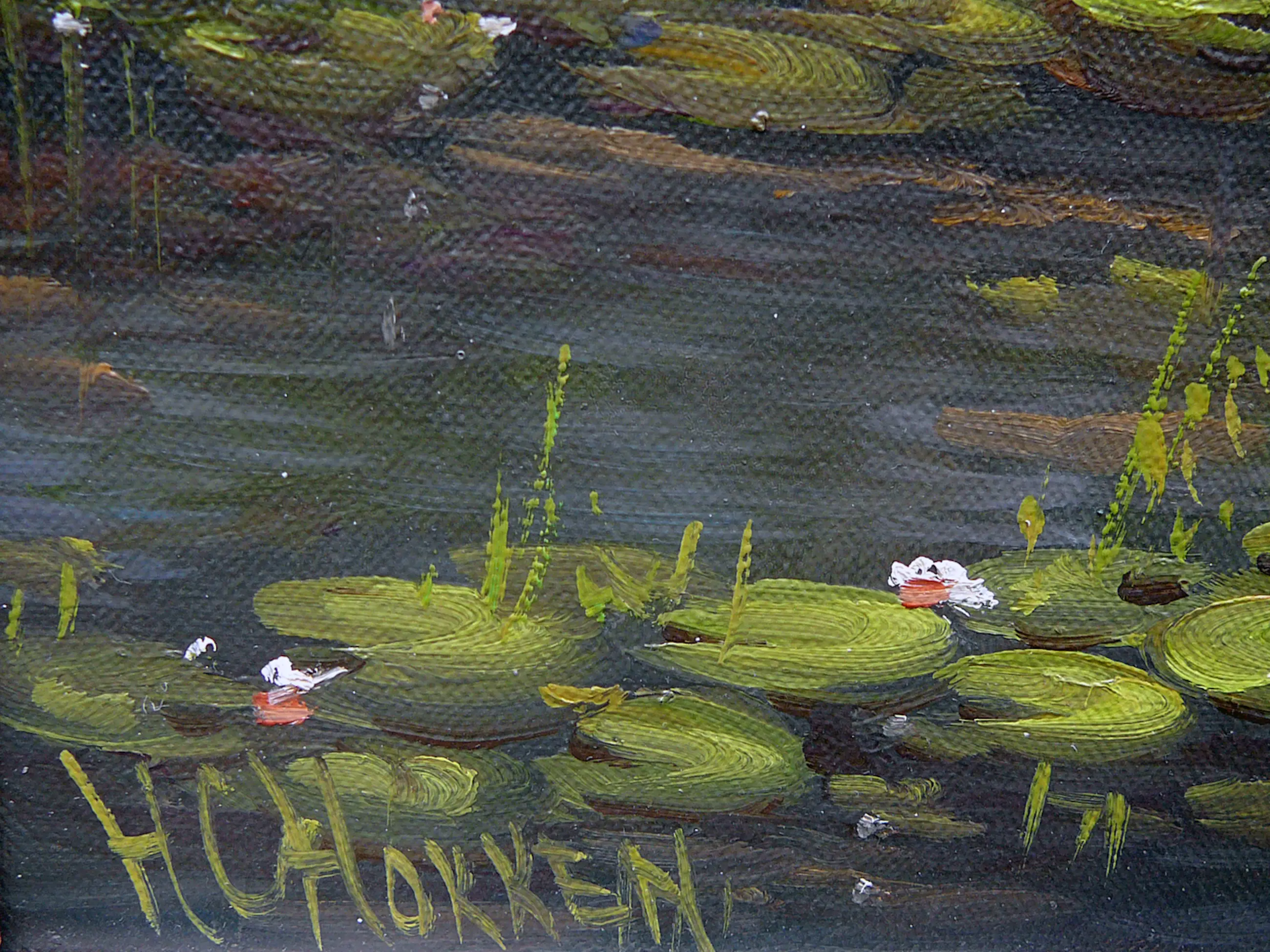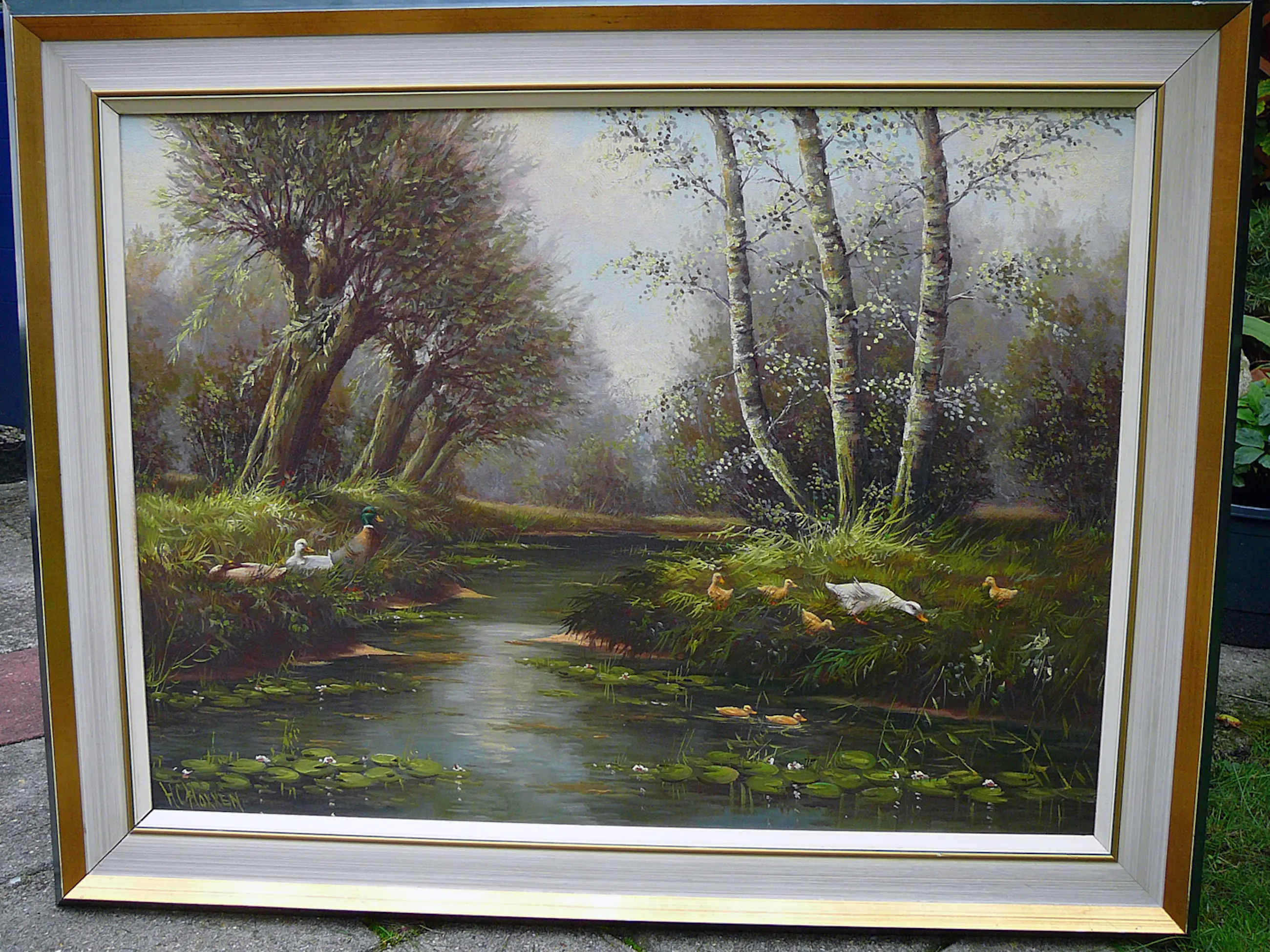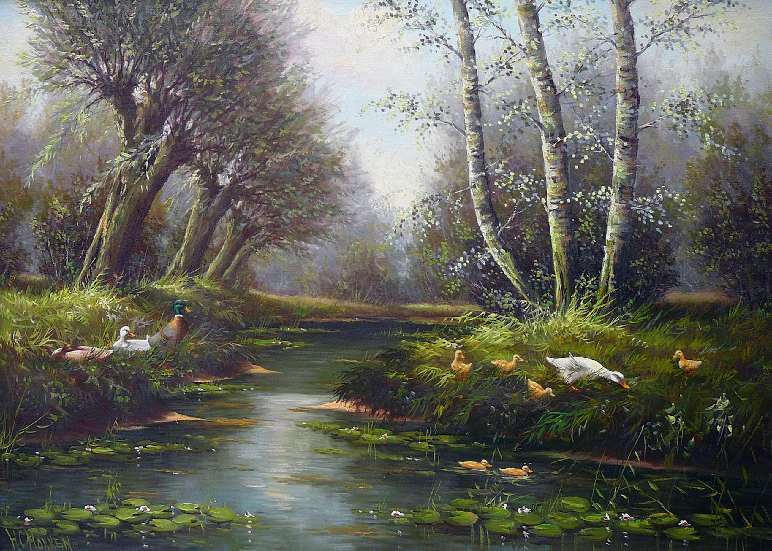 Hermanus Cornelis Hokken was een kunstschilder afkomstig uit Sliedrecht. Hij schilderde vaak bos- en stadsgezichten. Ook zijn eendenschilderijen zijn bekend. Het betreft een olieverf op doek in klassieke lijst. Het doek verkeert in zeer goede staat, lijst met lichte gebruikssporen. Herkomst Kunsthandel Schoonheim, Utrecht. Gezien formaat en kwetsbaarheid uitsluitend af te halen in Utrecht.
