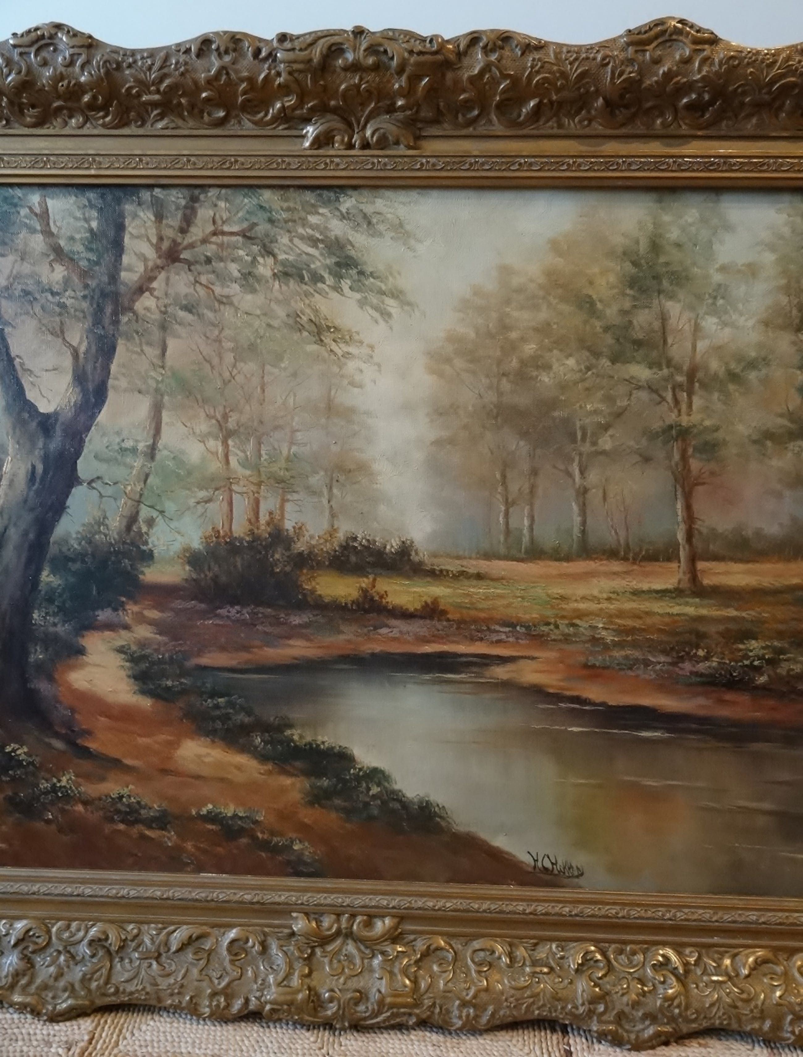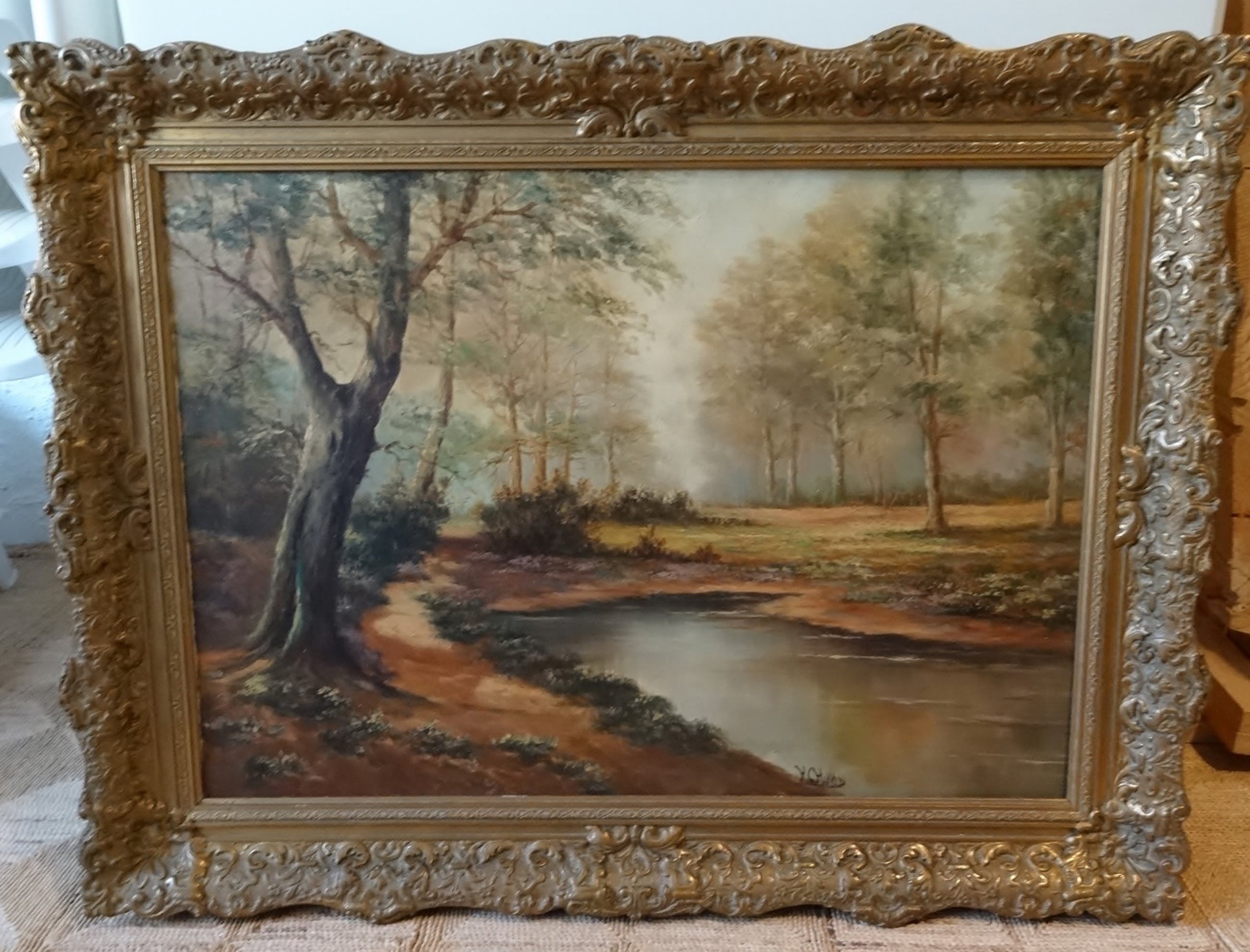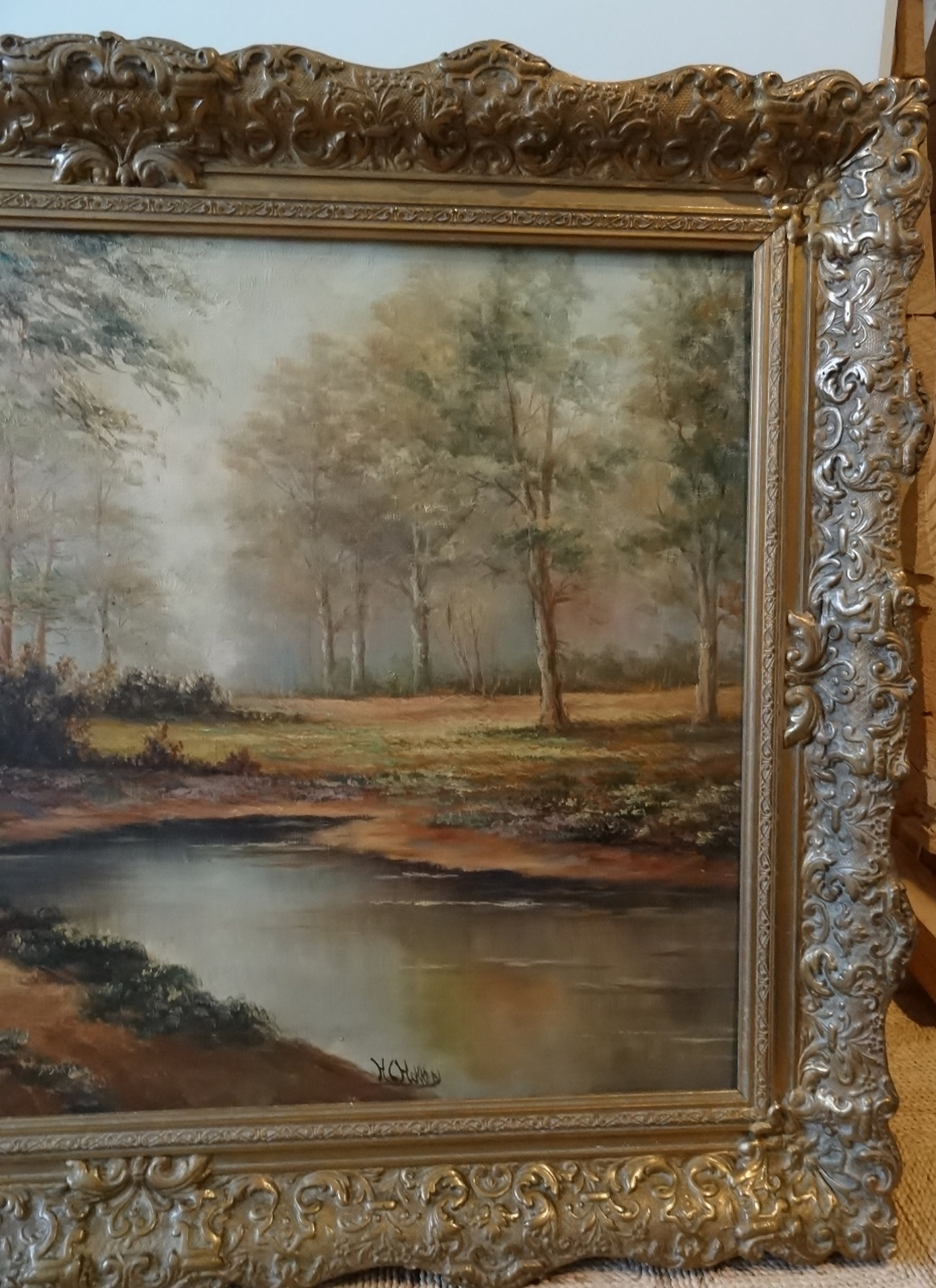 Dit schilderij is een mooi voorbeeld van een bosgezicht van H.C. Hokken. Het schilderij is waarschijnlijk ouder dan 60 jaar en in goede conditie. Hokken is bekend geworden door zijn schilderijen van eendjes en bosgezichten. Hokken had een winkel in Sliedrecht, waar hij werken van zichzelf en andere kunstenaars verkocht. Ook was hij lijstenmaker.