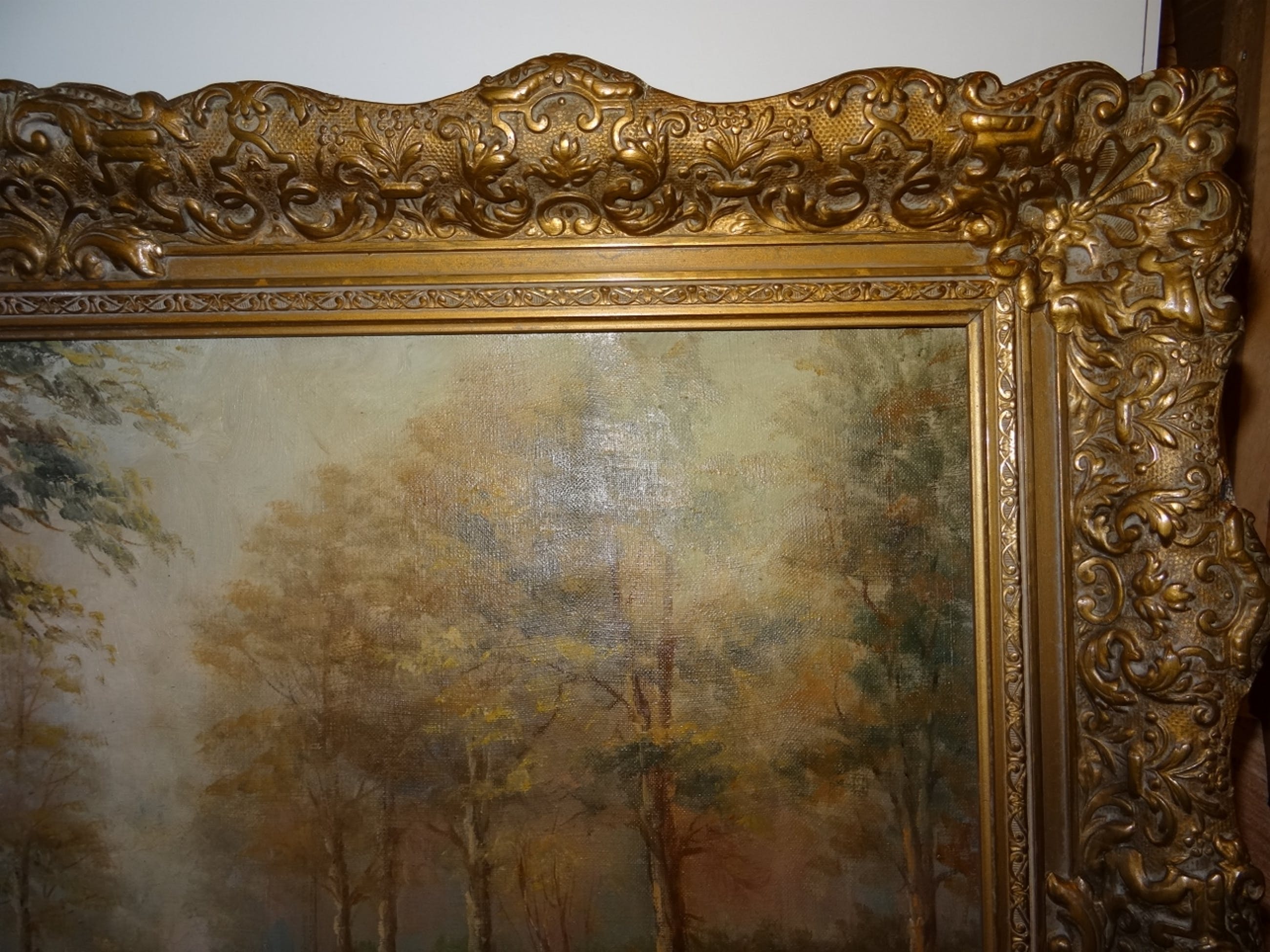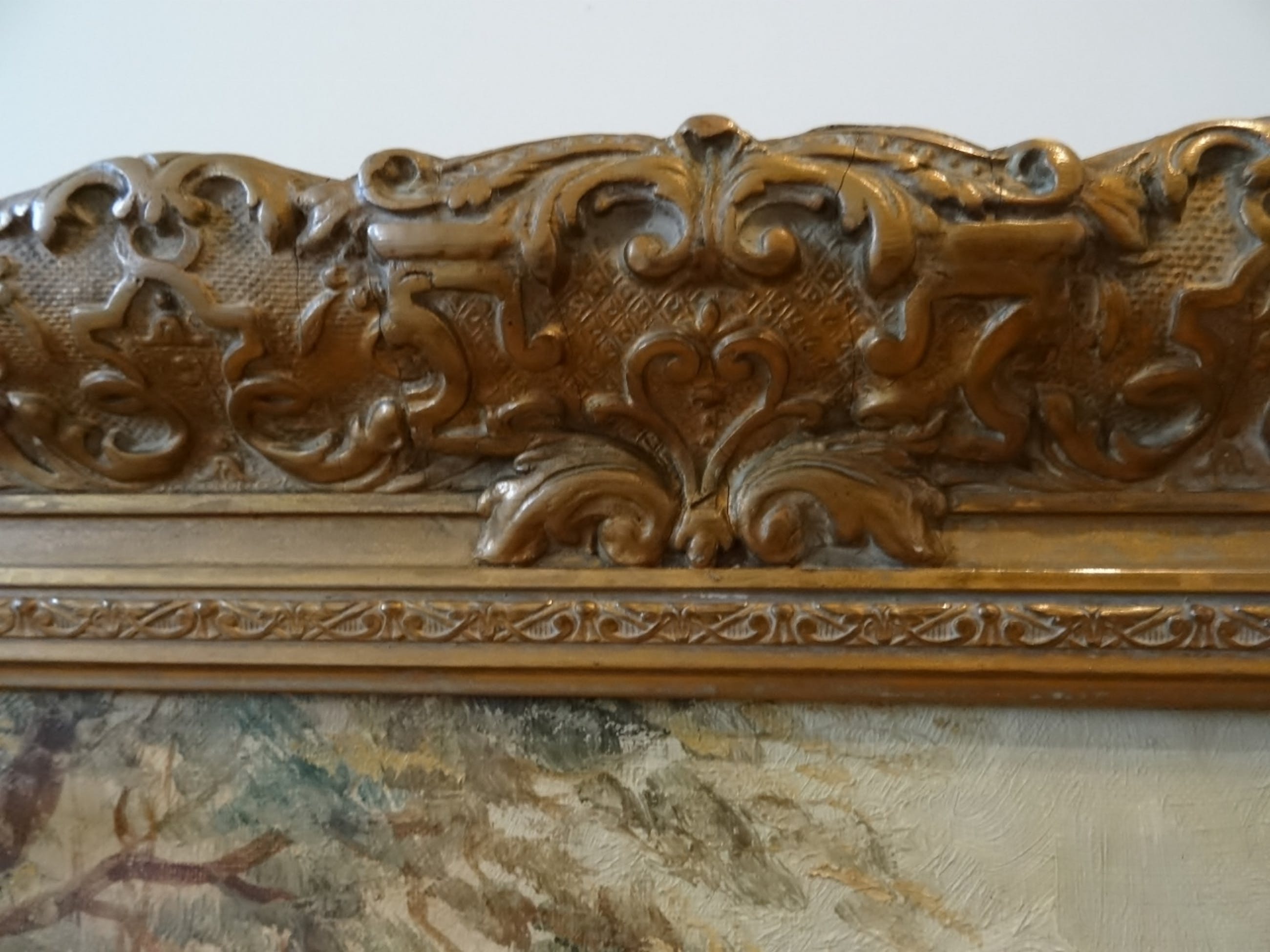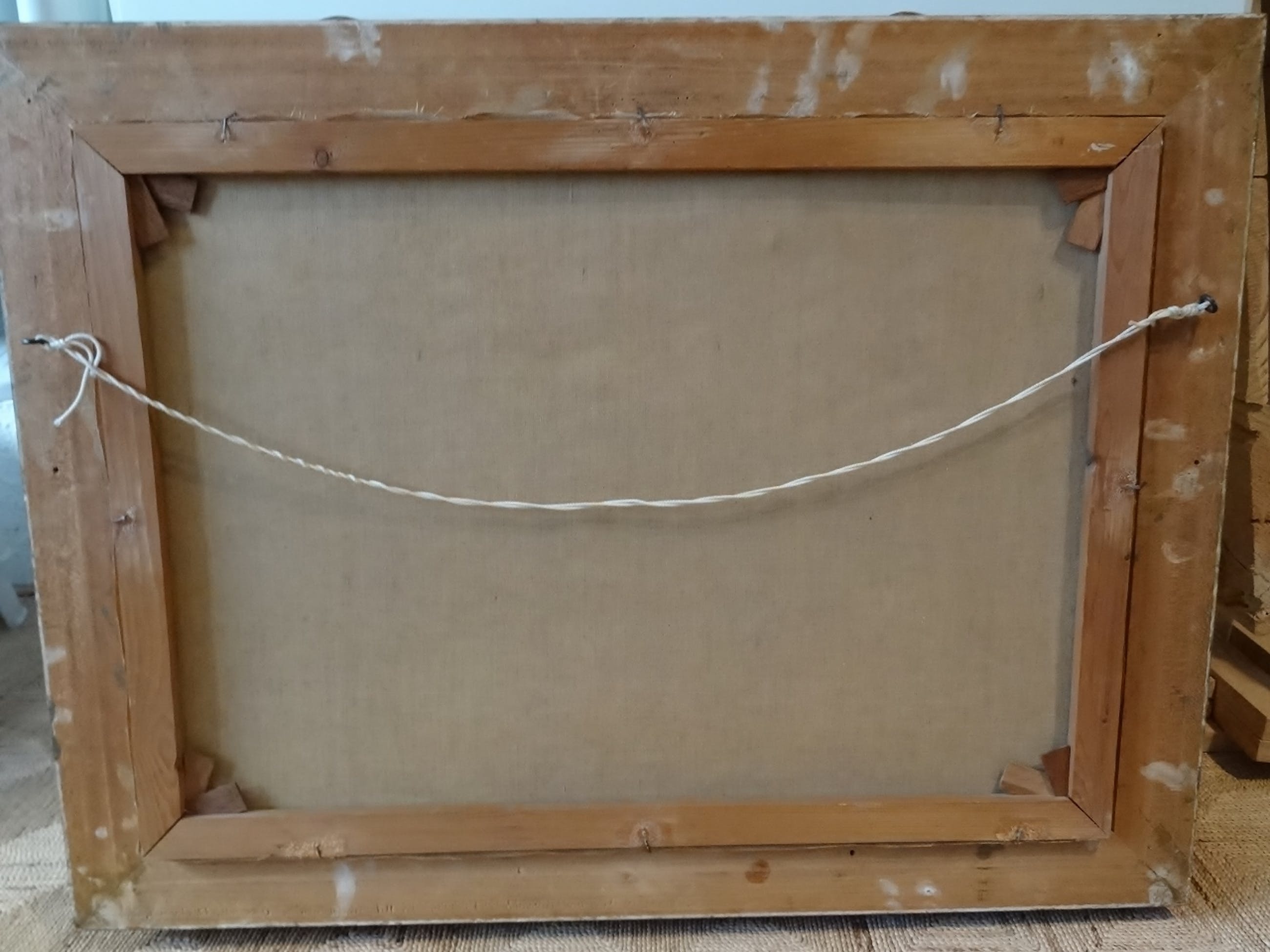 Ik ben geen kenner, maar het schilderij ziet er goed uit. De originele, klassieke lijst, vertoont dunne scheurtjes, die niet doorlopen in de achterkant. Misschien is het schilderij vuil???