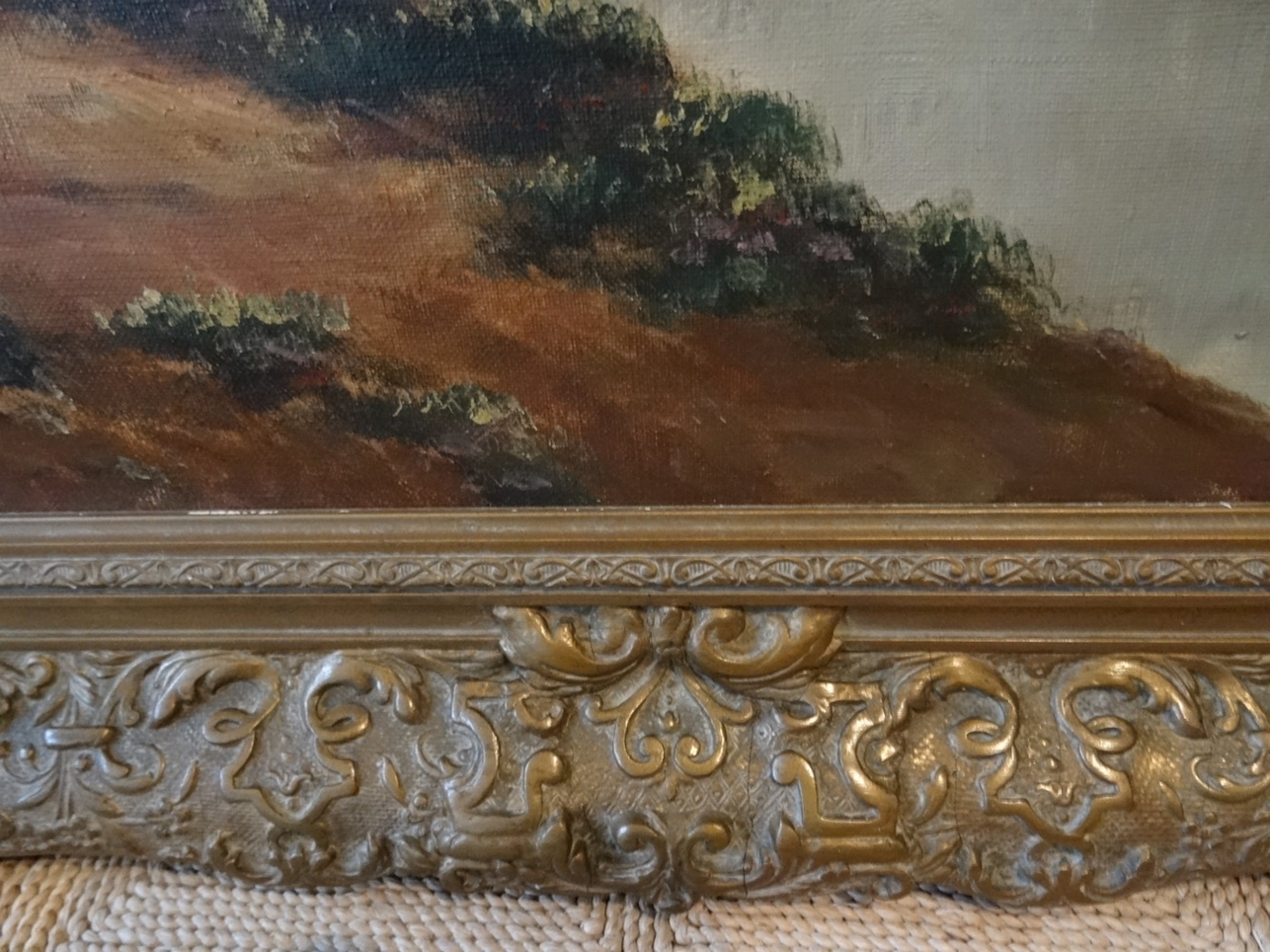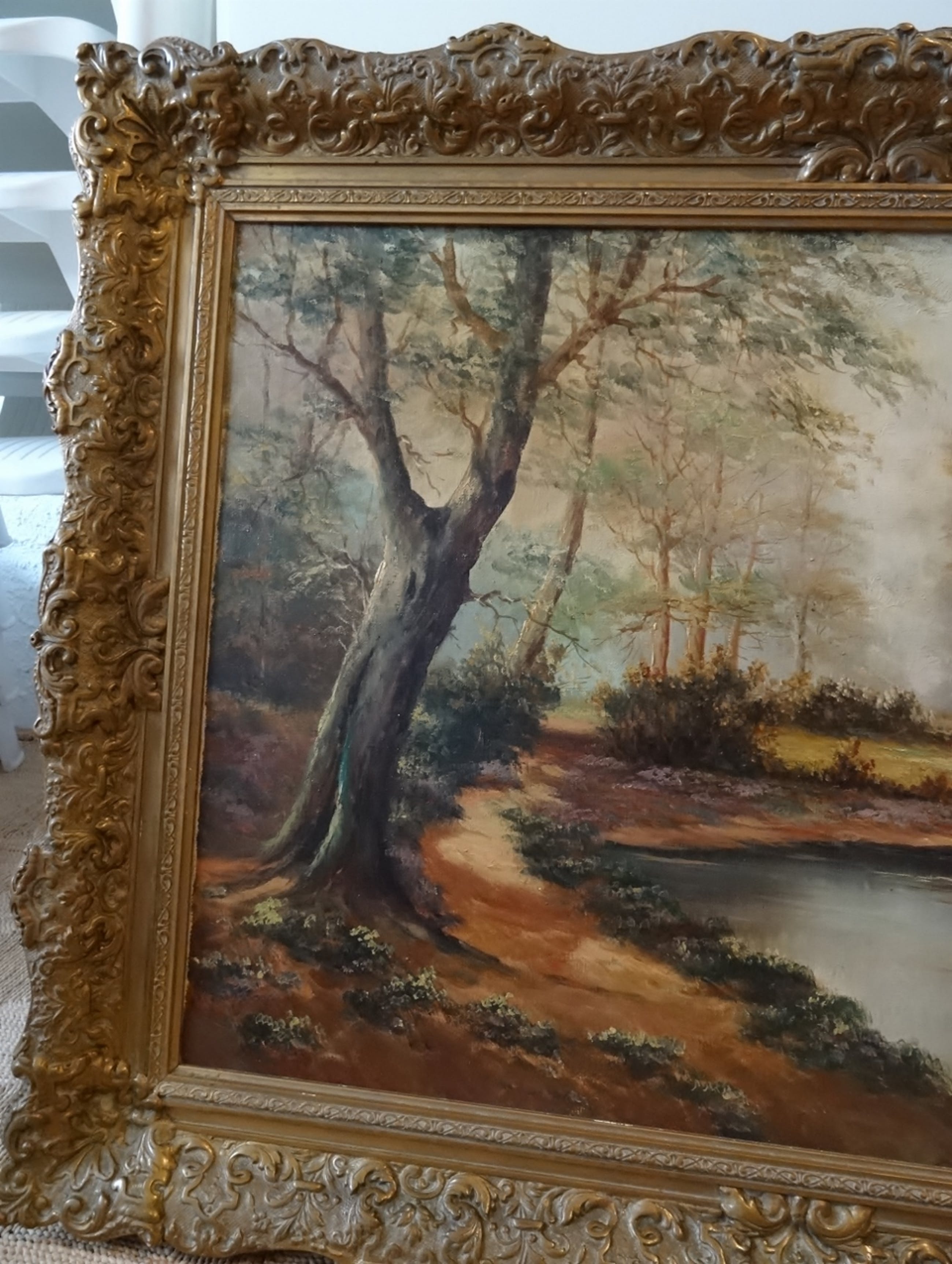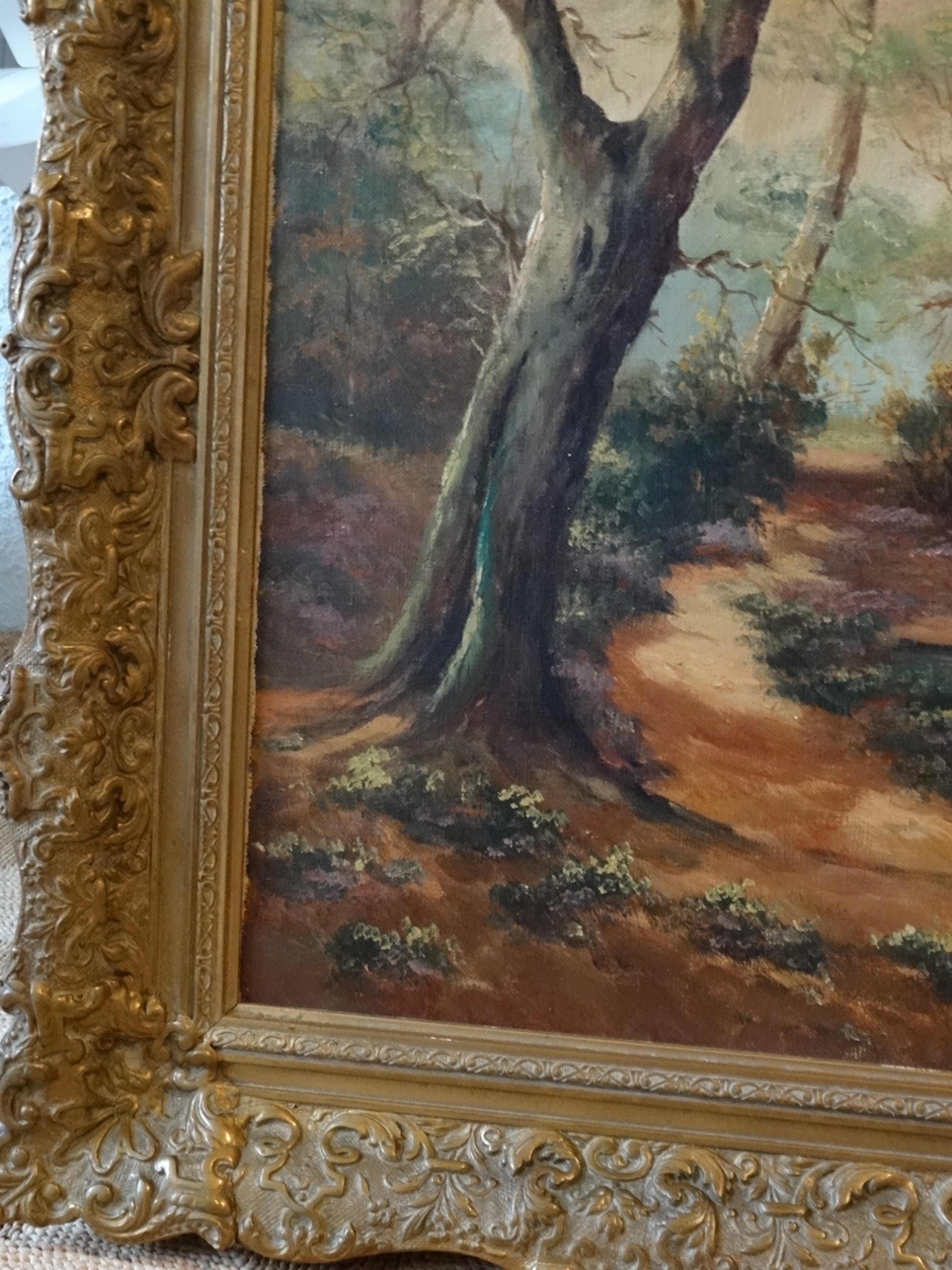 Ik ben geen kenner, maar het schilderij ziet er goed uit. De originele, klassieke lijst, vertoont dunne scheurtjes, die niet doorlopen in de achterkant. Misschien is het schilderij vuil???