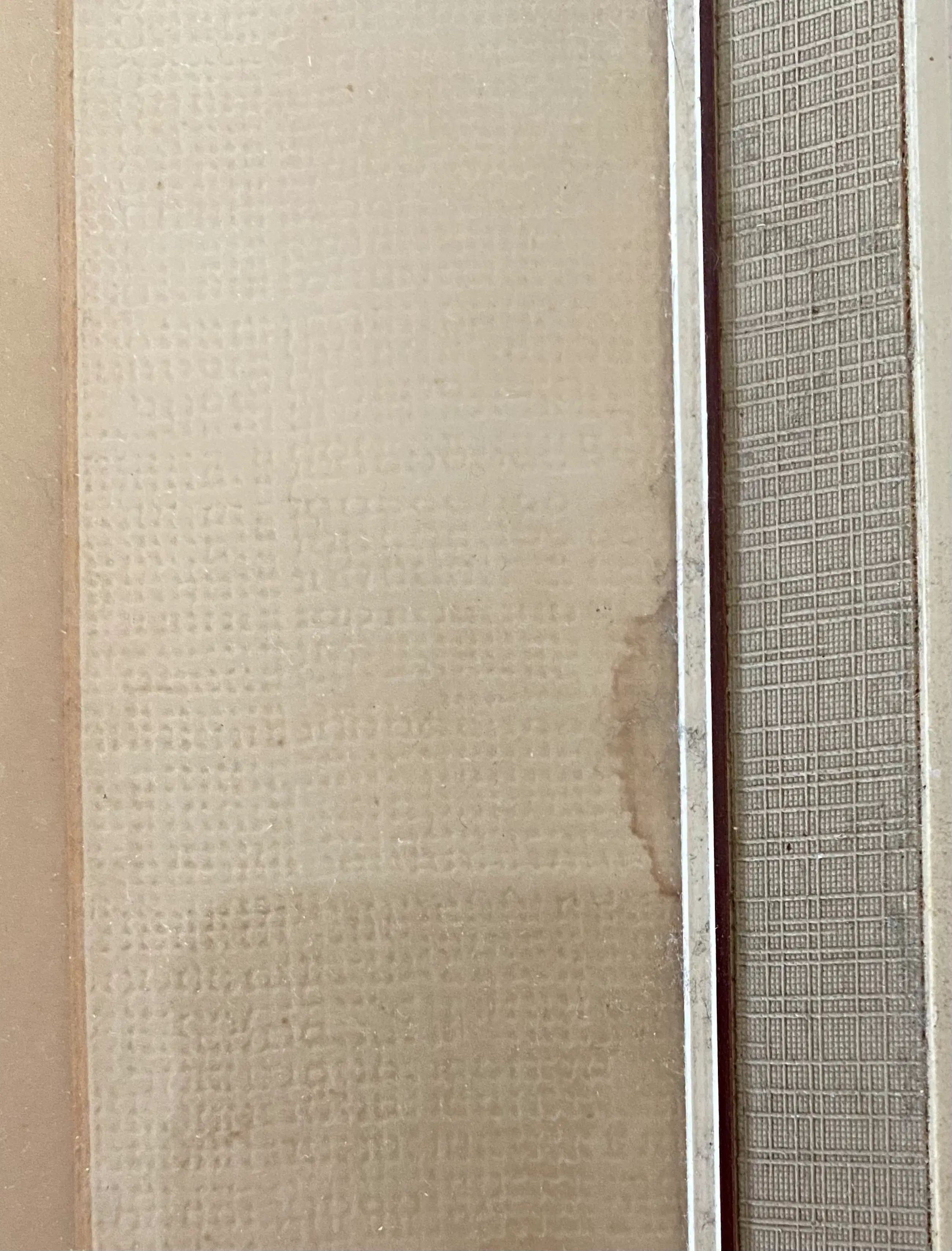 Op de passepartout een watervlek. Het geheel is enigszins vuil en gelig.