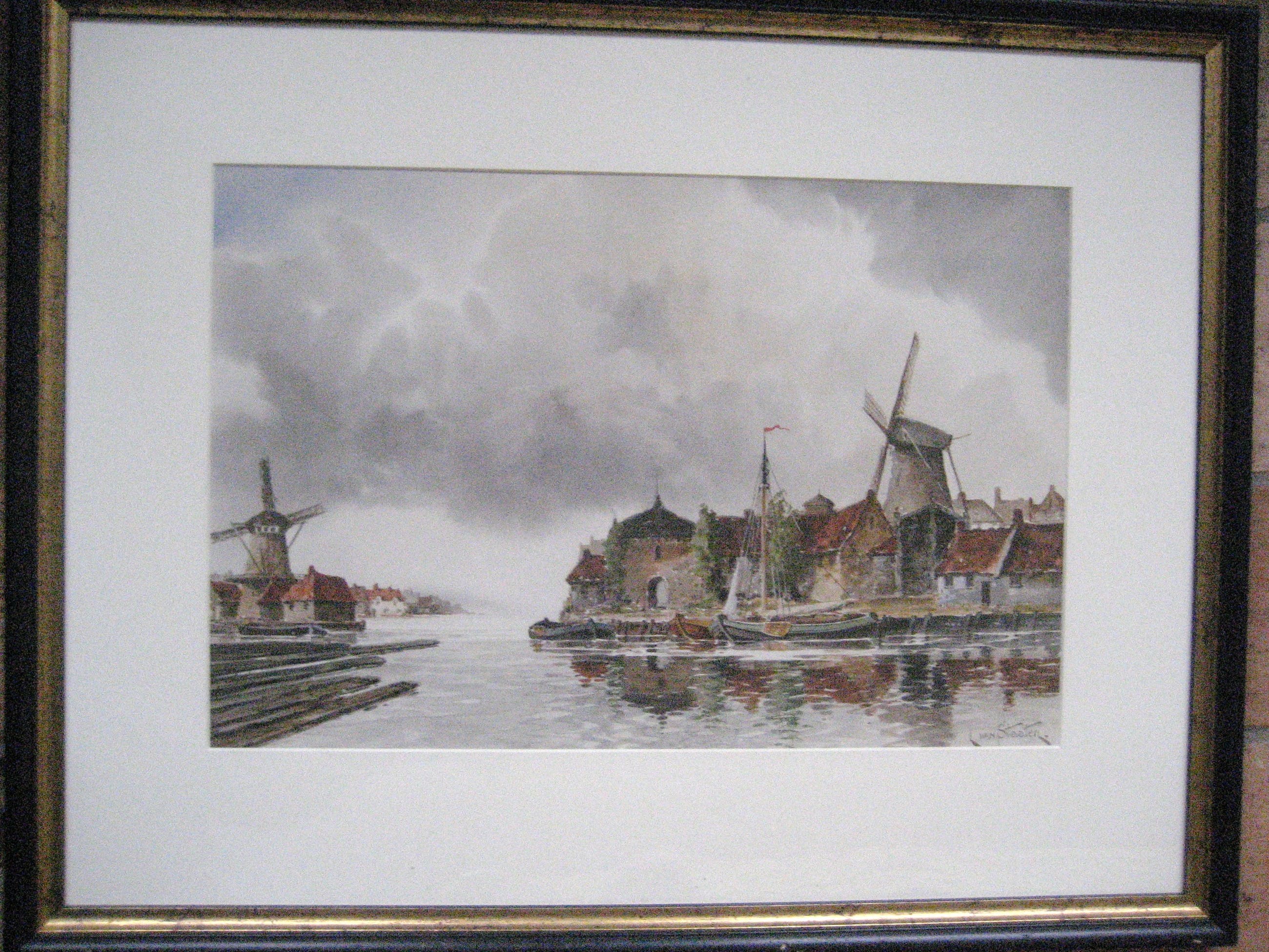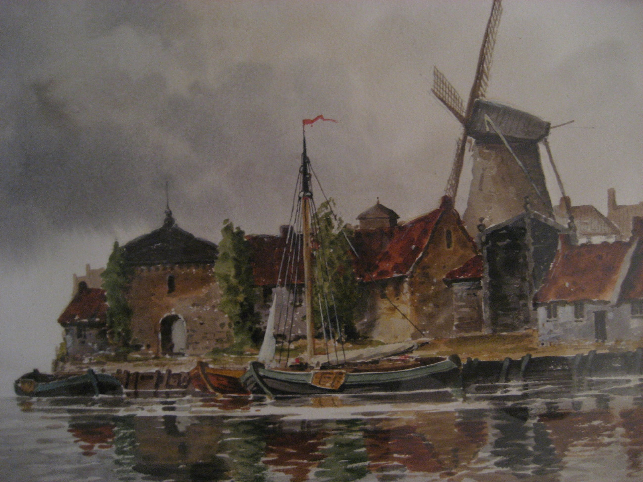 Hermannus Koekkoek II (1836- 1909) Handgesigneerd met pseudonym : L. van Staaten Zeer mooi bewaard gebleven grote aquarel met heldere kleuren. Voorstellende een stad aan het water met 2 molens.Vlaardingen? Het werk is luxe achter glas ingelijst met passepartout en houten lijst met goudrand