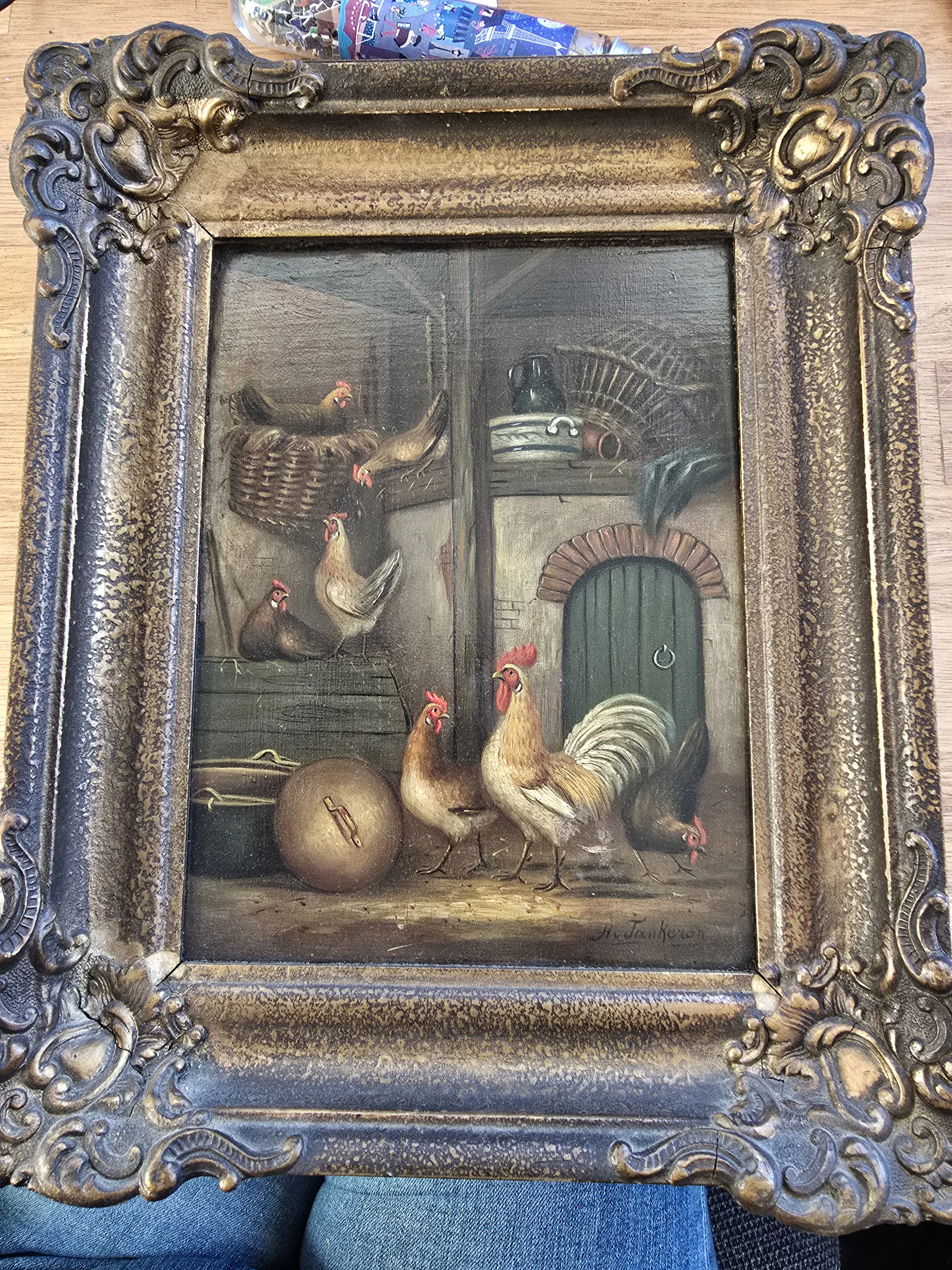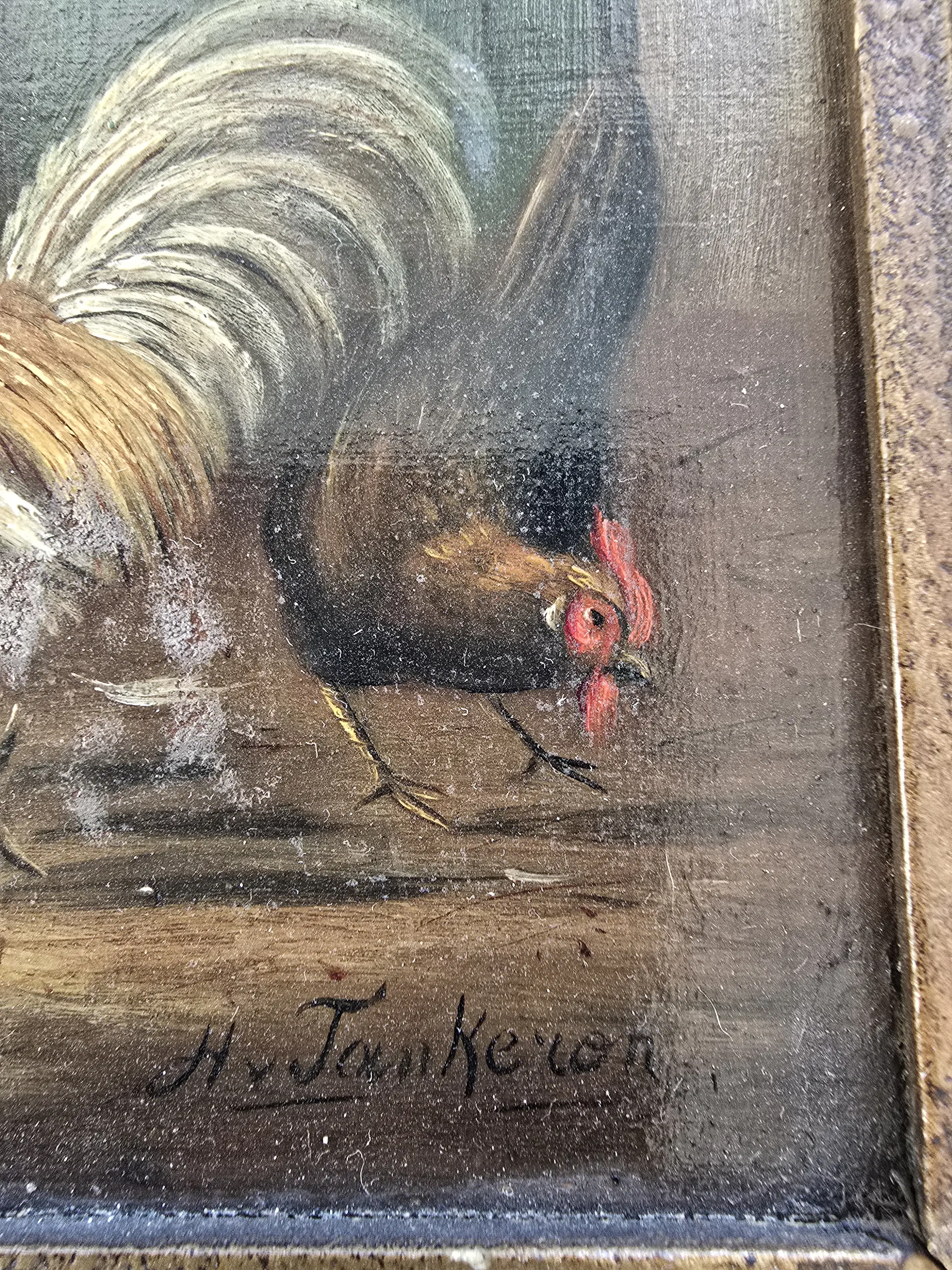 Leuk kippen schilderij van Hermanus van Tankeren. Lijst wat minimale gebruiksporen. Conditie paneel: heel goed