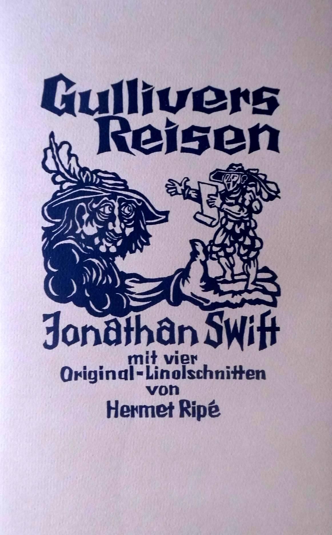 4 orig. Holzschnitte auf Bütten im Faltblatt. Titel: Gullivers Reisen, Blattgröße ca. 17,5 x 29 cm, Stockgrößen : verschieden.Der letzte Holzschnitt ist handsigniert. Edition: Curt Visel, Memmingen, 1976. Auflage dieser Version: 400 Ex. 16. Sonderdruck : J. Swift, 4. Kapitel " Gullivers Reise nach Liliput " Versand als vers. Paket für 6 Euro oder wahlweise als Einschreibebrief für 3,50 Euro