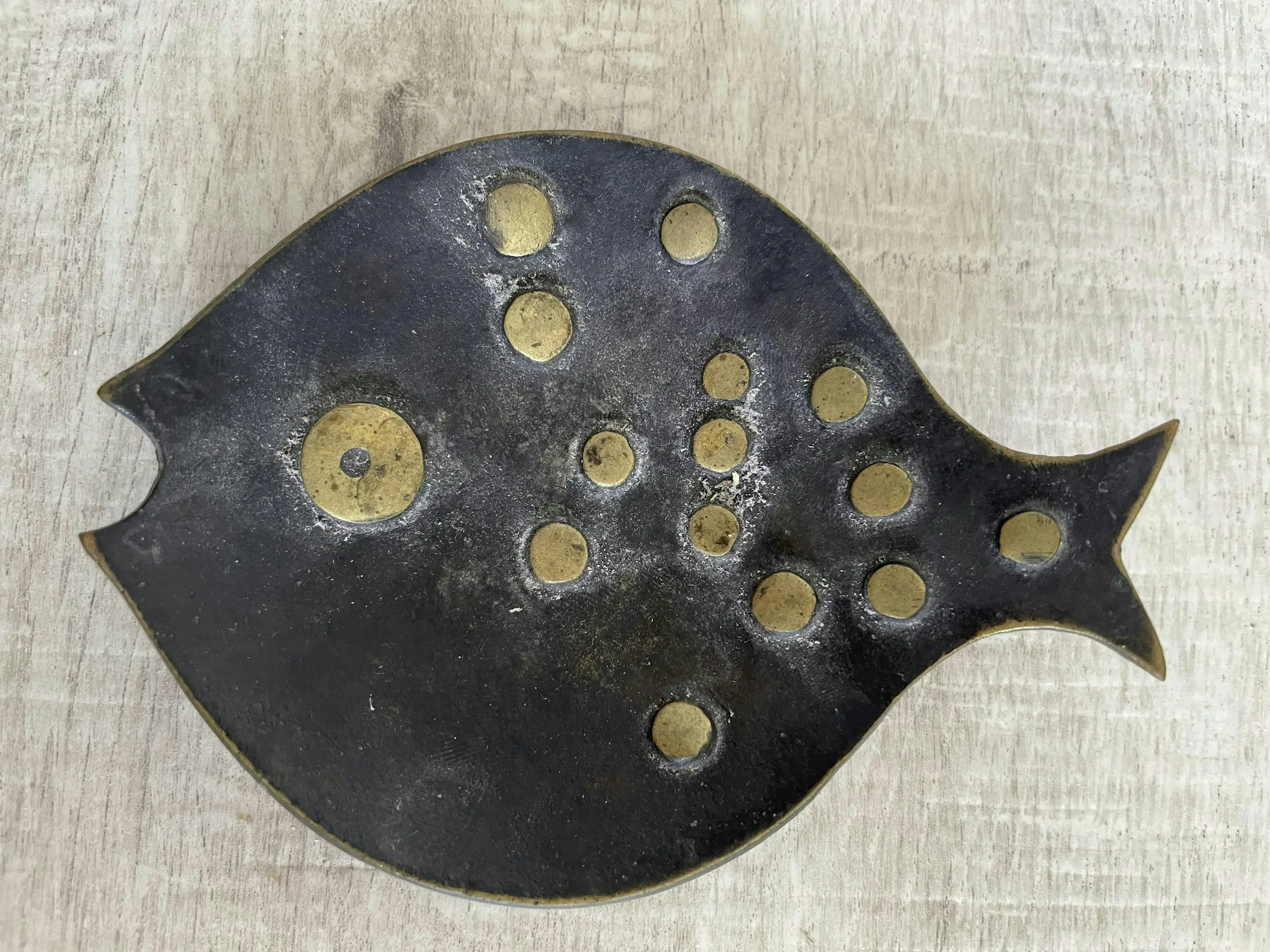 Middeleeuwse moderne Walter Bosse Herta Baller Oostenrijkse messing visasbak, visschotel, visbord 1950