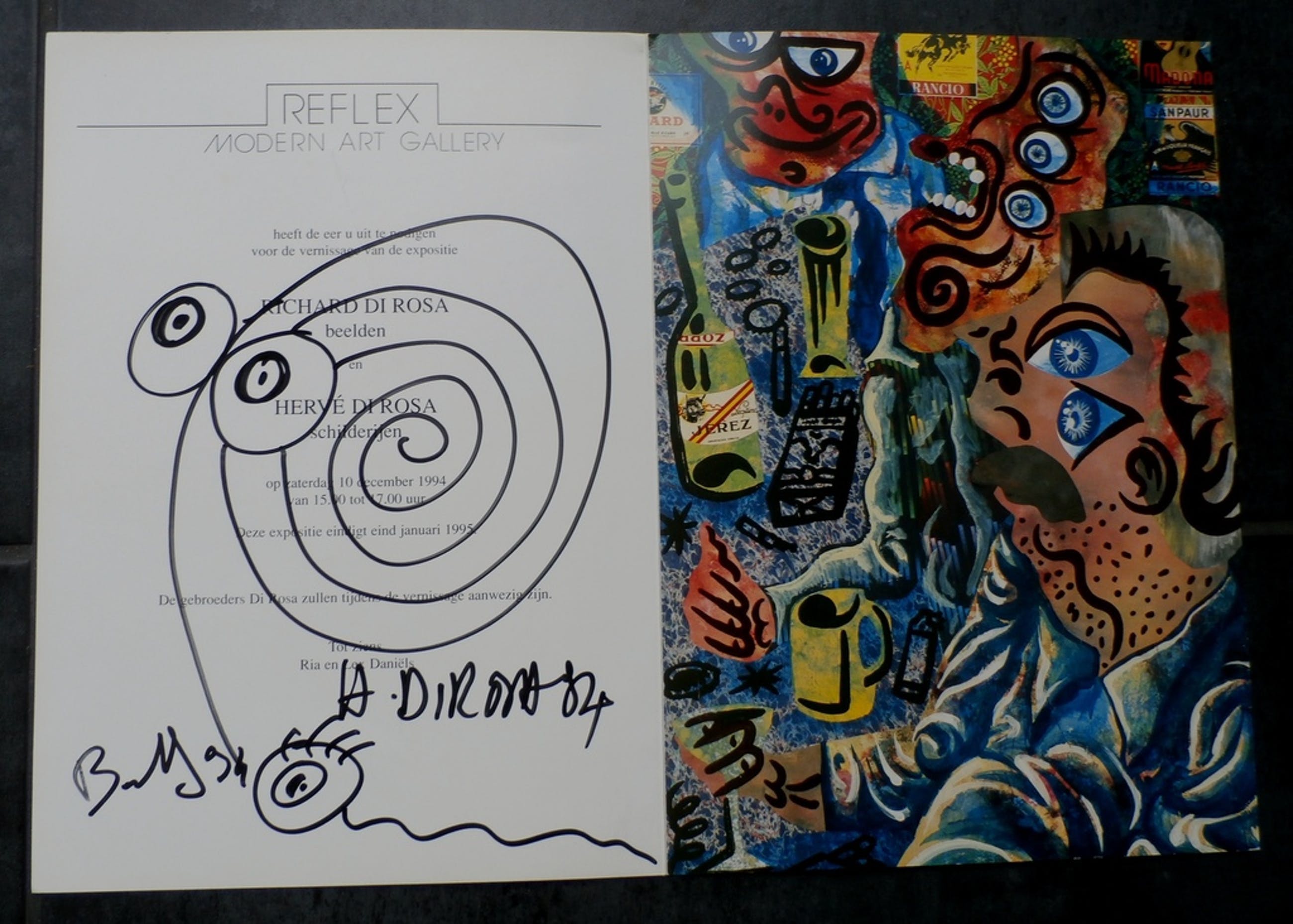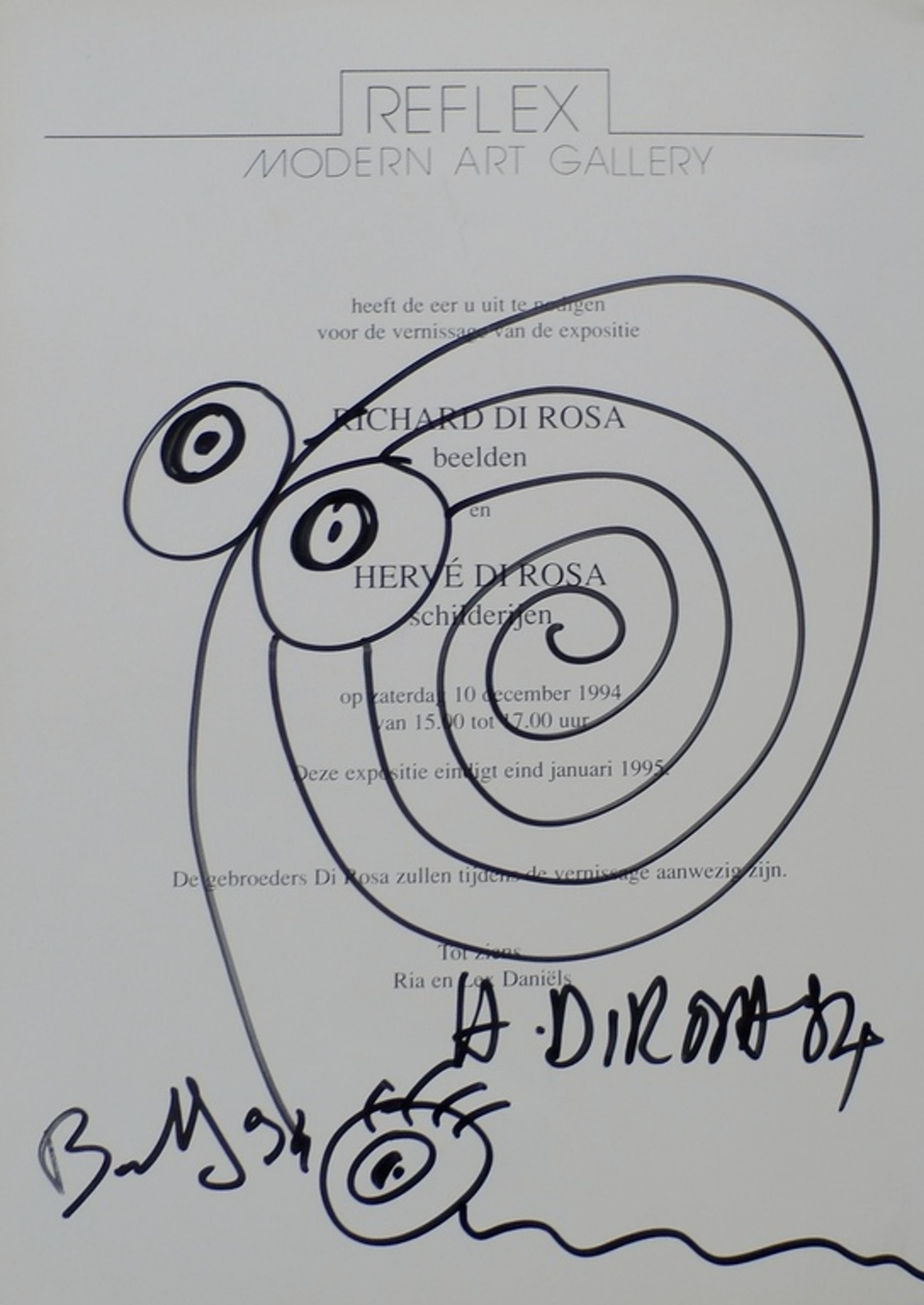 Tekening op tentoonstellings uitnodiging van Herve di Rosa. Afmetingen blad: h30 x b21 cm. Binnenin gesigneerd door de kunstenaar. De authenticiteit van dit werk wordt volledig gegarandeerd. Een certificaat van echtheid kan, op aanvraag, worden gemaild.
