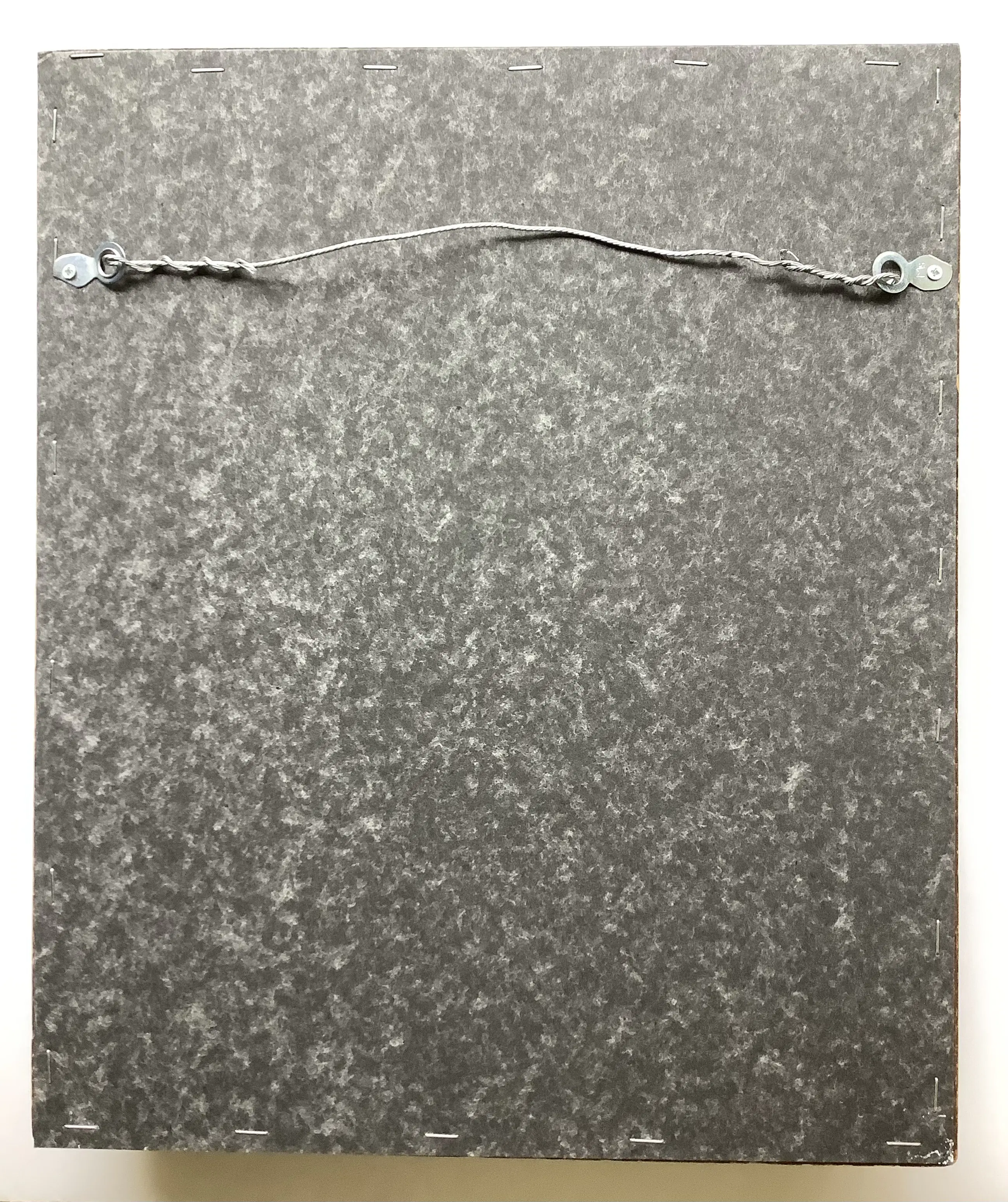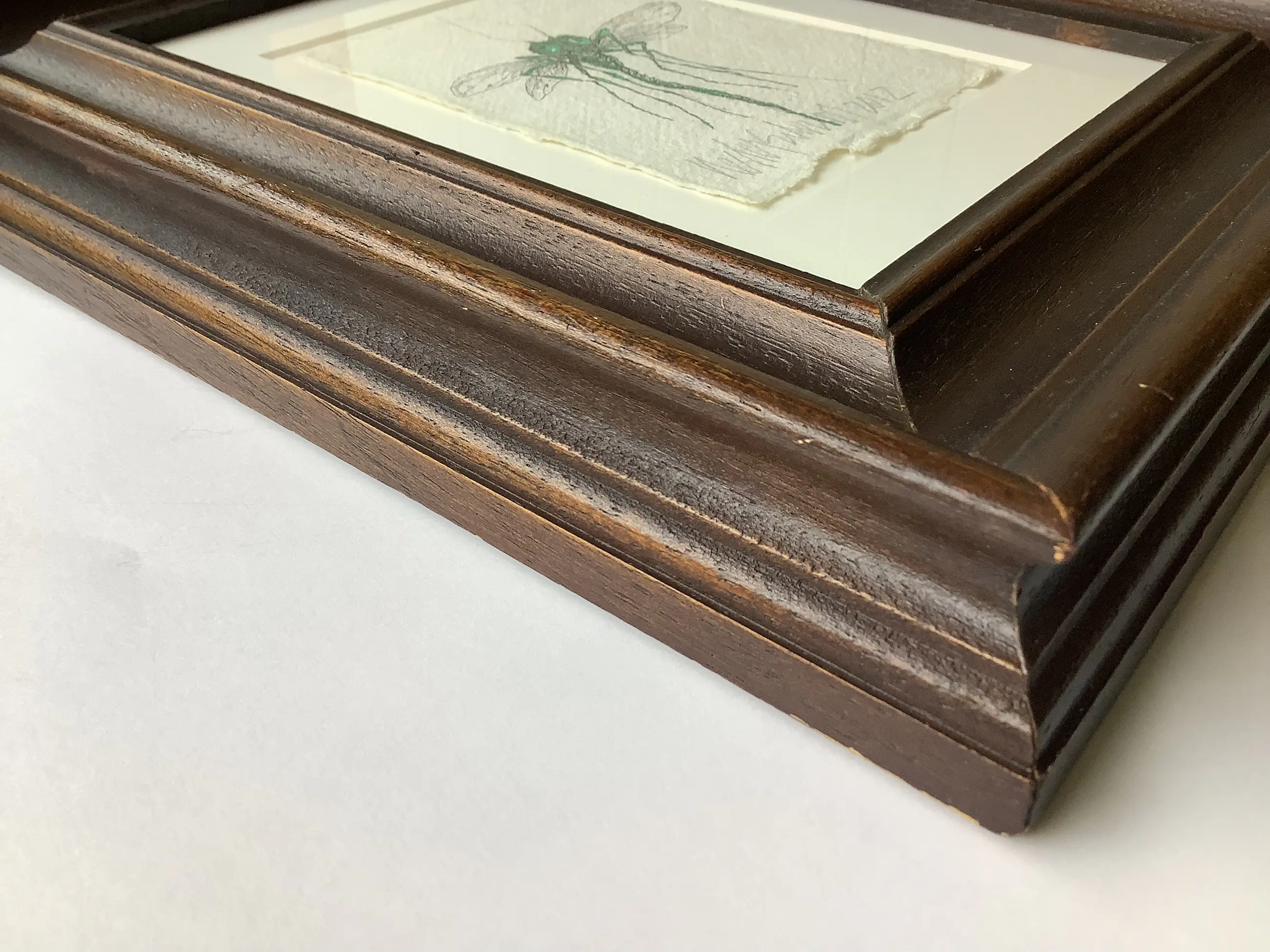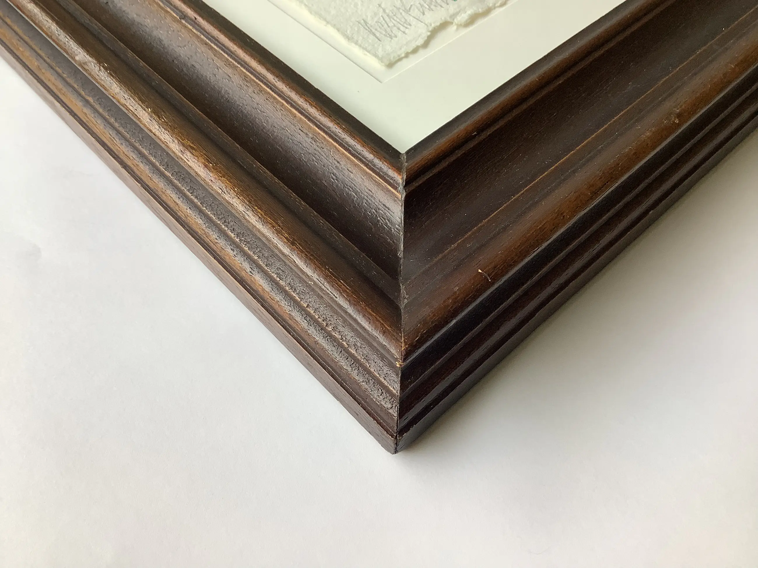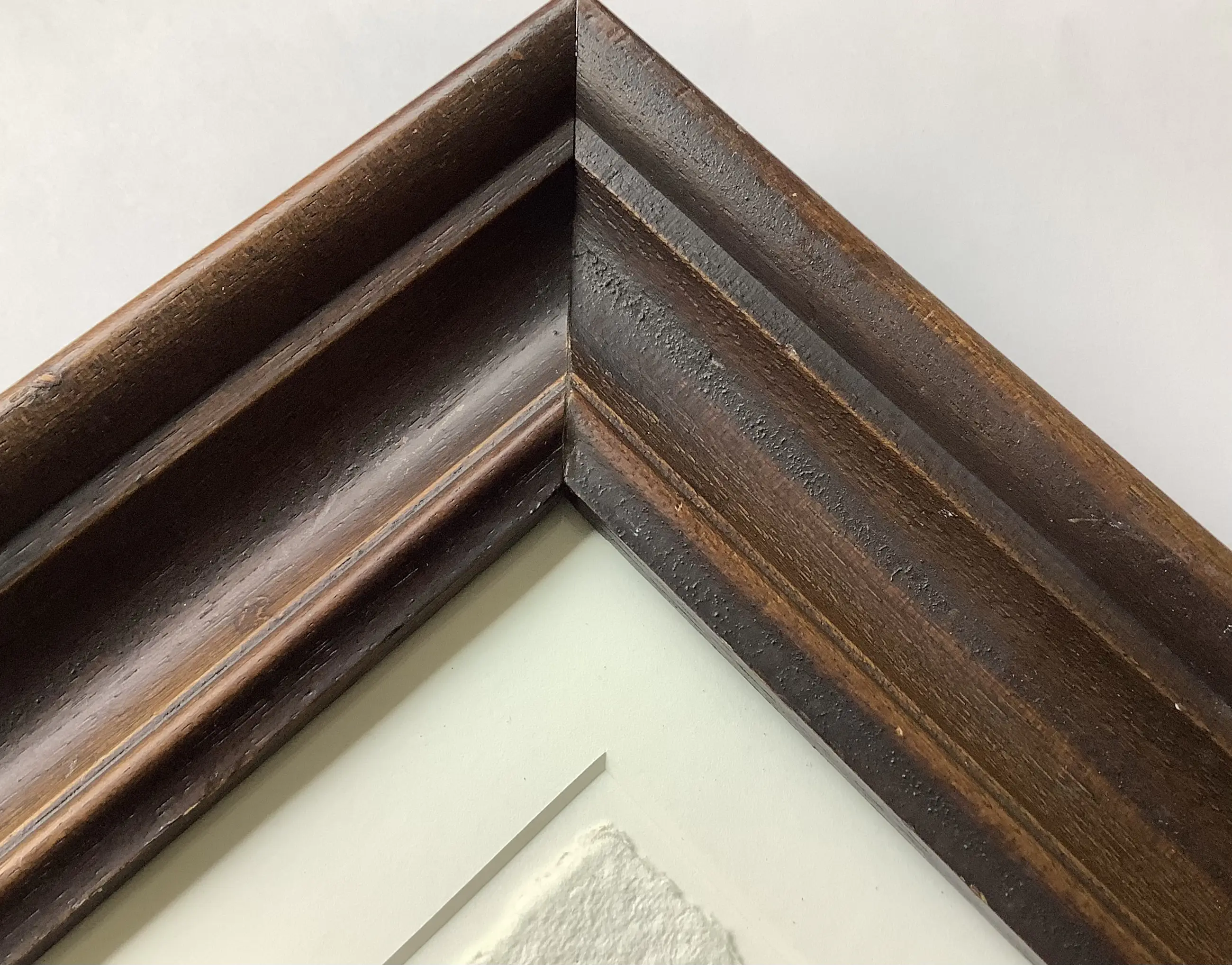 Afmetingen lijst: 30 x 36 cm. Betreft bruine houten lijst. 6 cm breed en 5 cm diep. Zwevend ingelijst tussen wit passe partout.
