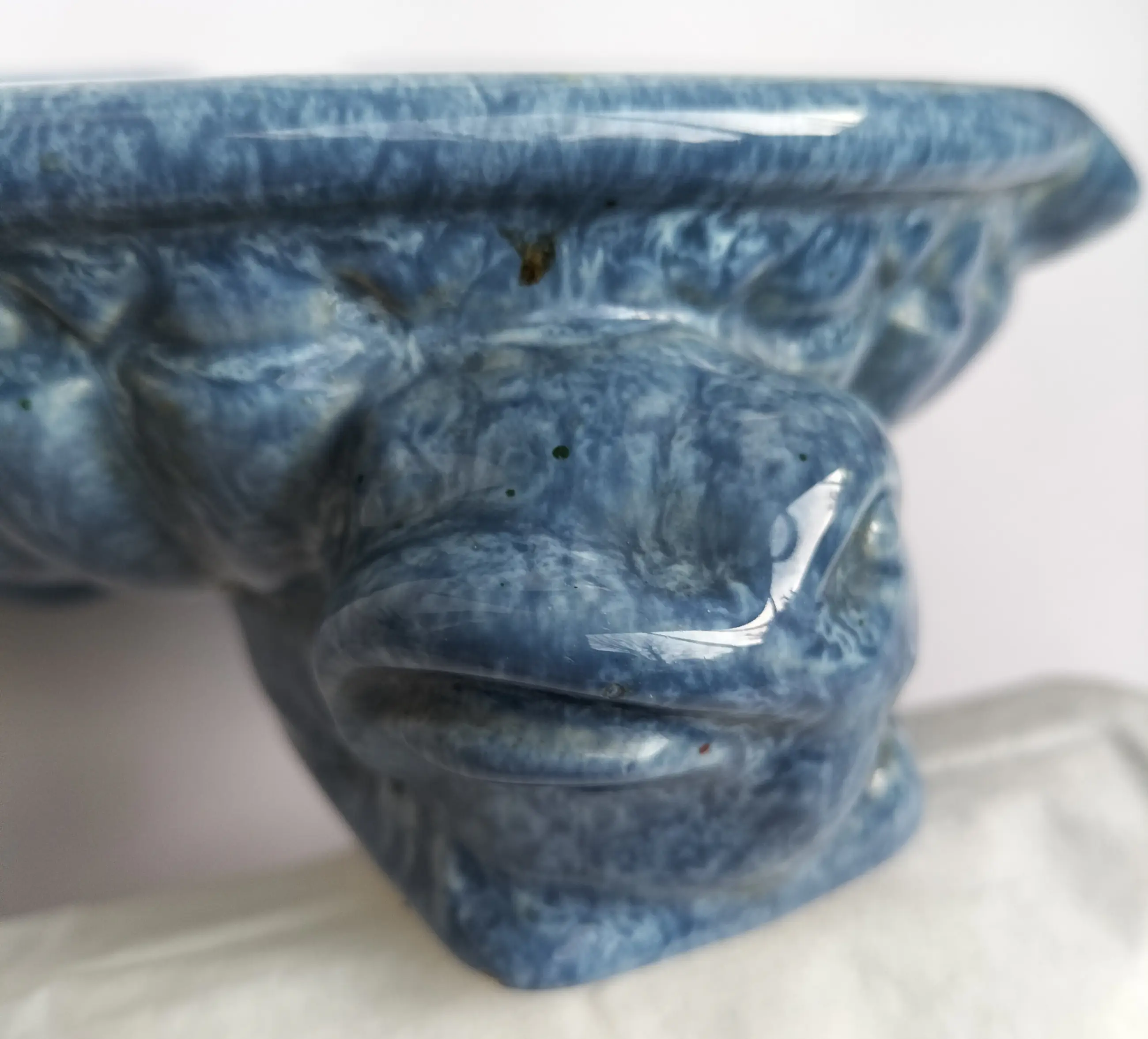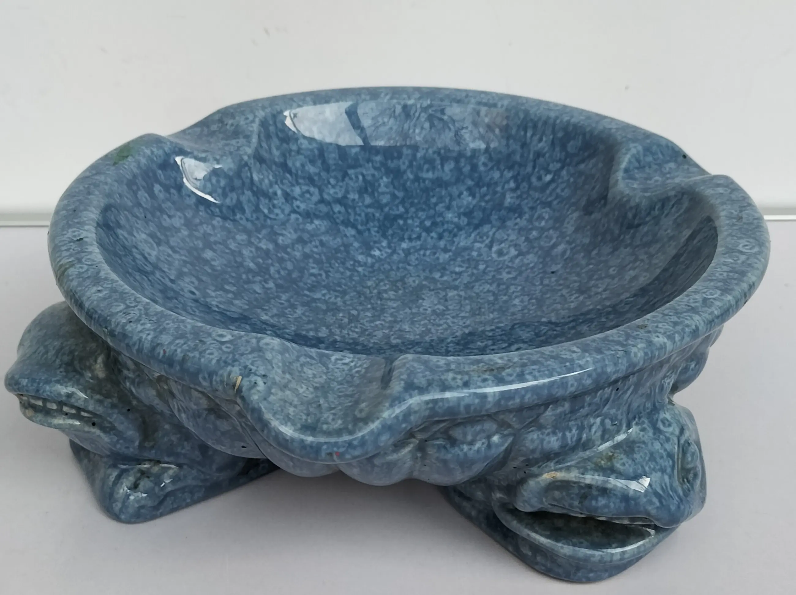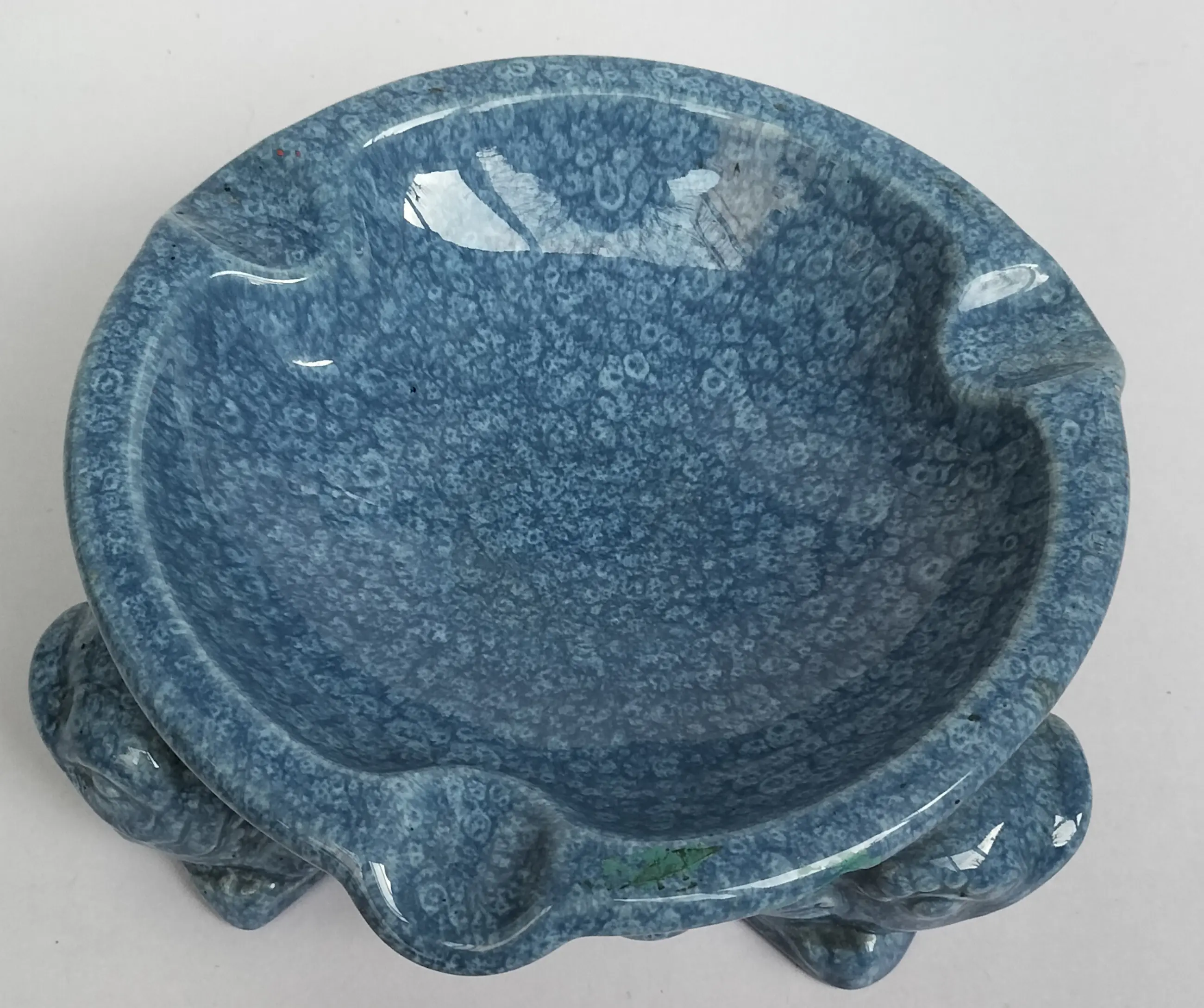 Prachtige grote asbak van Het Tegelhuis, Alphen a/d/ Rijn (1913-1983). Gemaakt in de Art Deco periode in een zeer mooie gemêleerde blauwe kleur. De asbak staat op drie zeer aparte poten, met een dierenkop - het zijn waarschijnlijk vissen of kikkers.....