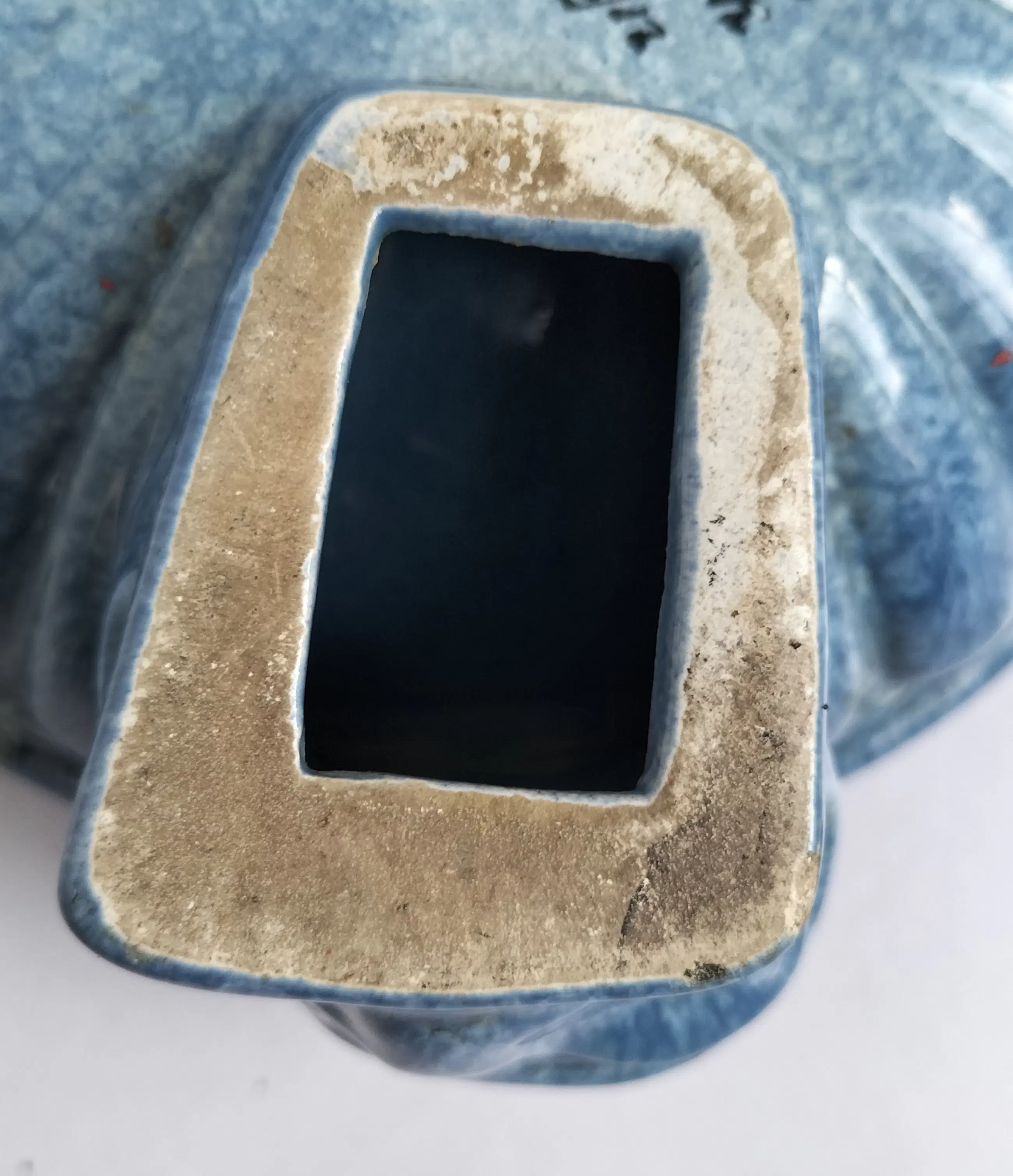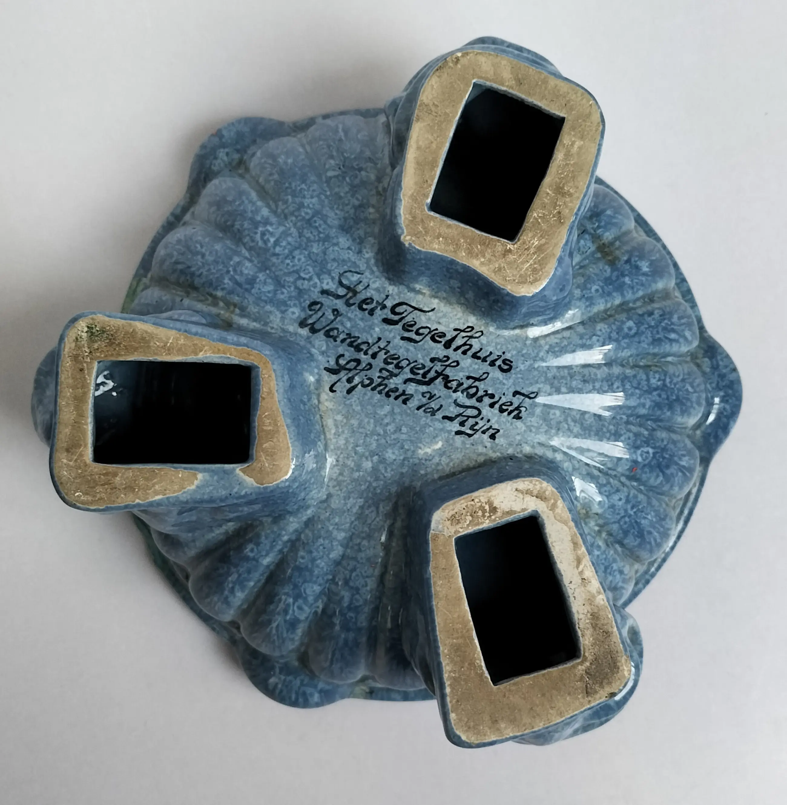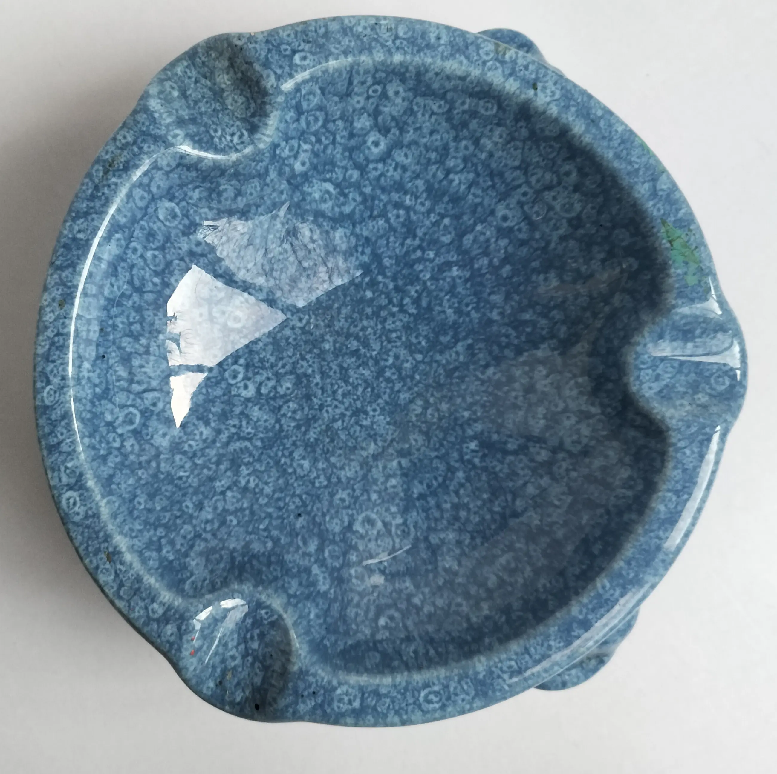 Prachtige grote asbak van Het Tegelhuis, Alphen a/d/ Rijn (1913-1983). Gemaakt in de Art Deco periode in een zeer mooie gemêleerde blauwe kleur. De asbak staat op drie zeer aparte poten, met een dierenkop - het zijn waarschijnlijk vissen of kikkers.....