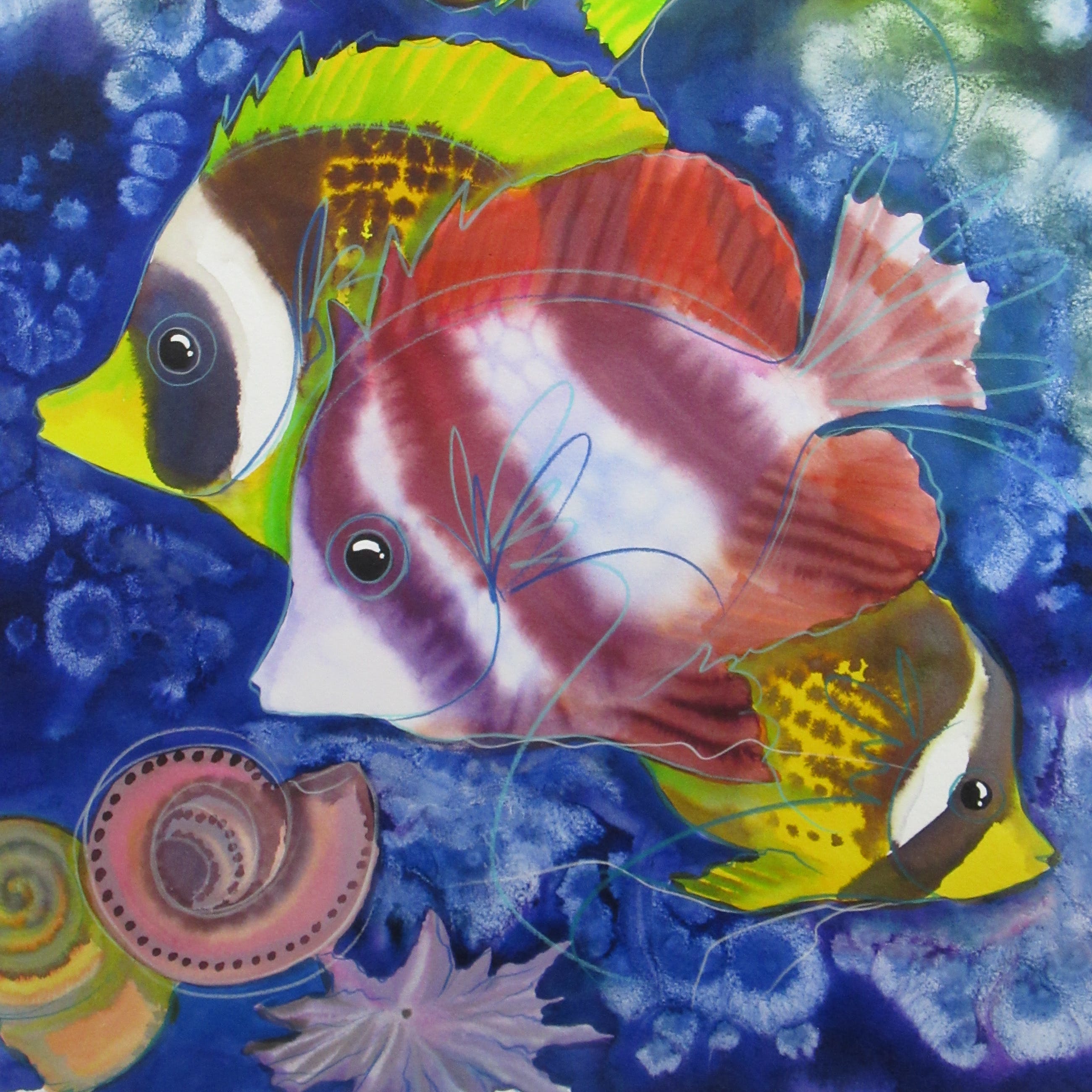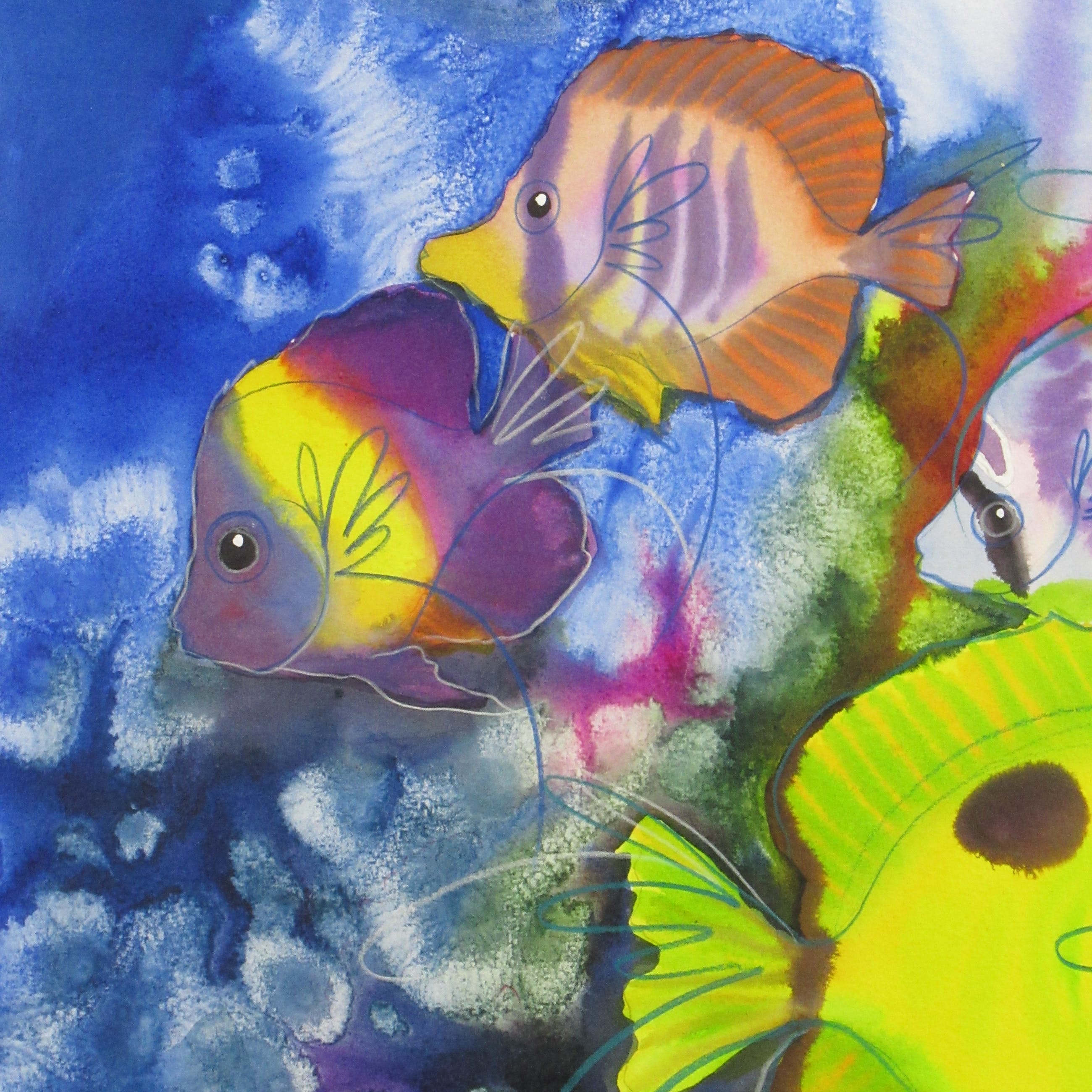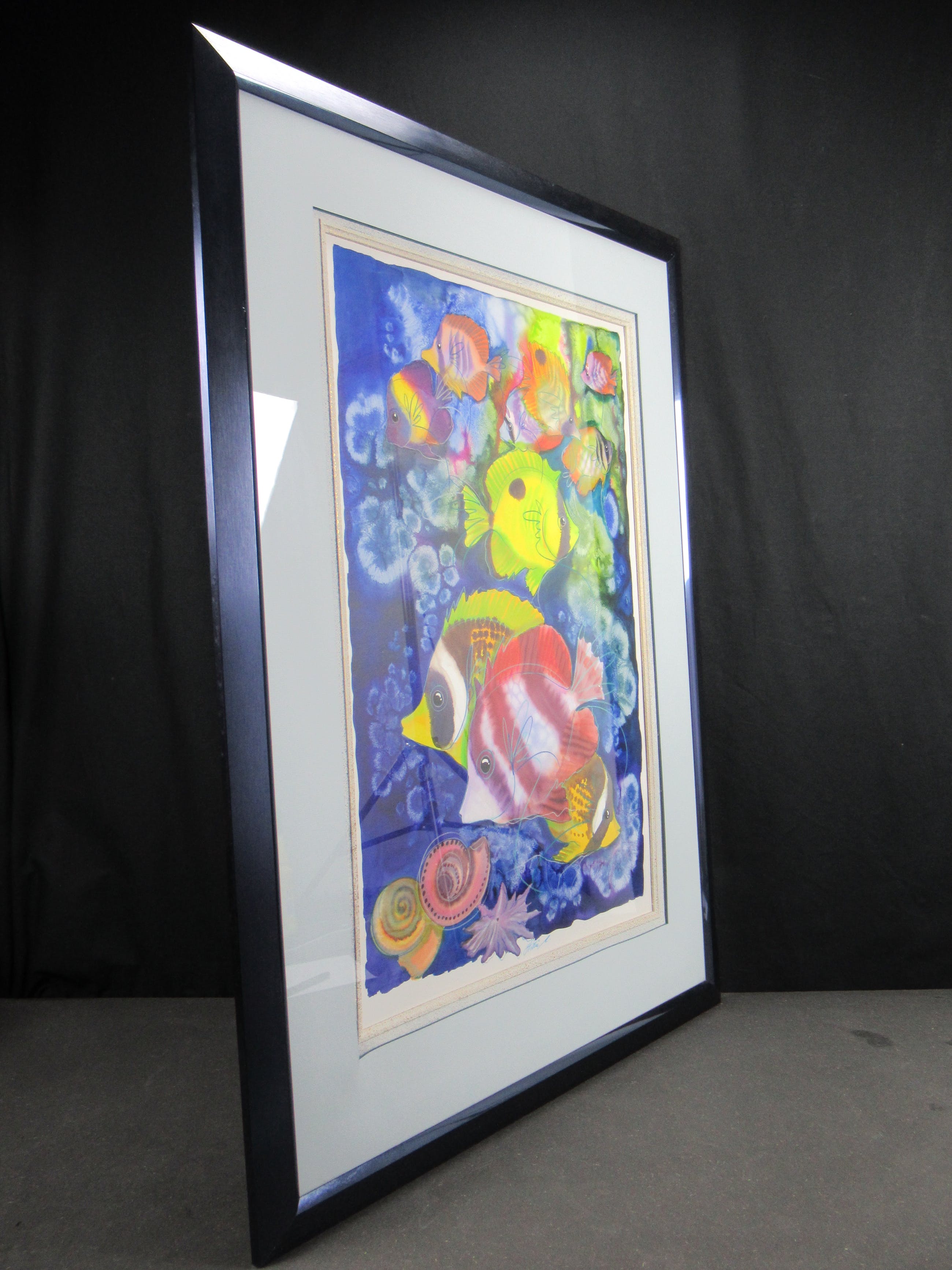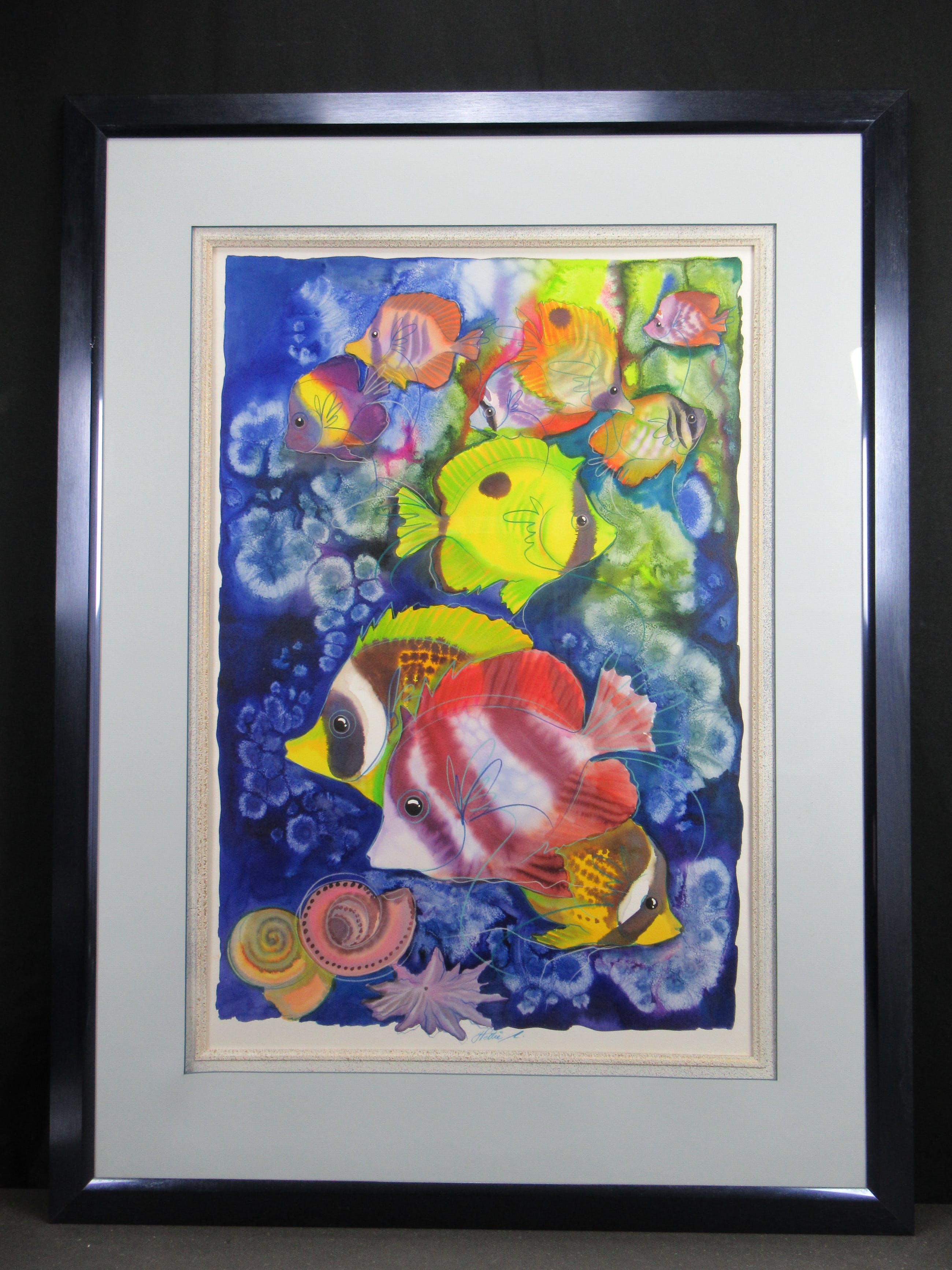 Vrolijk werk van formaat van de hand van de Zuid-Afrikaanse Hettie Saaiman. Het werk is professioneel ingelijst. Het heeft een mooie passe-partout. Kan direct aan de muur worden gehangen! Wordt zorgvuldig verpakt en gebracht binnen Nederland.