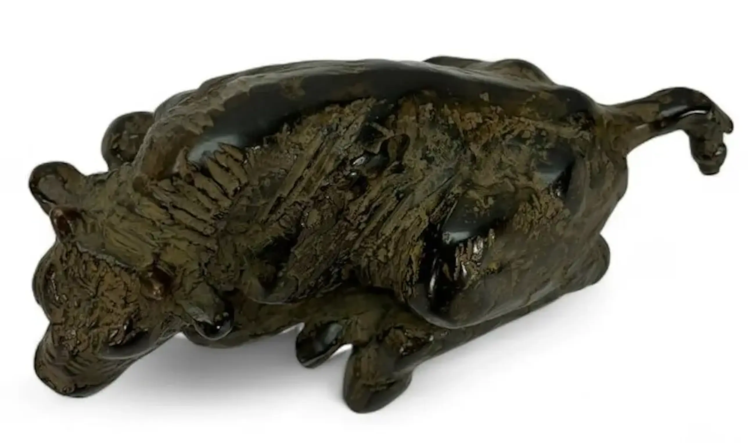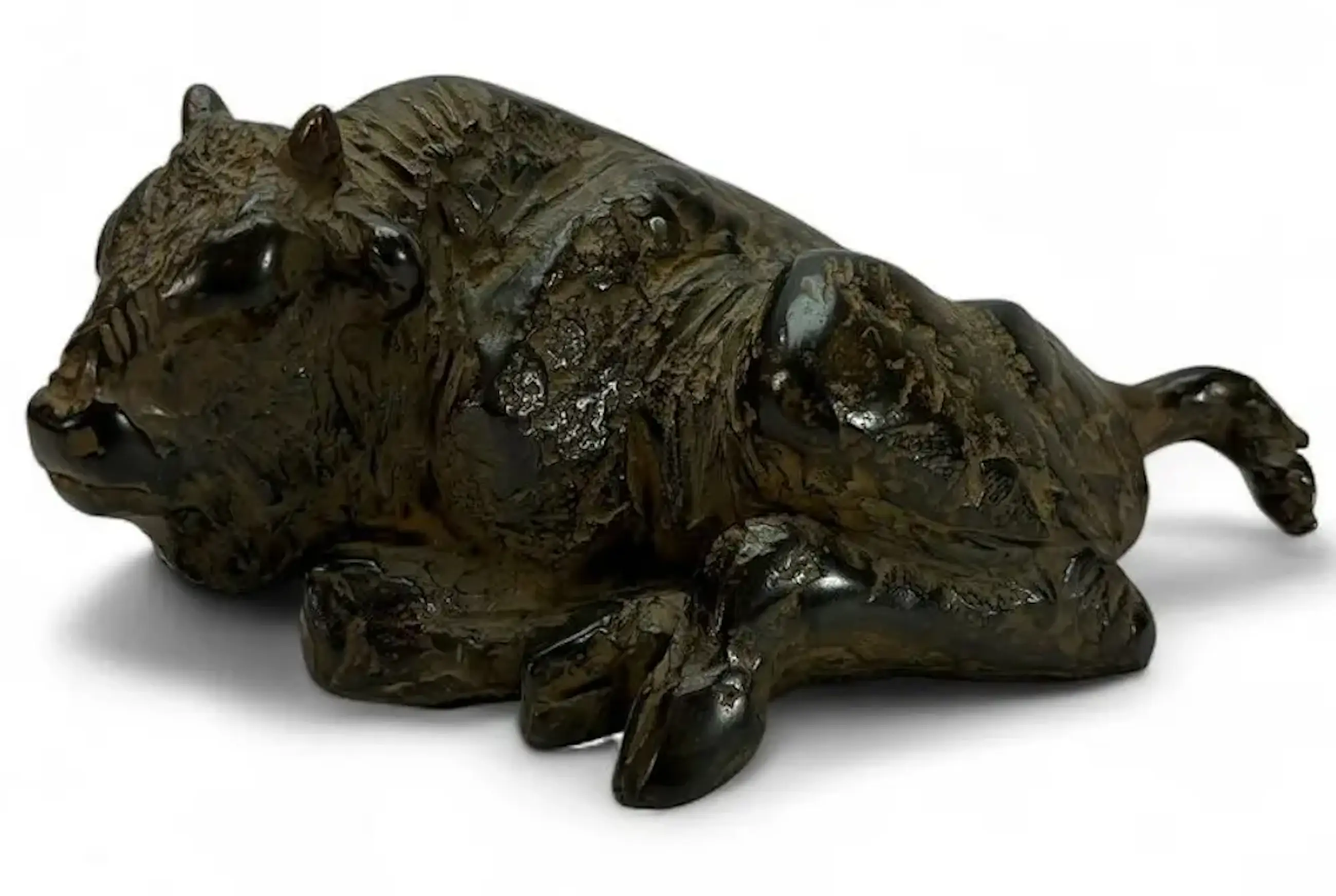 Bronzen sculptuur van Hetty Heyster. Voorstelling van een liggende wisent. Afmetingen sculptuur: H10cm x b21cm x d5cm. Het werk is aan de achterzijde gemonogrammeerd door de kunstenares. De authenticiteit van het aangeboden werk wordt volledig gegarandeerd. Een certificaat van echtheid kan, op aanvraag, worden gemaild.