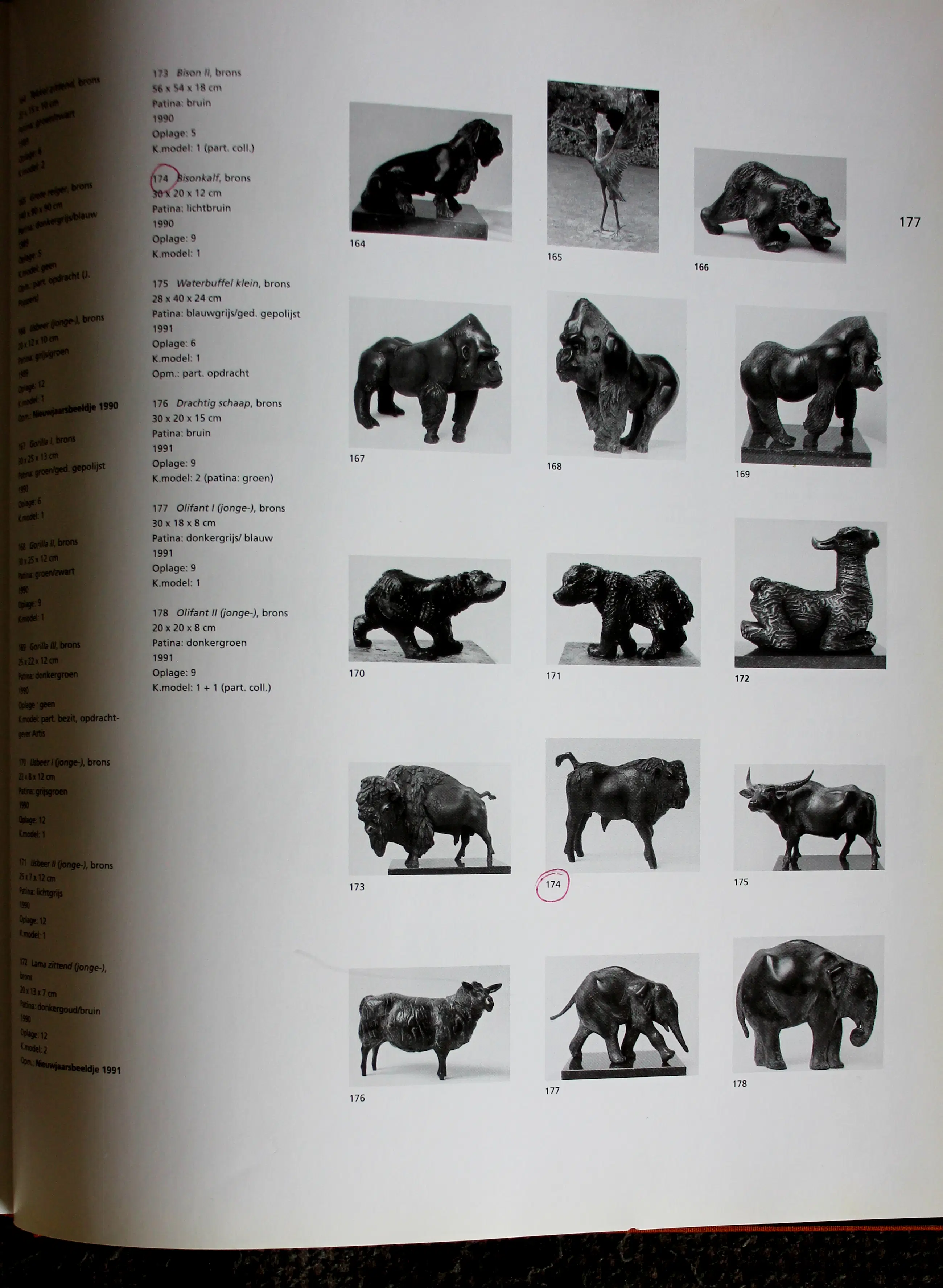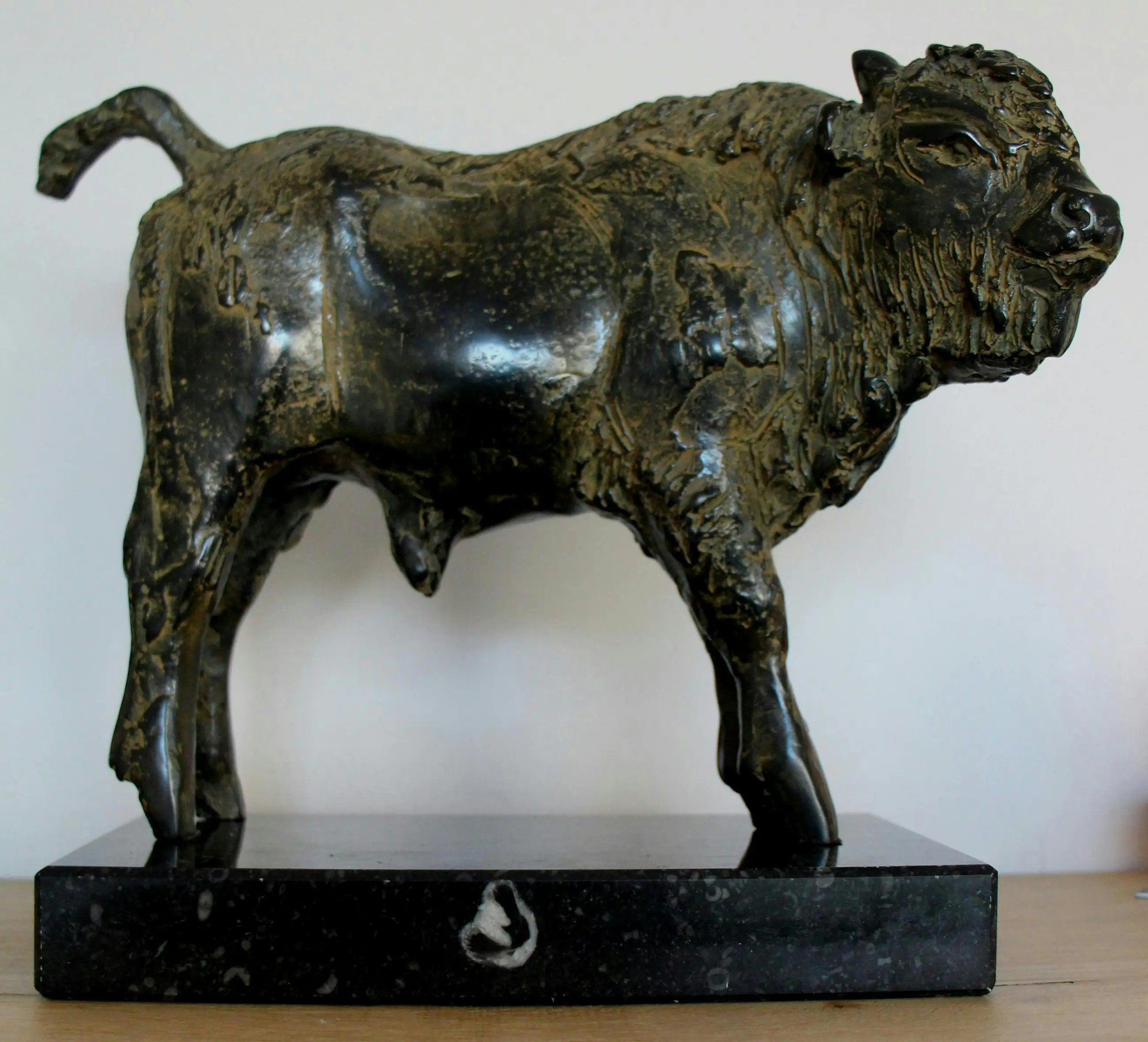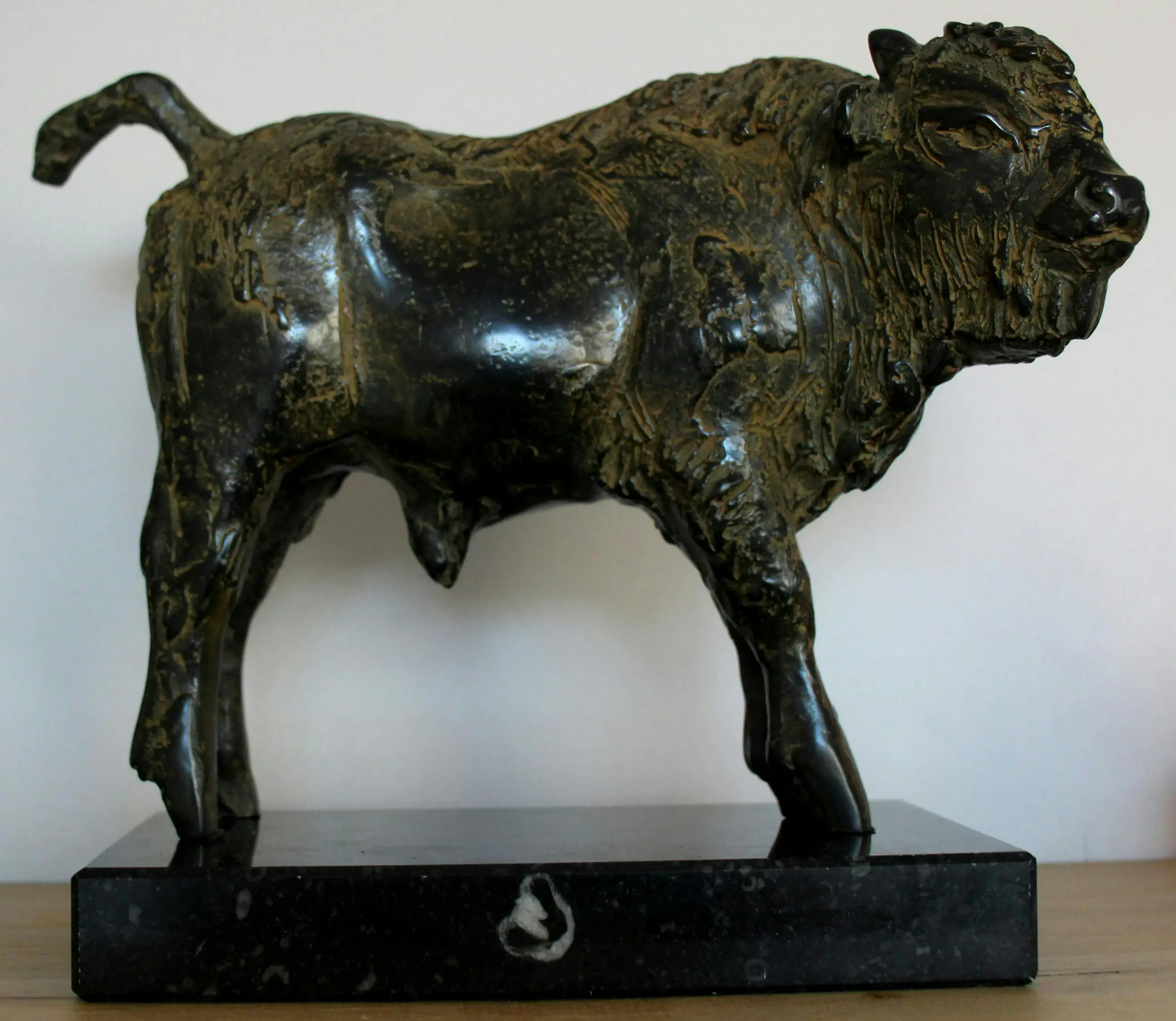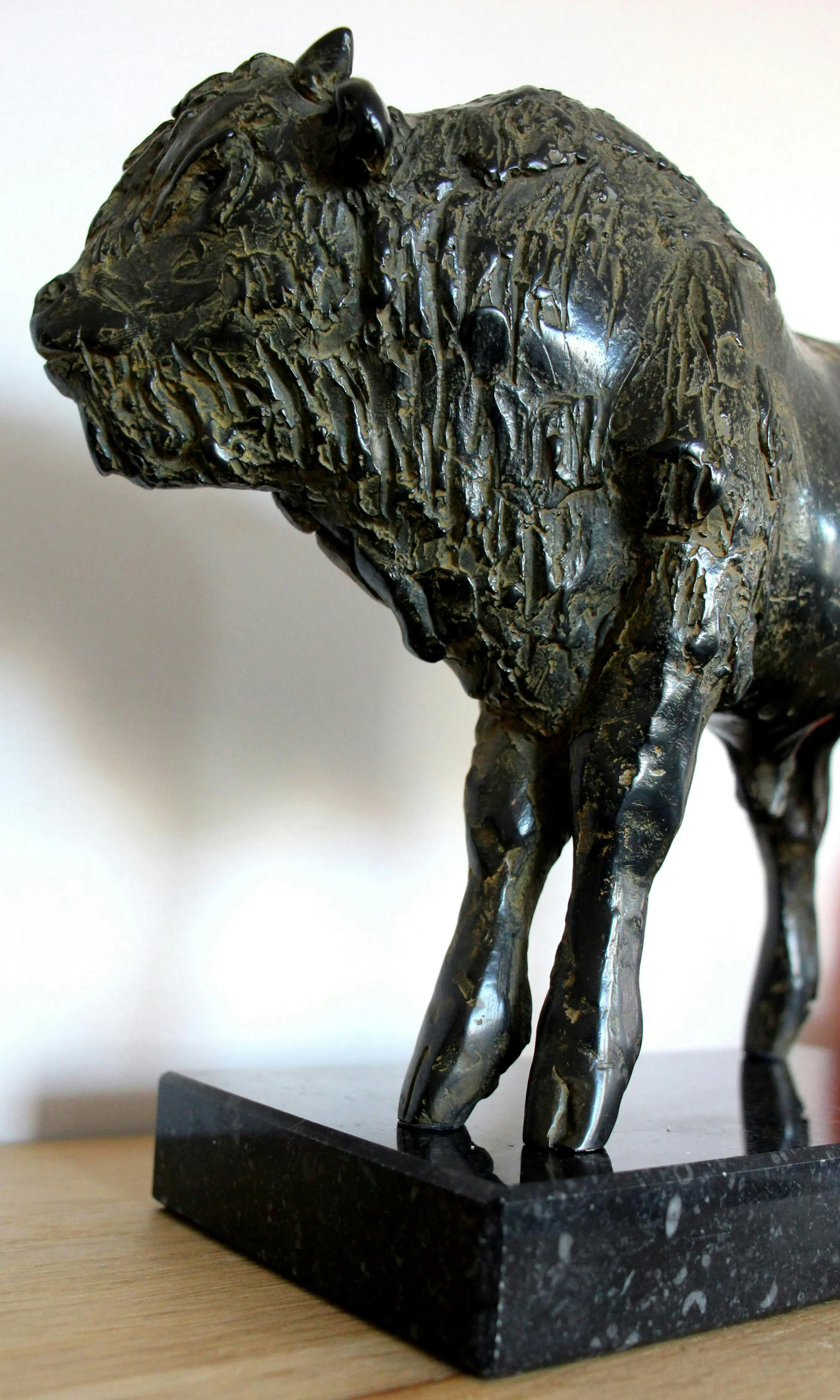 Bronzen sculptuur, op zwart stenen plateau, van Hetty Heyster. Titel: Bizon kalf. Jaar: 1990. Afmetingen beeld incl sokkel: H23cm x 20cm x d11cm. Het beeld is, onderaan, gesigneerd door de kunstenares. De authenticiteit van het aangeboden werk wordt volledig gegarandeerd. Een certificaat van echtheid kan, op aanvraag, worden gemaild.