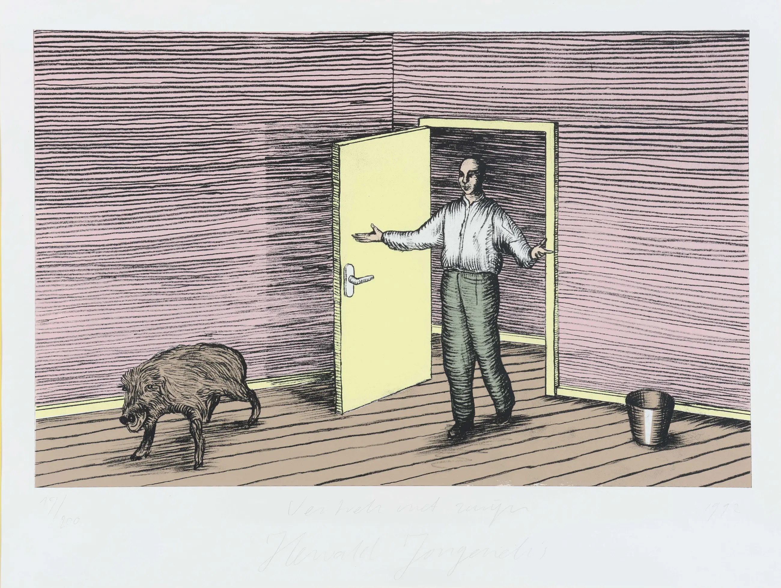 Hewald Jongenelis is graficus, installatiekunstenaar, schilder geboren in 1962 te Etten-Leur. Het werk is onder in het midden door hem gesigneerd.