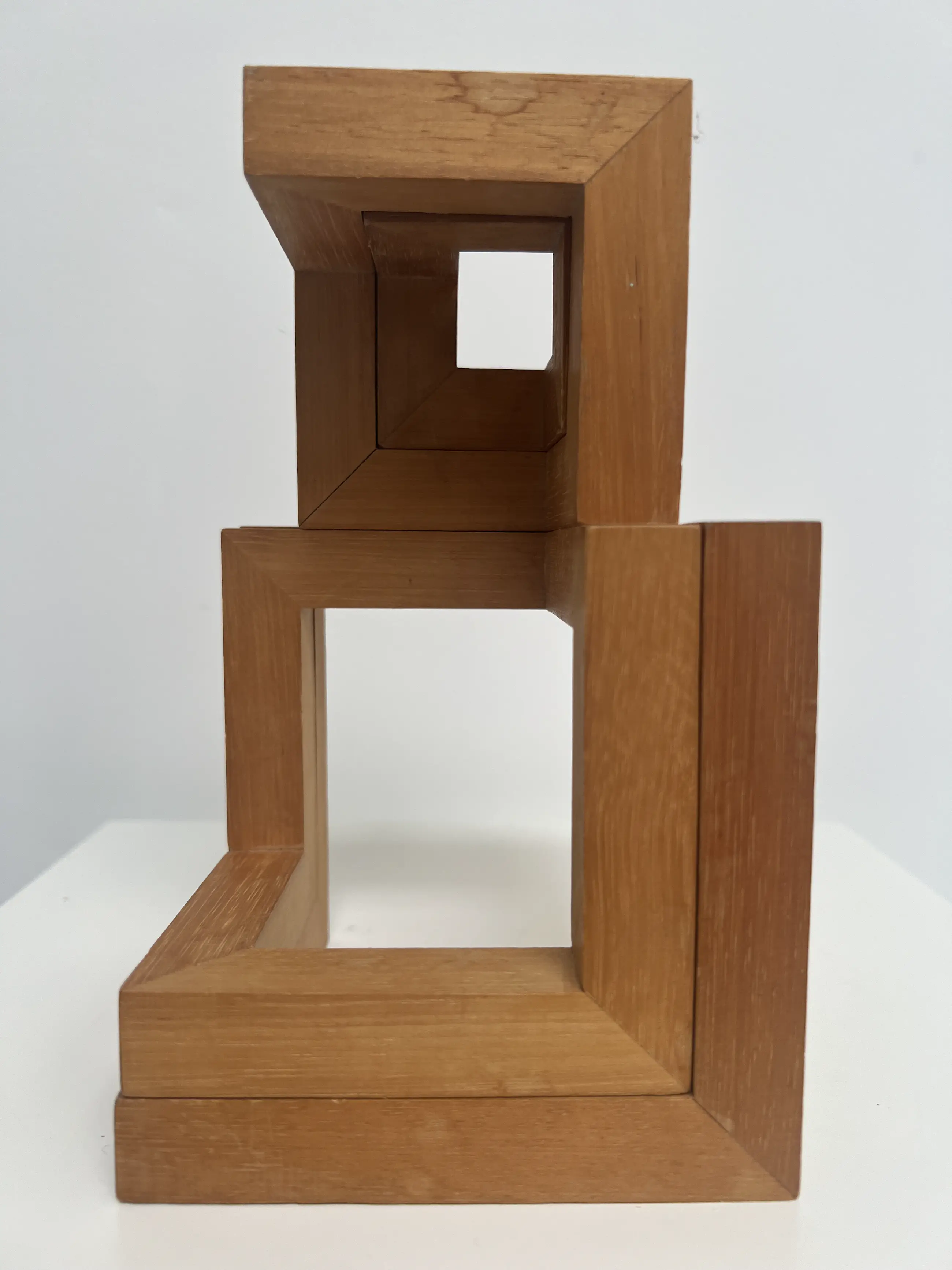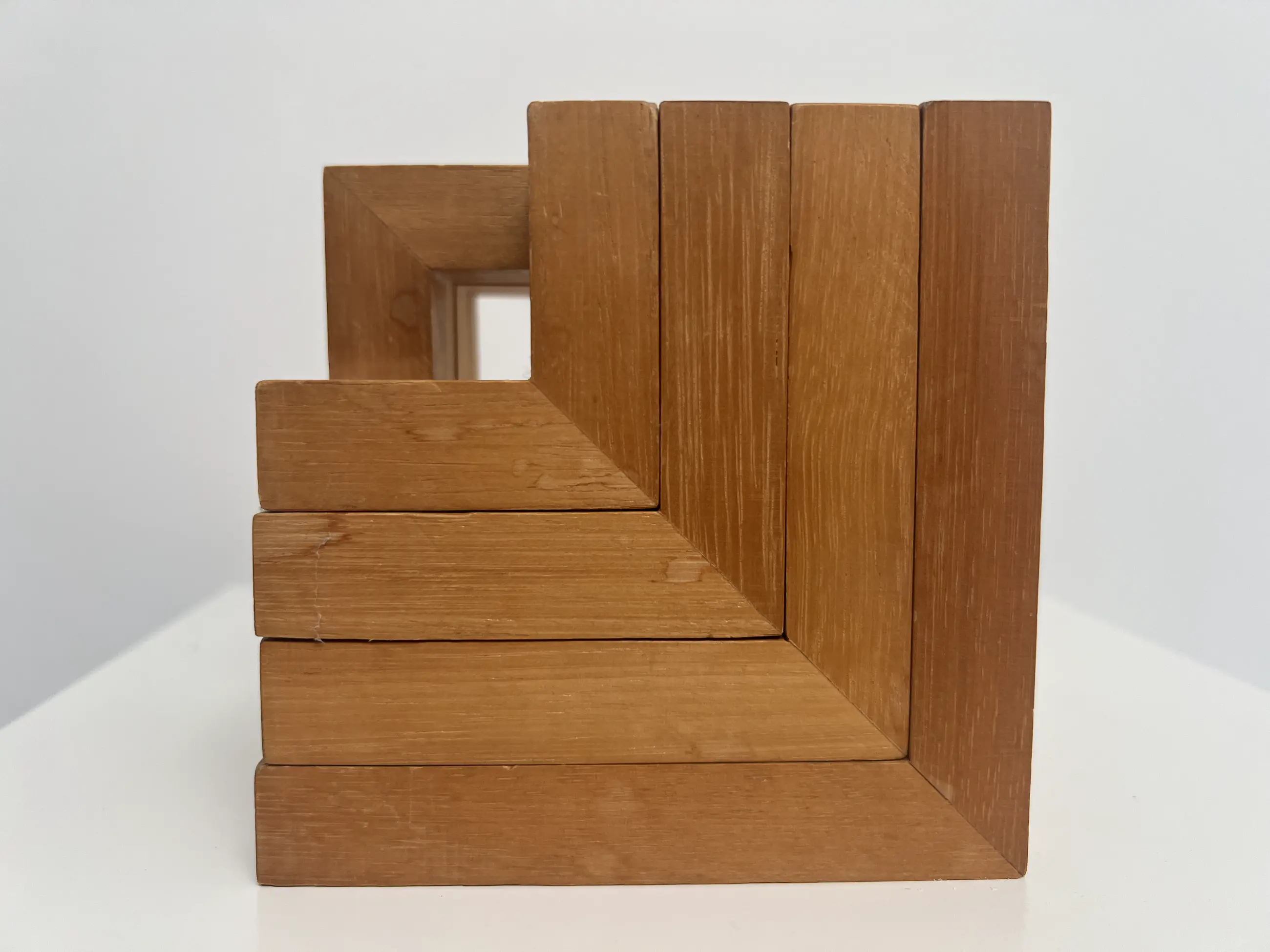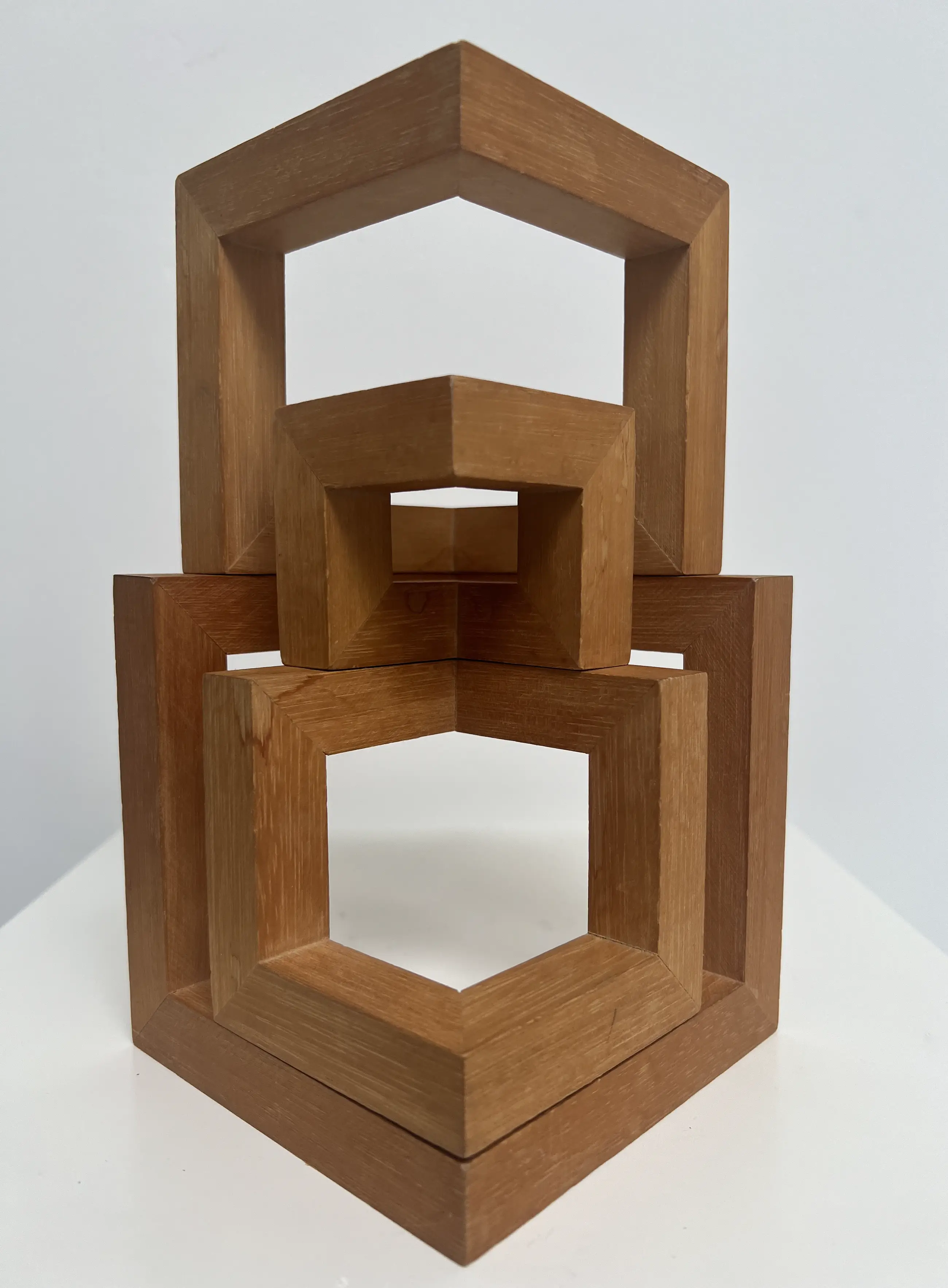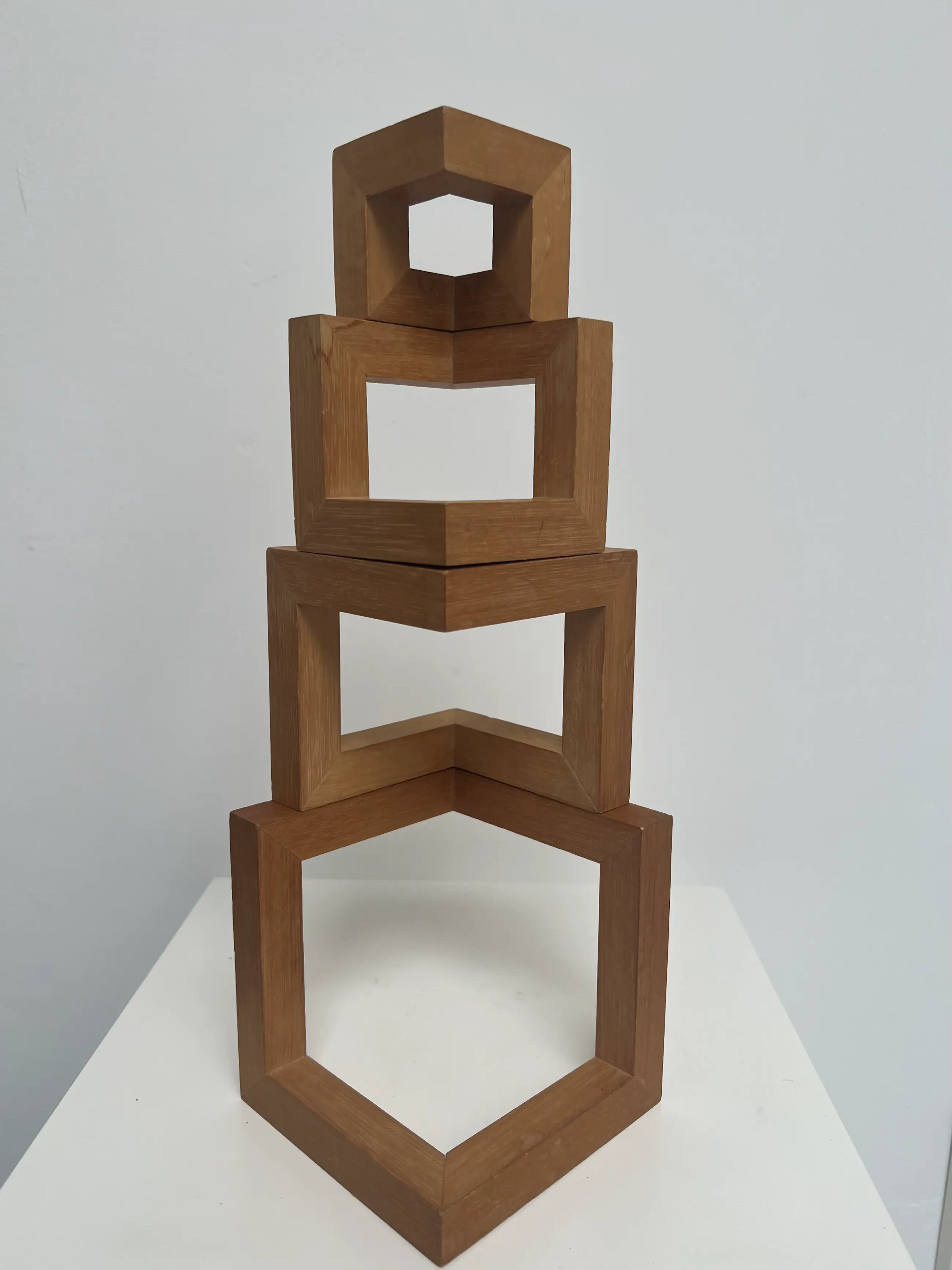 Bijzonder houten sculptuur van de hand van Hil Andringa. Door de afzonderlijke delen anders op elkaar te stapelen of naast elkaar te plaatsen, krijg je telkens een ander fraai kunstwerk.
