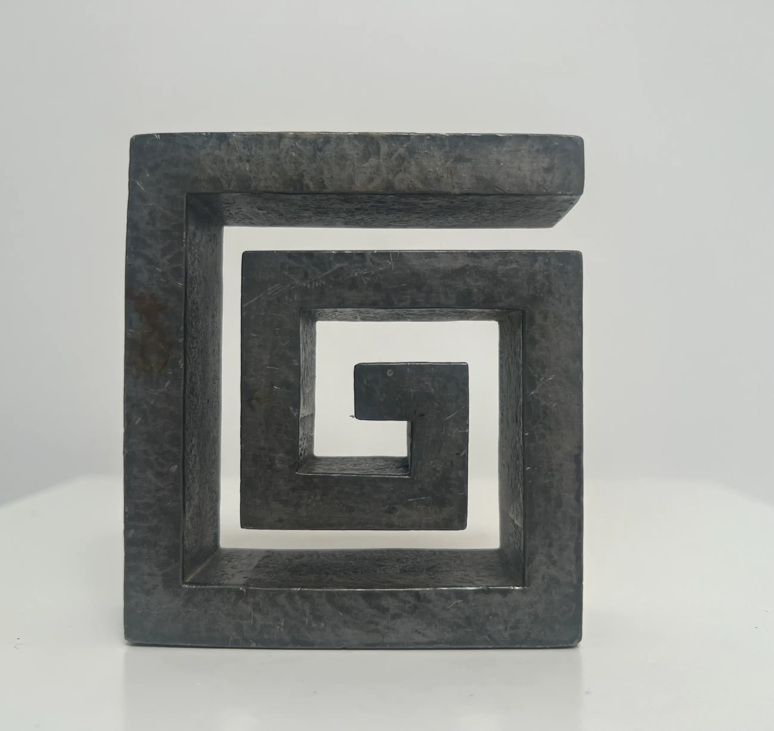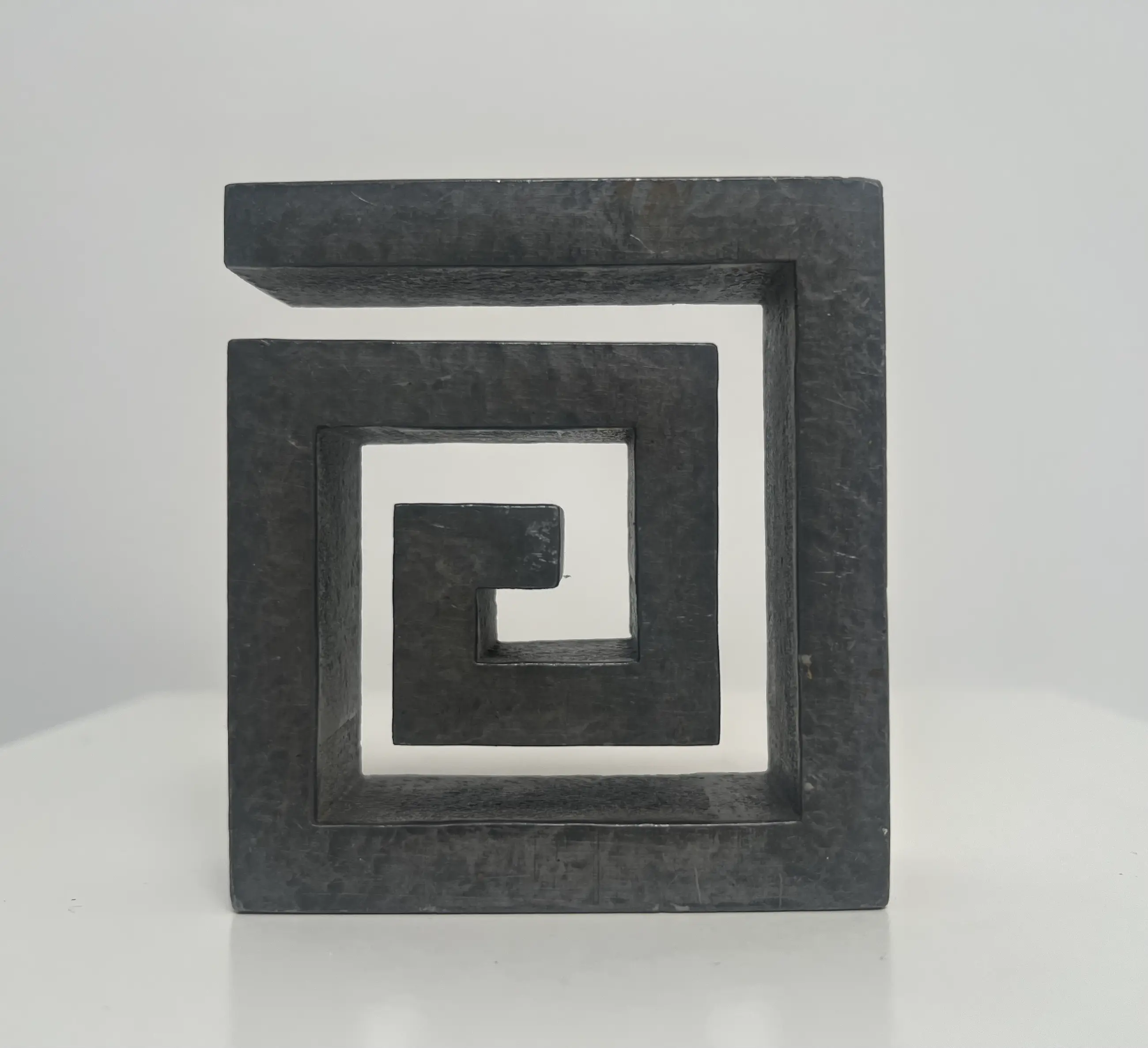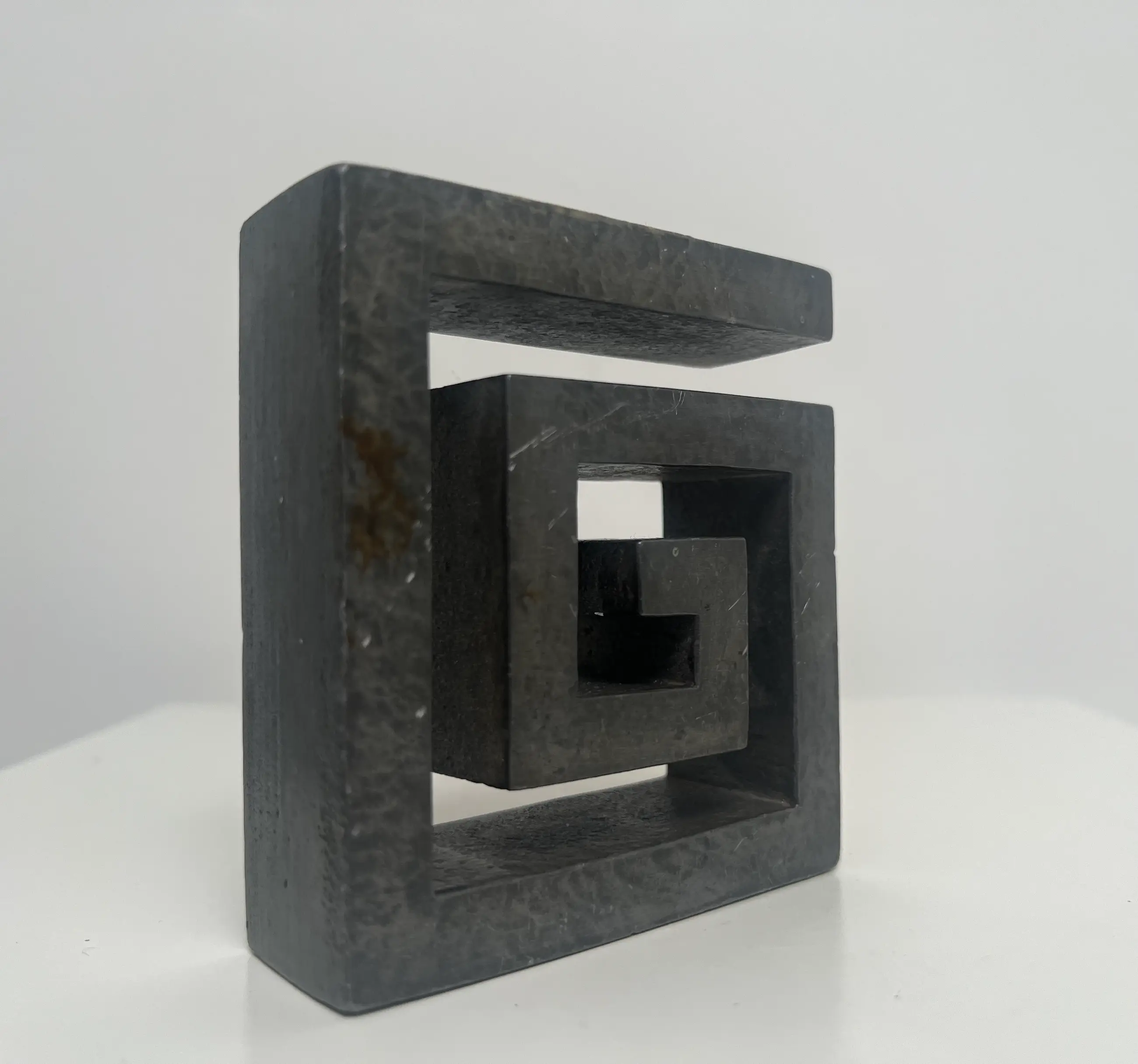 Bijzonder ijzeren sculptuur van de hand van Hil Andringa. Het zou ook brons kunnen zijn, maar dat is lastig te zien. De structuur aan de buitenzijde lijkt 'gehamerd'.