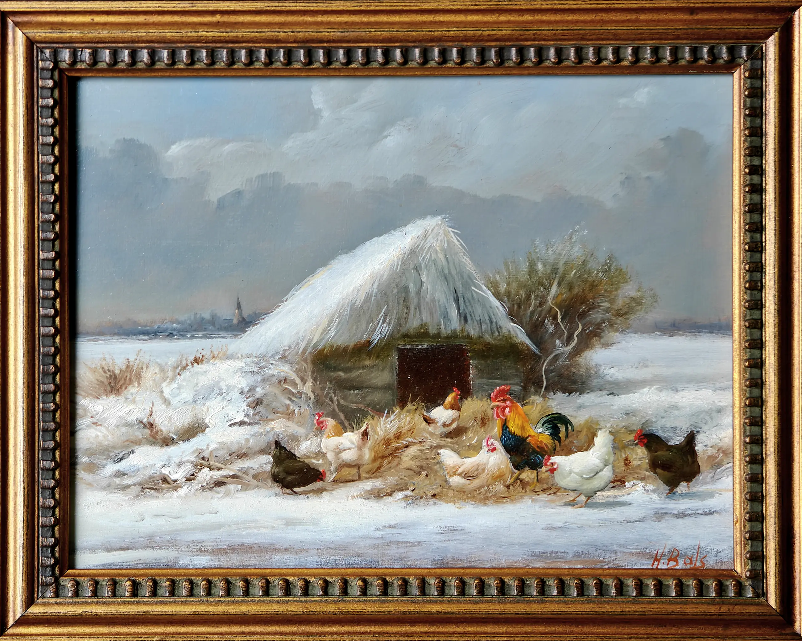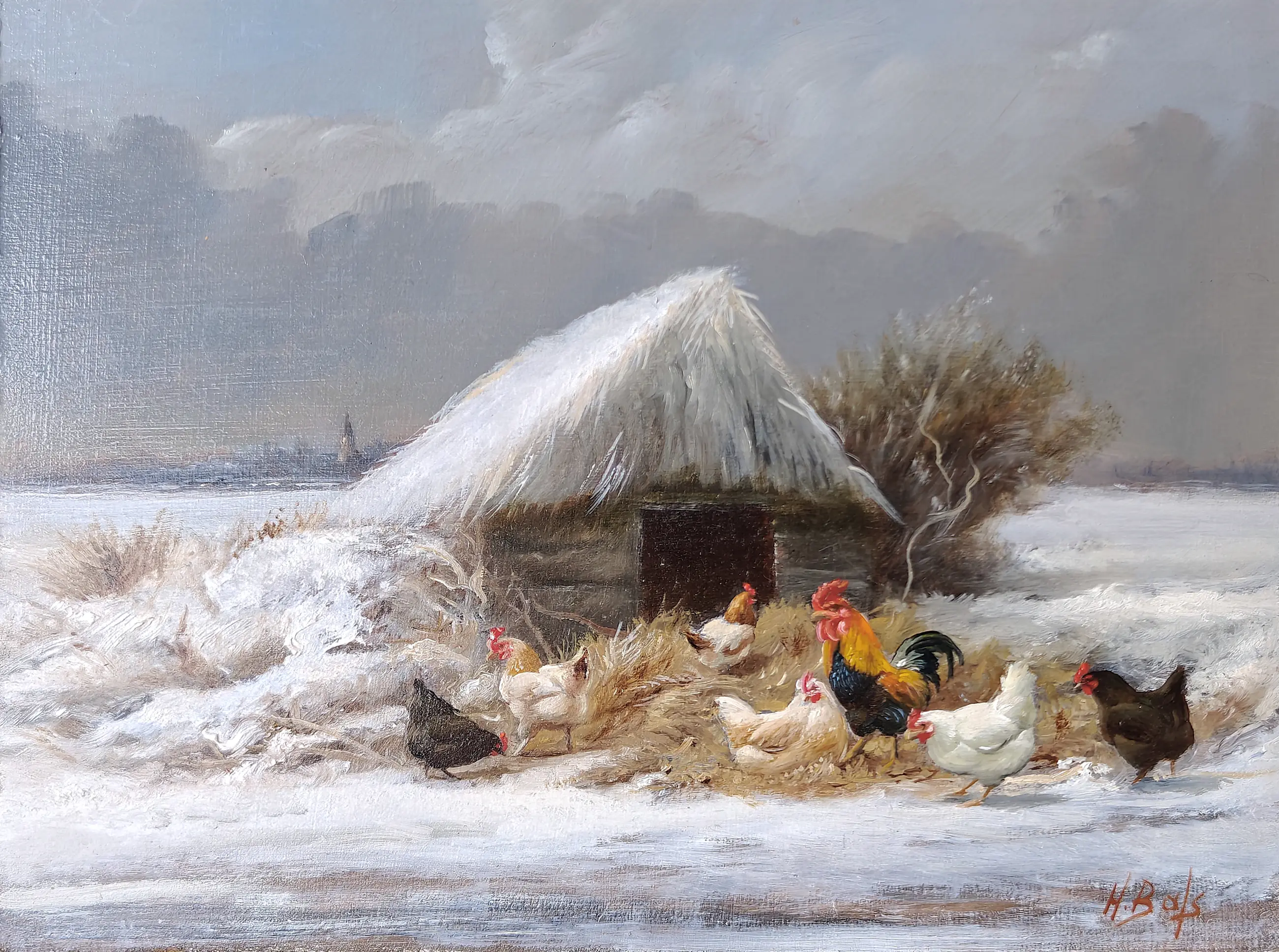 Sfeervol winters tafereel, besneeuwd landschap met fraaie grijstinten, en mooi afstekende, scharrelende kippen.