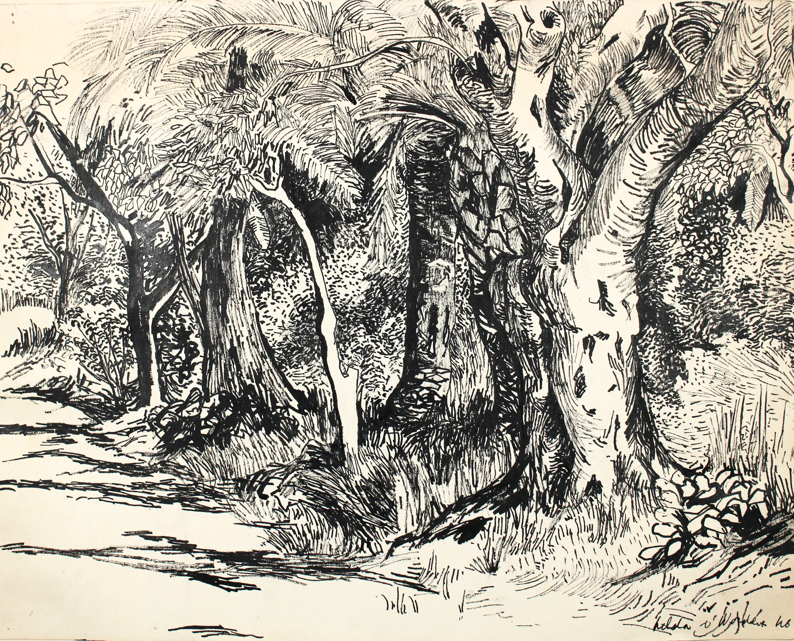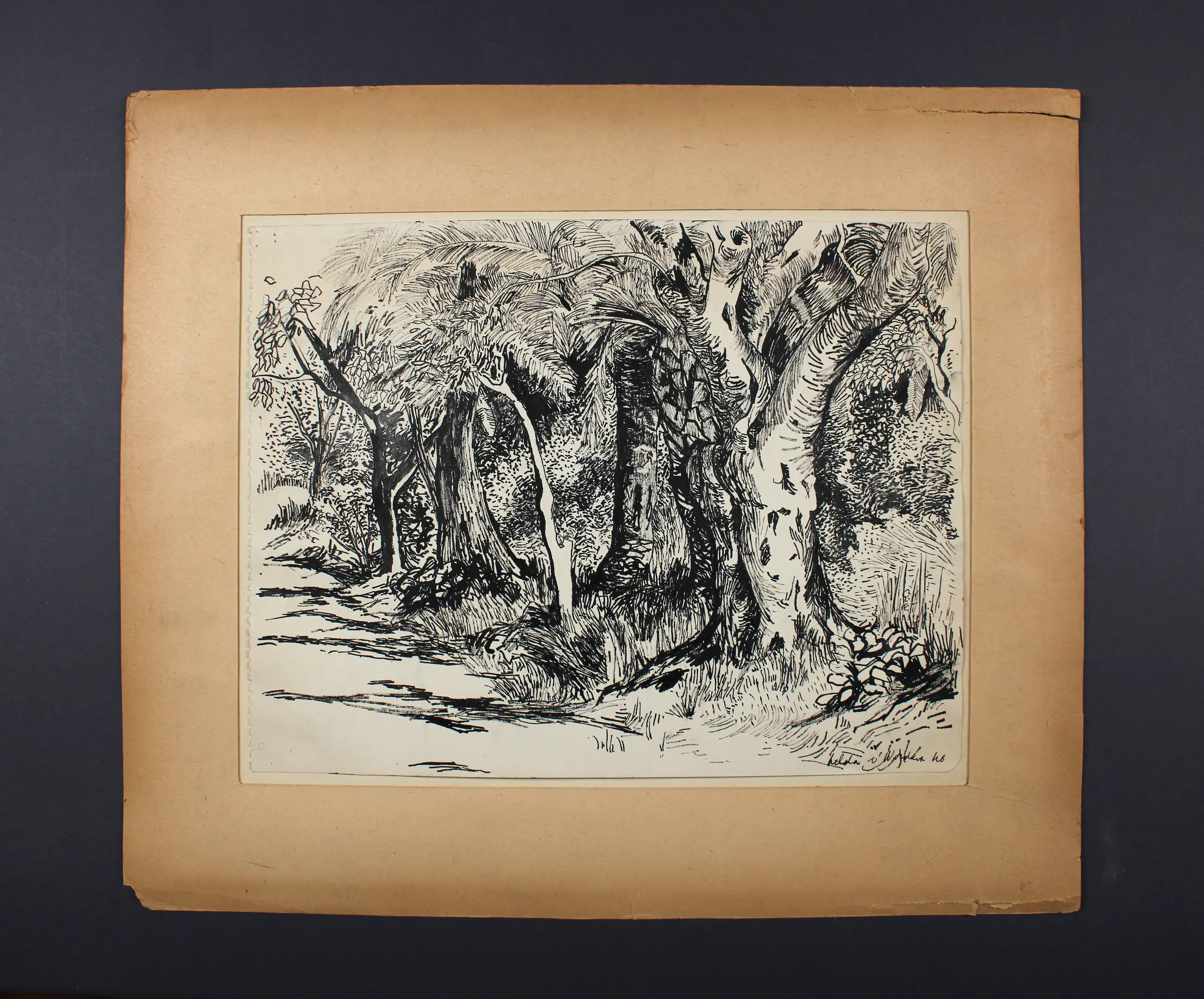 - inkt tekening getiteld Palmen tuin, gesigneerd rechts onder, gedateerd 1946, geplakt op karton, onder passe-partout
