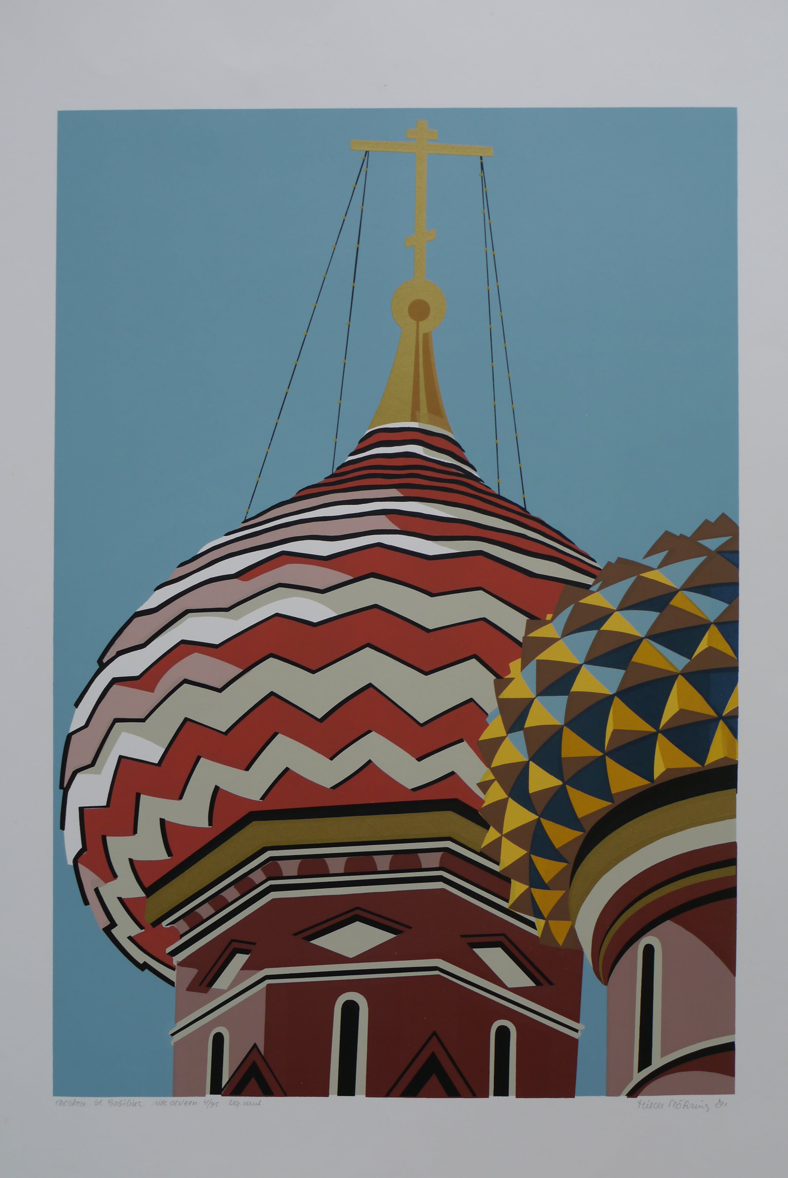 Een zeefdruk in kleur van Hilde Möhring. Titel: Moskou St. Basilius. 1981. Gesigneerd rechtsonder, plus jaartal. Titel linksonder, plus oplage 4 van de 75. Maakte onderdeel uit van grafiek 81. Afmetingen van de afbeelding zijn 58 x 40 cm. Enkele kleine beschadigingen aan de randen en twee vlekjes. Zie foto's.