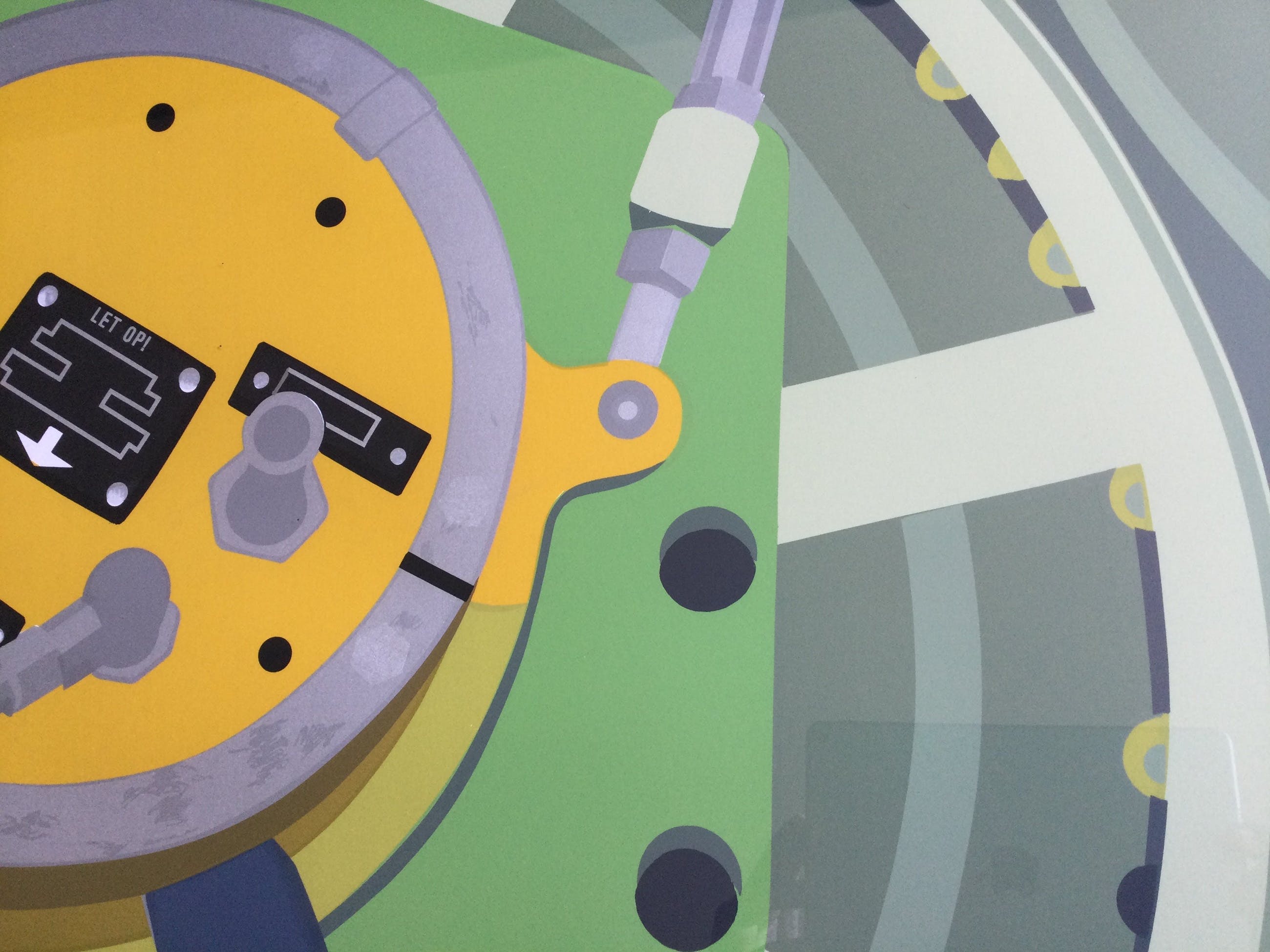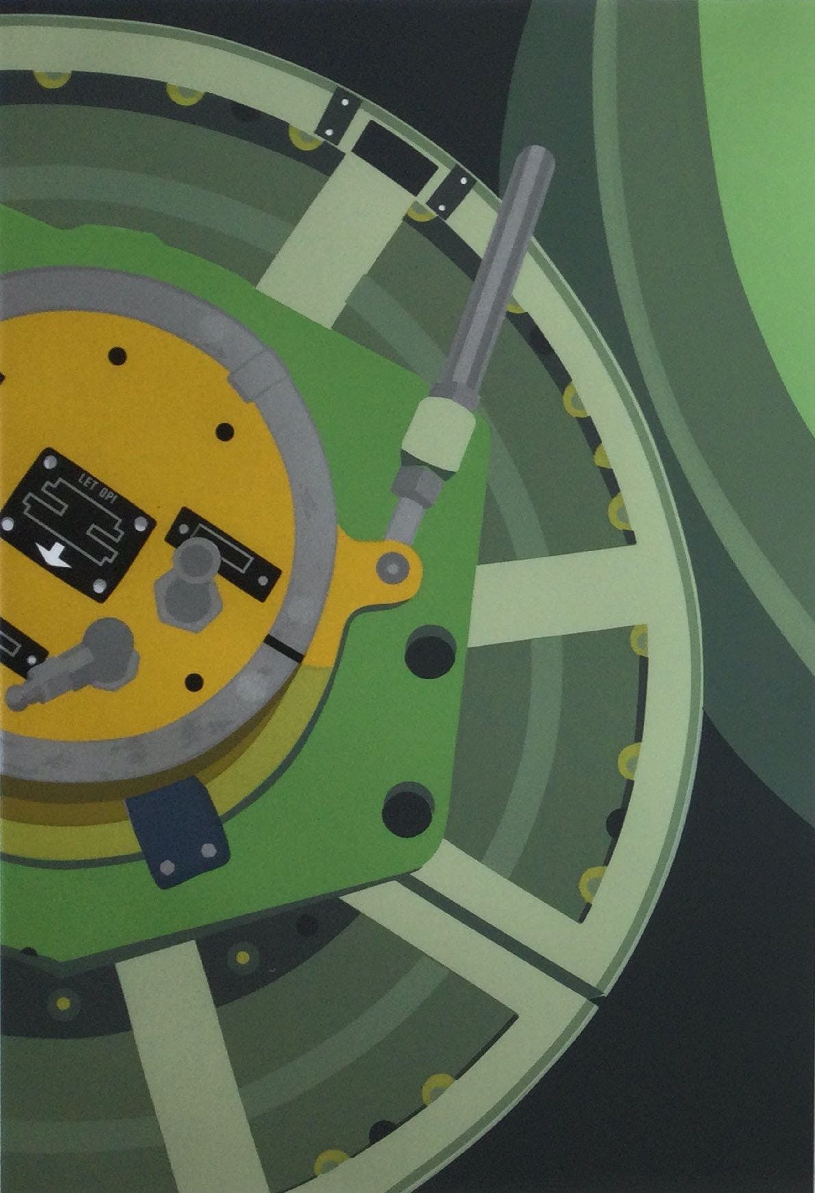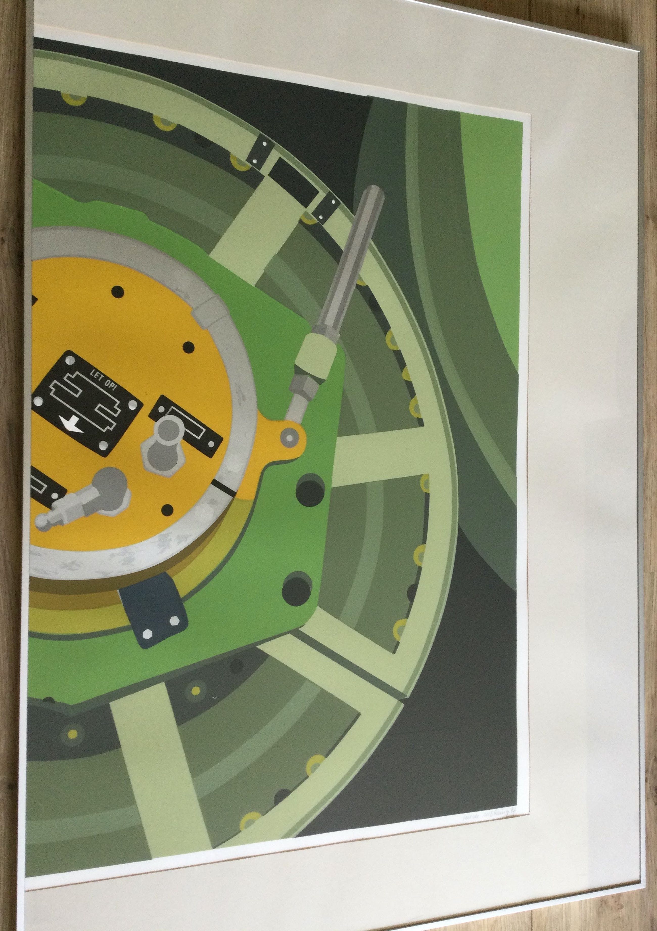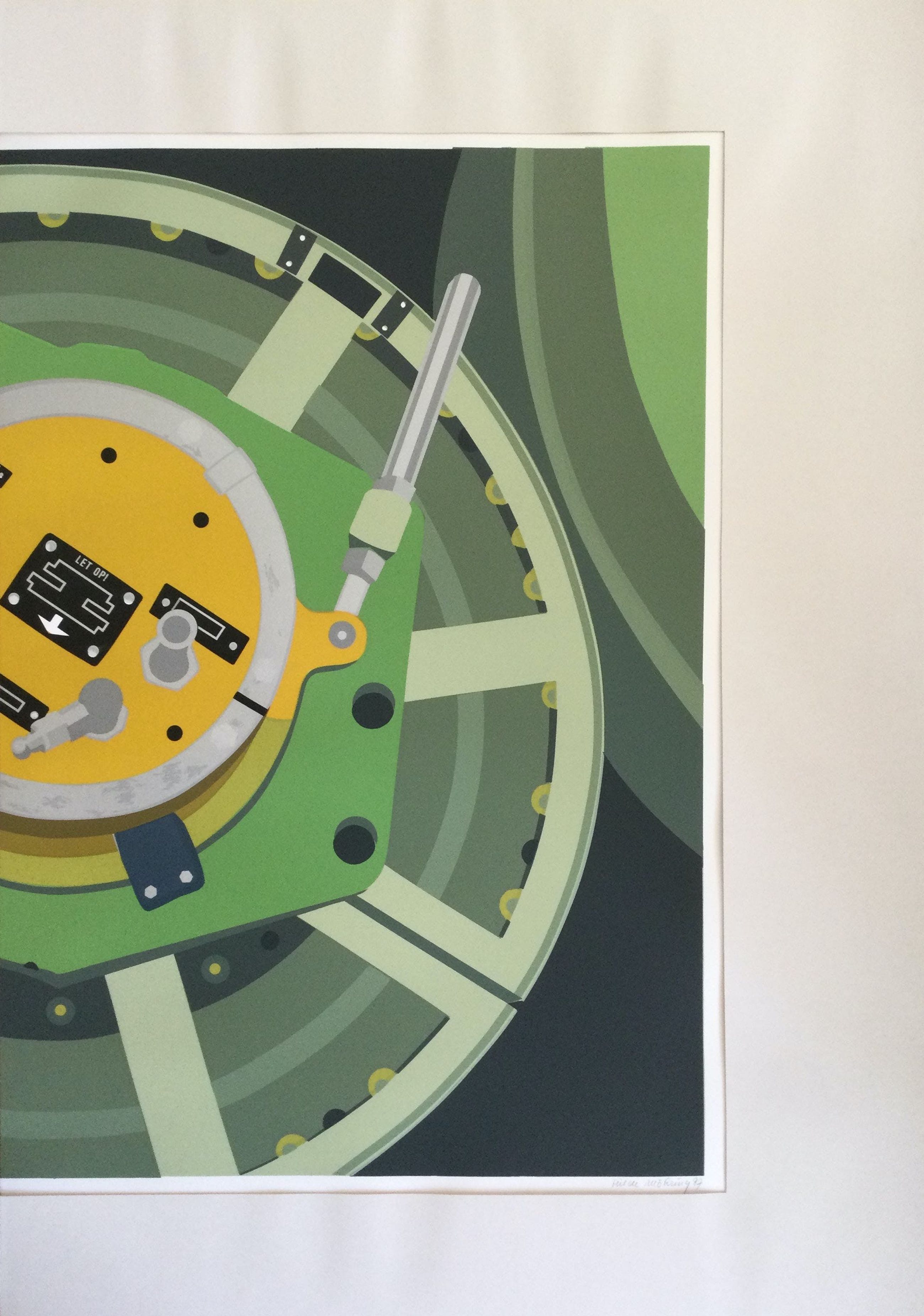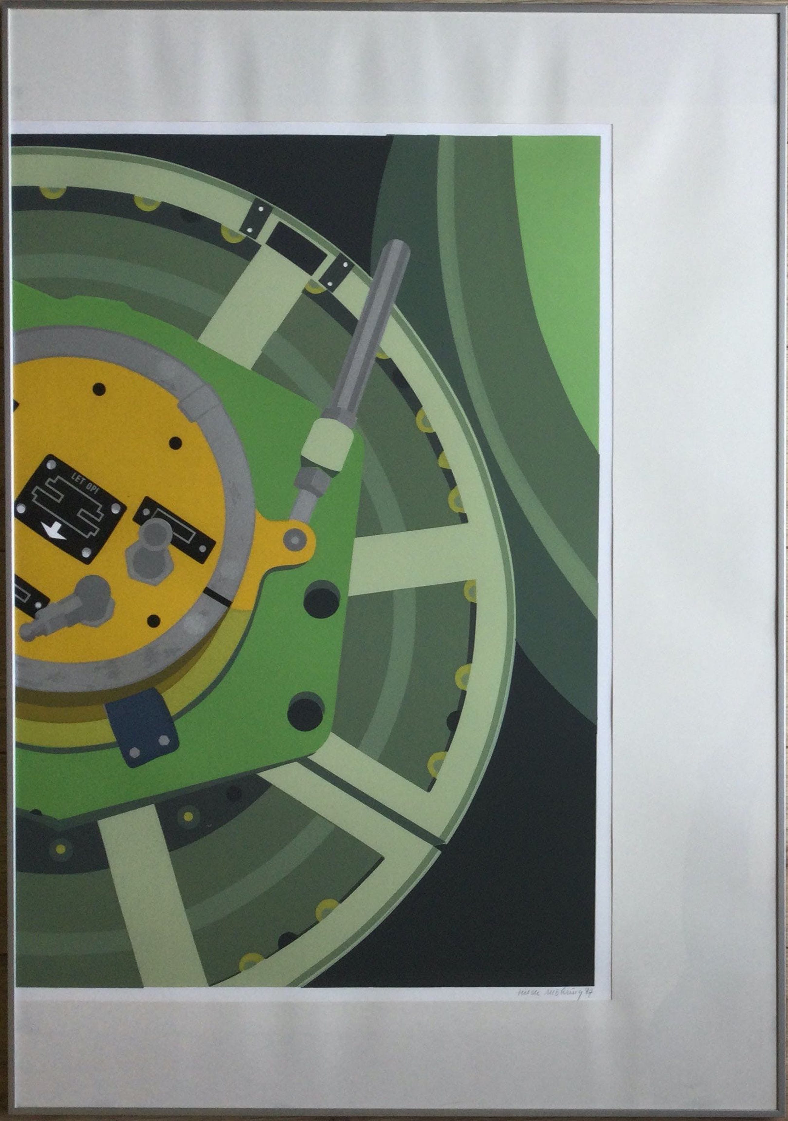 Helaas ontbreekt het linkerdeel van de 2-luik kleuren zeefdruk van Hilde Möhring (1942) met als titel 'Perspartij', een weergave van een technische aandrijving van een (druk?)pers.