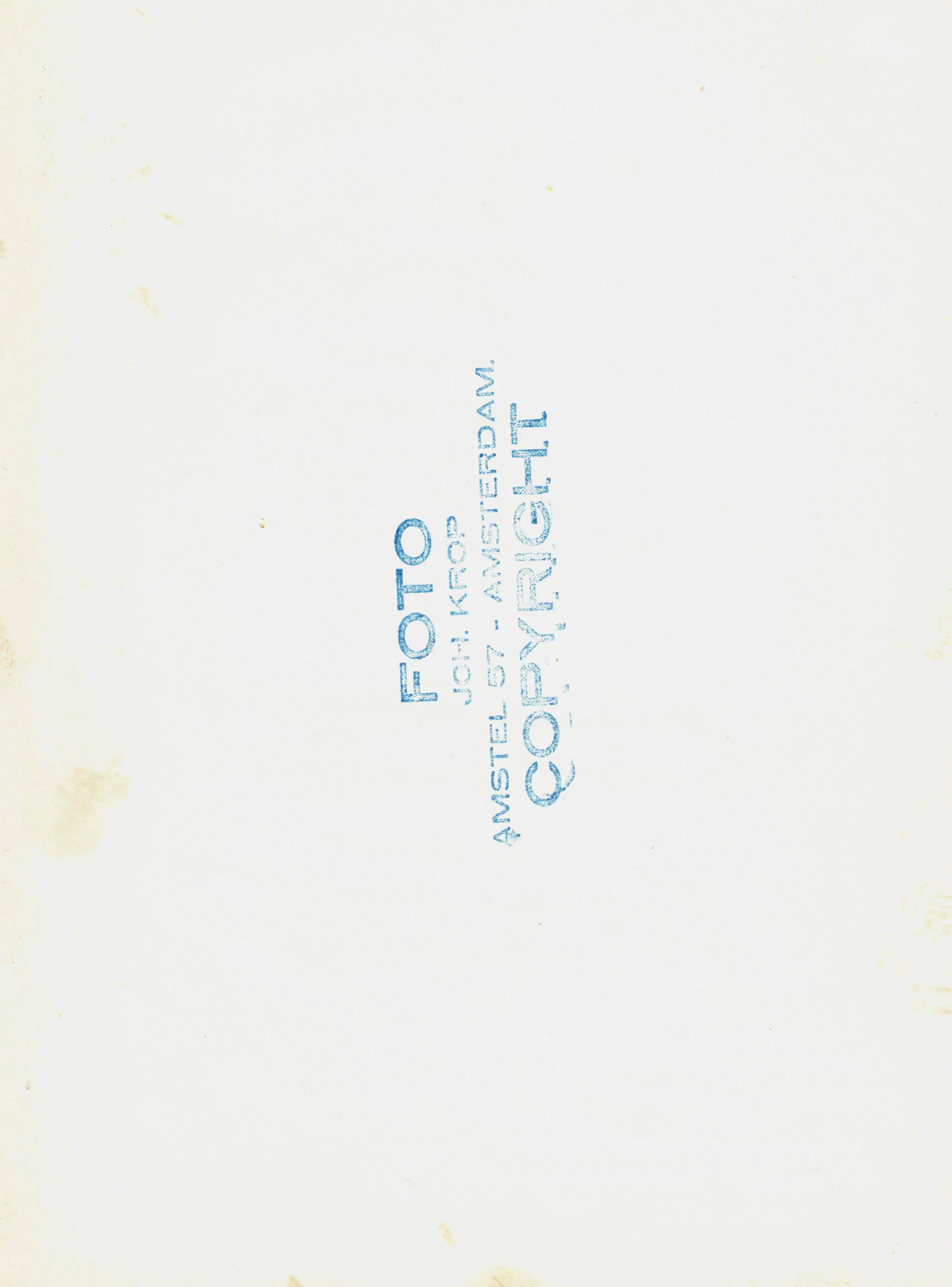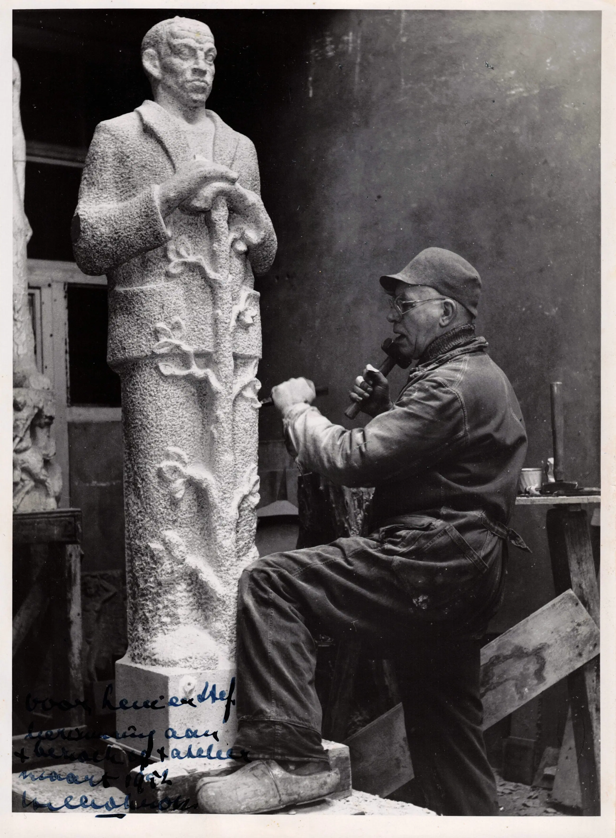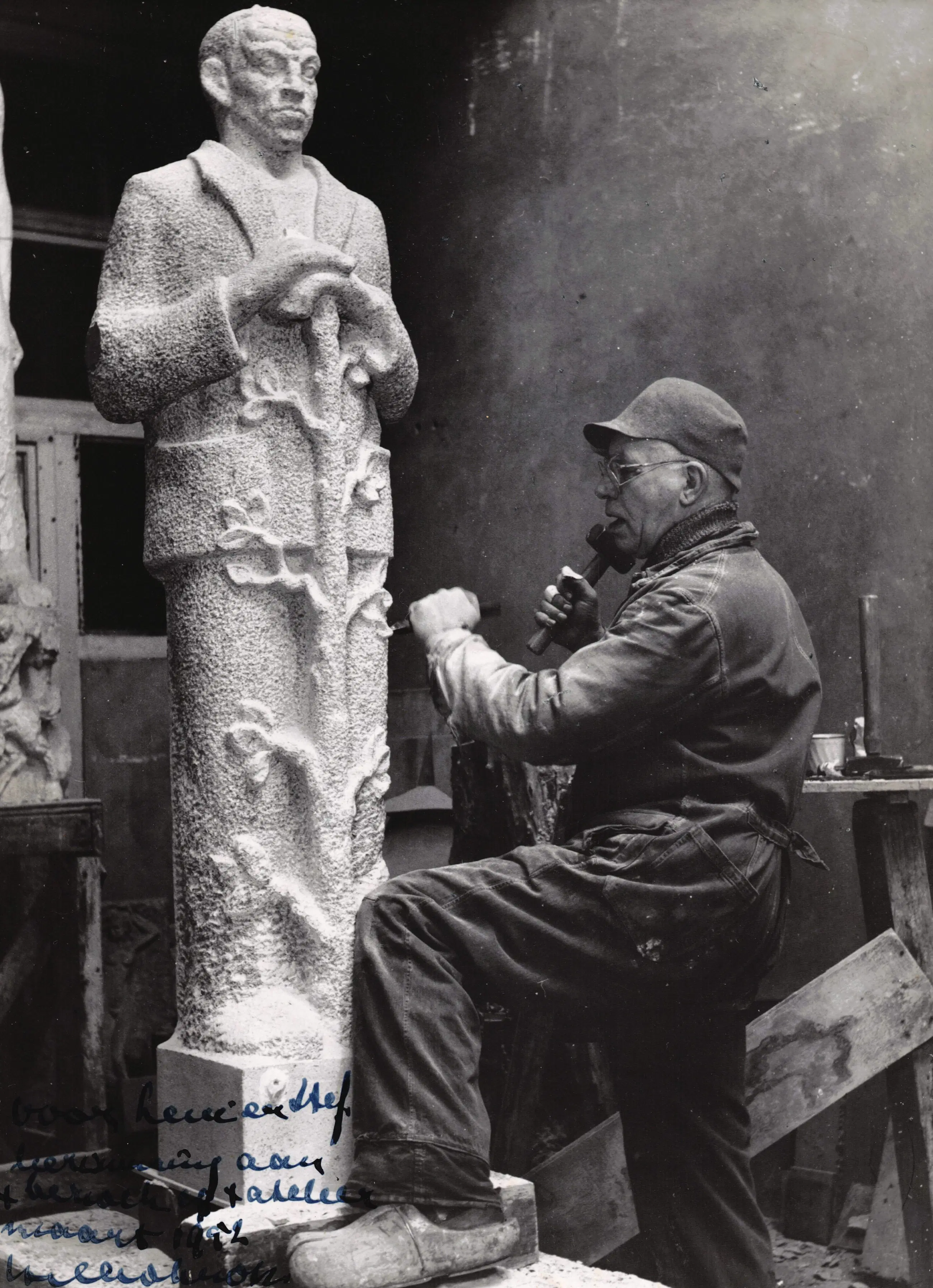Portret van Hildo Krop aan het werk in zijn atelier. Gelatinezilverdruk, gesigneerd door Hildo Krop zelf en met opdracht “Voor Leni(?) en Stef, herinnering aan t bezoek op t atelier, maart 1952” met studiostempel van zijn zoon (Johan Krop) achterop. In goede conditie.
