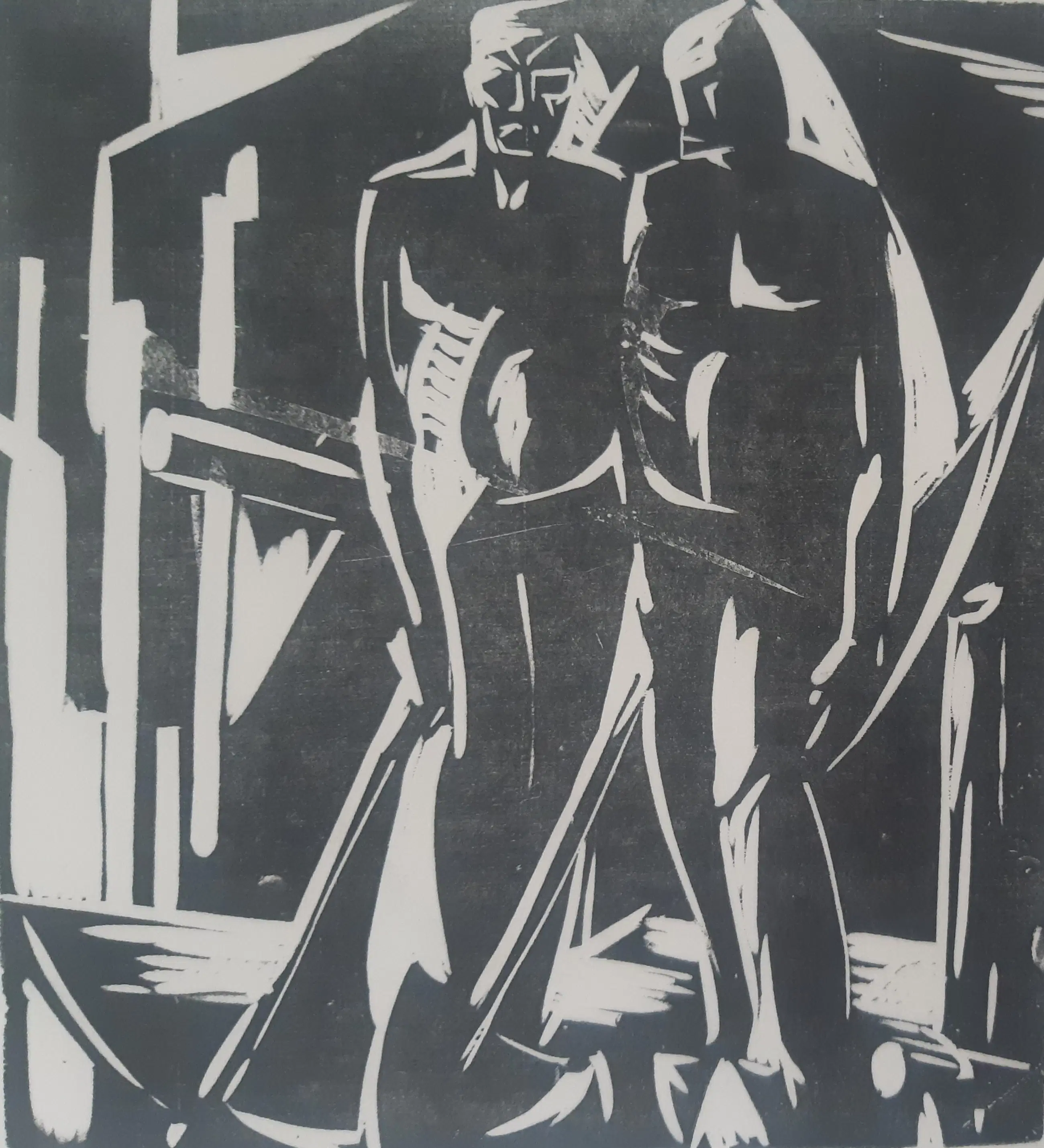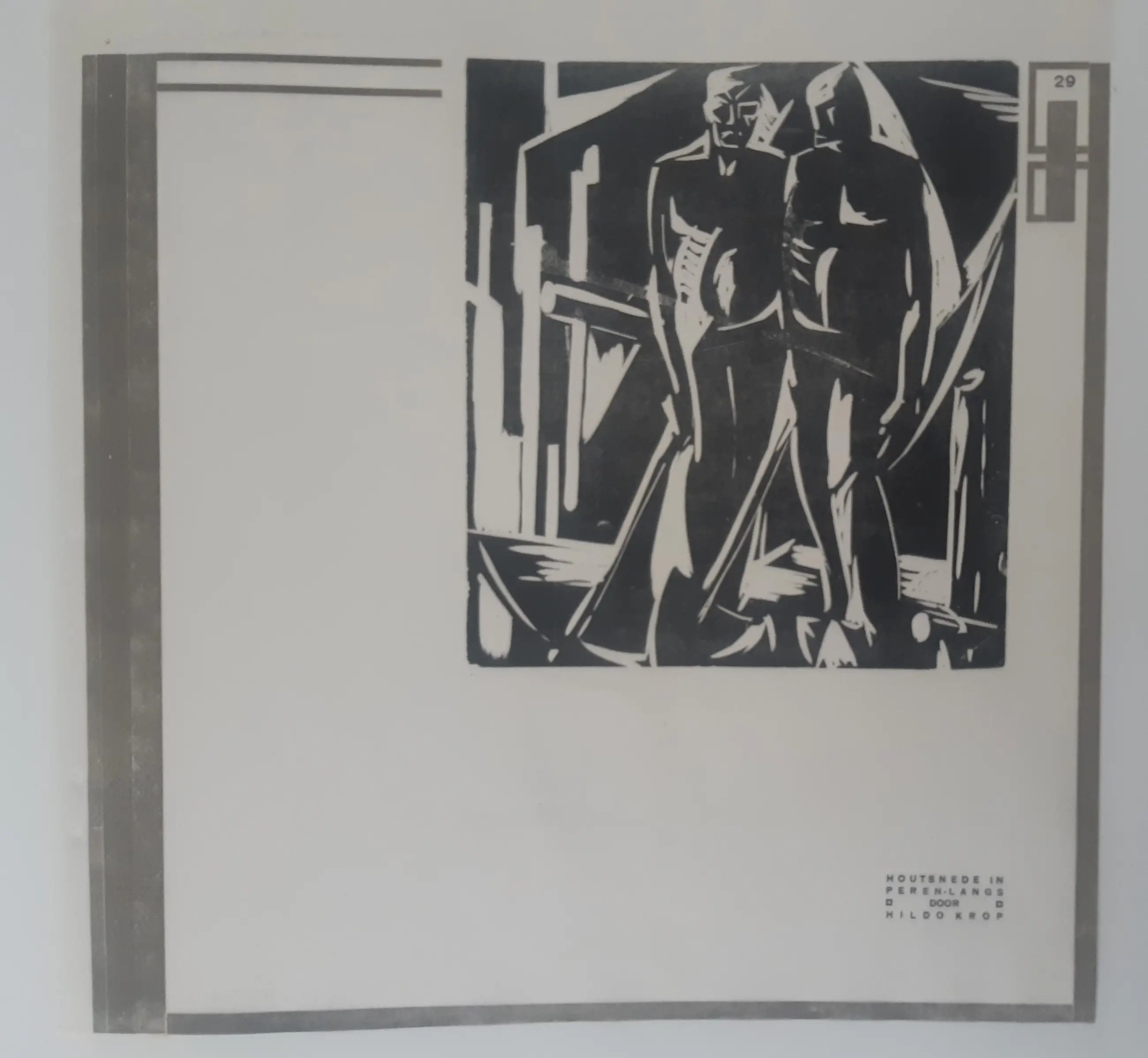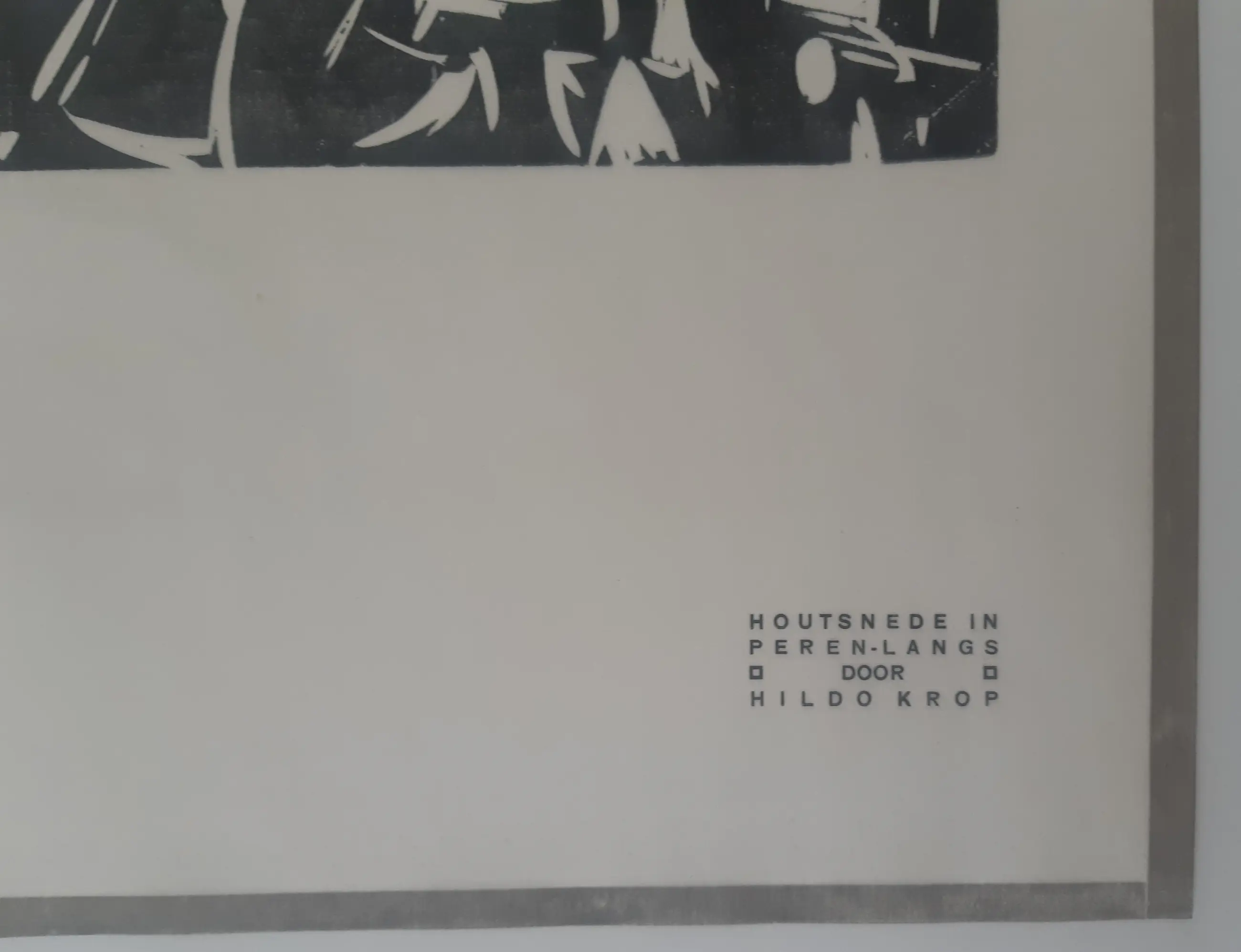 Expressionistische houtsnede van Hildo Krop, afkomstig uit het beroemde houtsnijdersnummer van het kunsttijdschrift Wendingen uit 1919. Gesneden in perenhout, gedrukt op flinterdun Japans papier. De afbeelding is 18 x 16 cm. De conditie van de kwetsbare houtsnede is zeer goed.