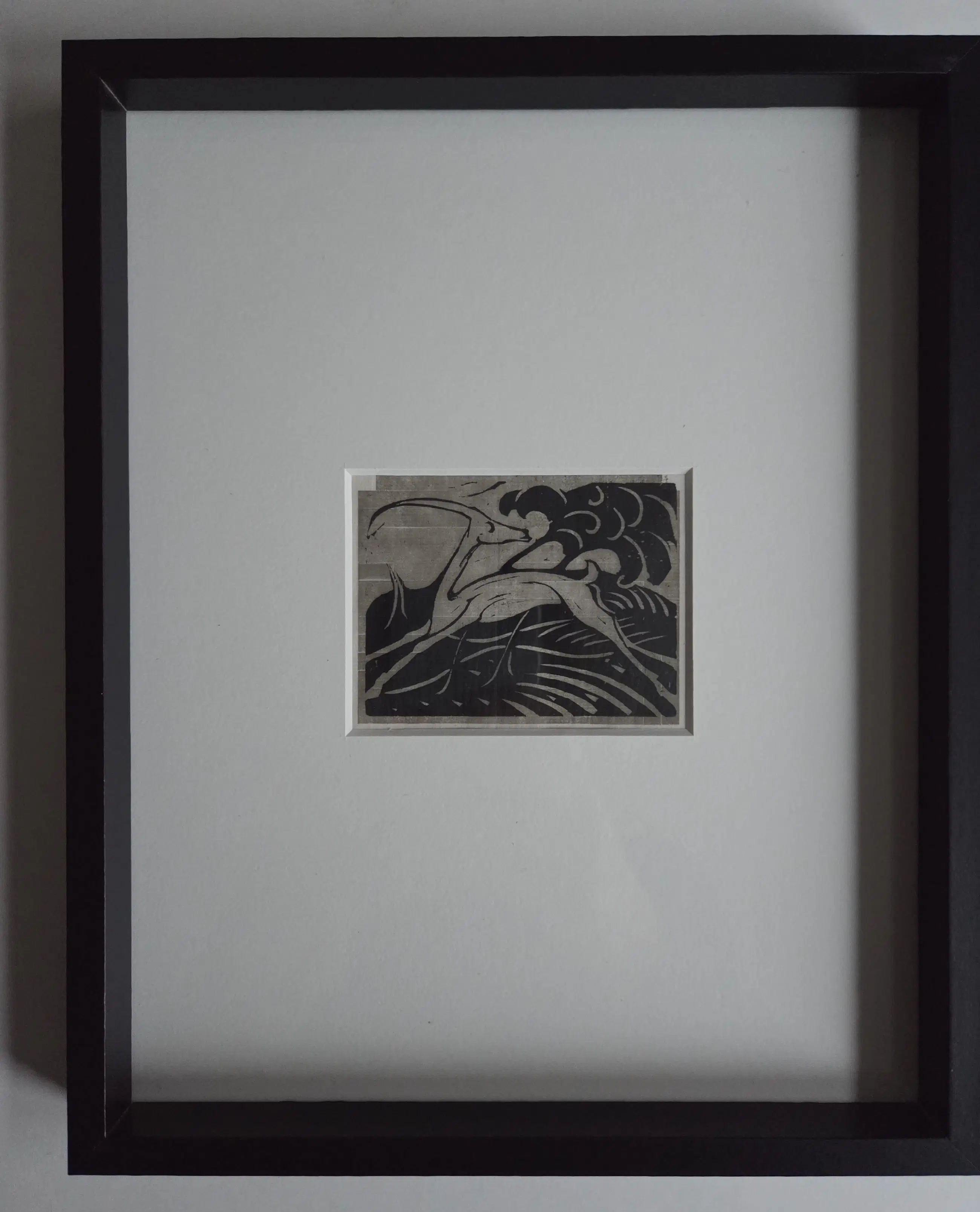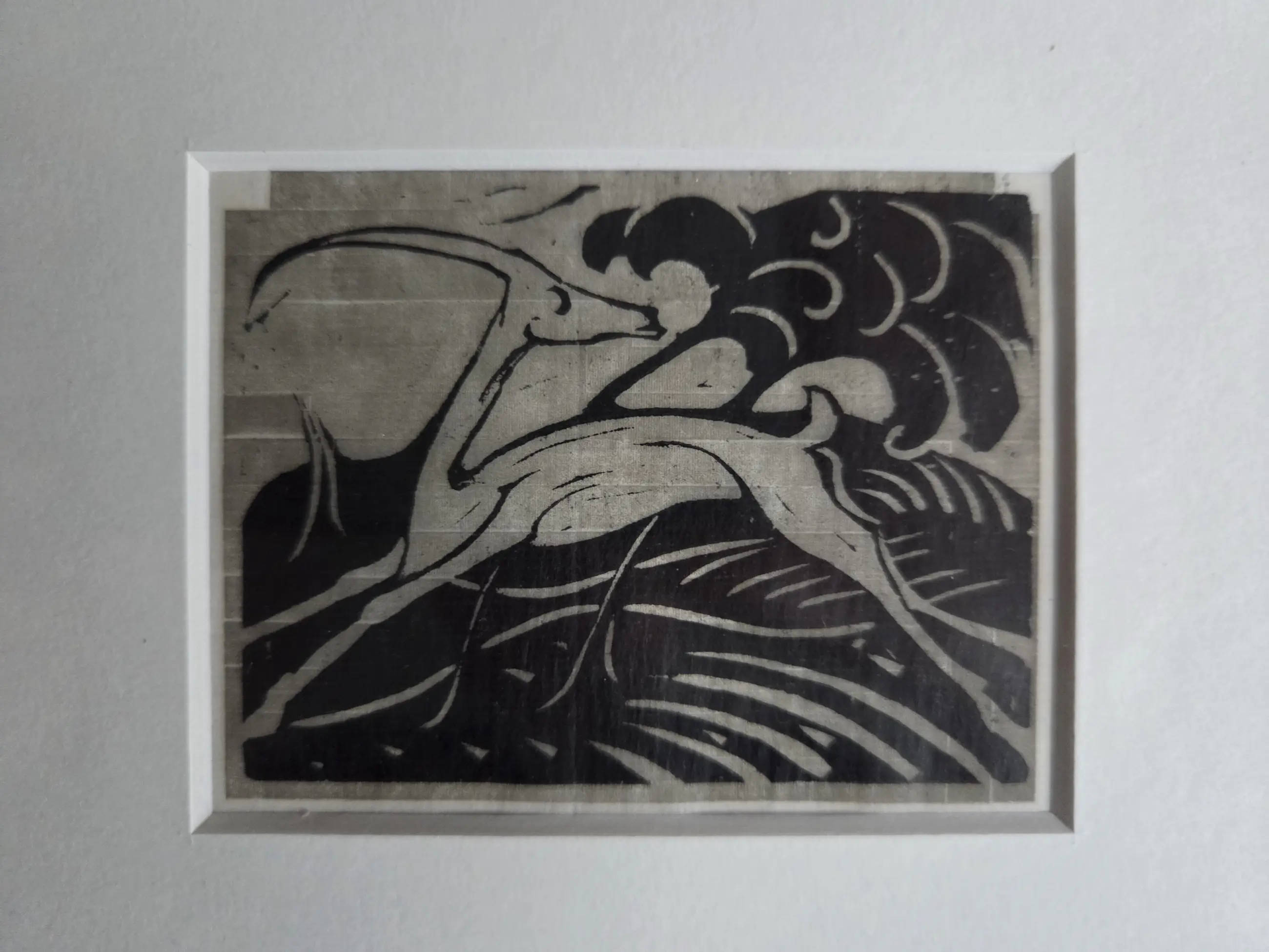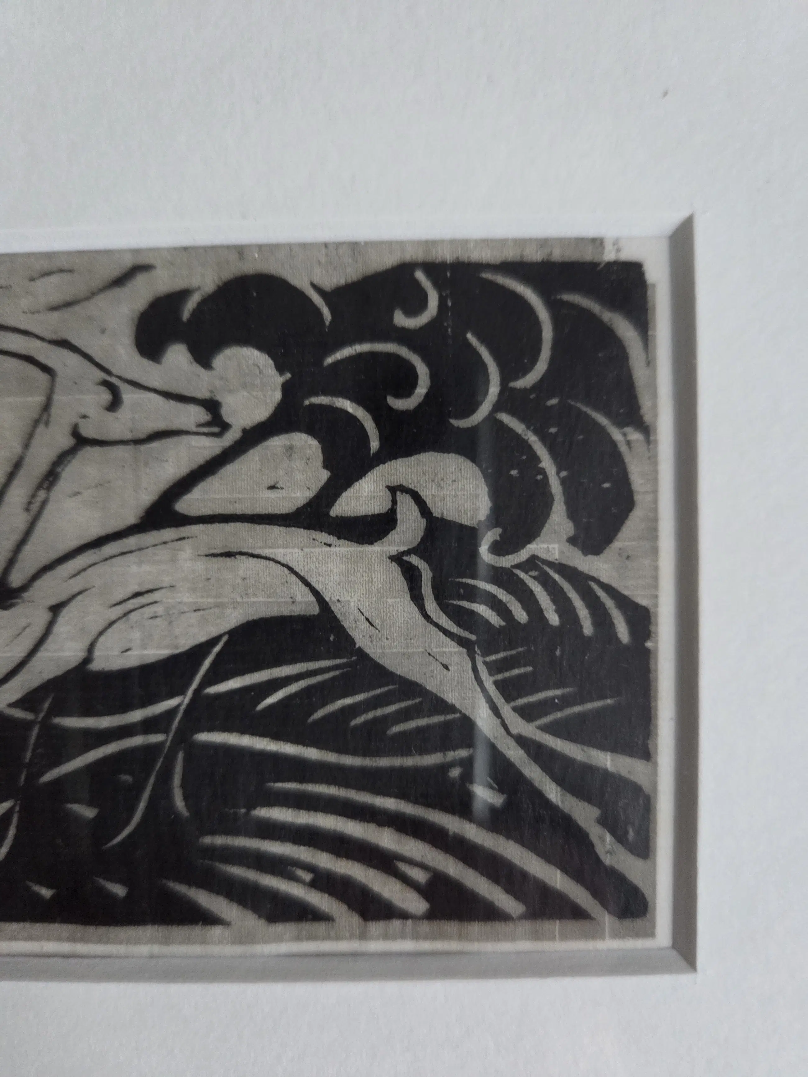 Karakteristiek werk. Herkomst Houtsnijdersnummer van Wendingen. Algemeen goede staat. Net passe partout en lijst. Zie foto's voor eigen oordeel kwaliteit.