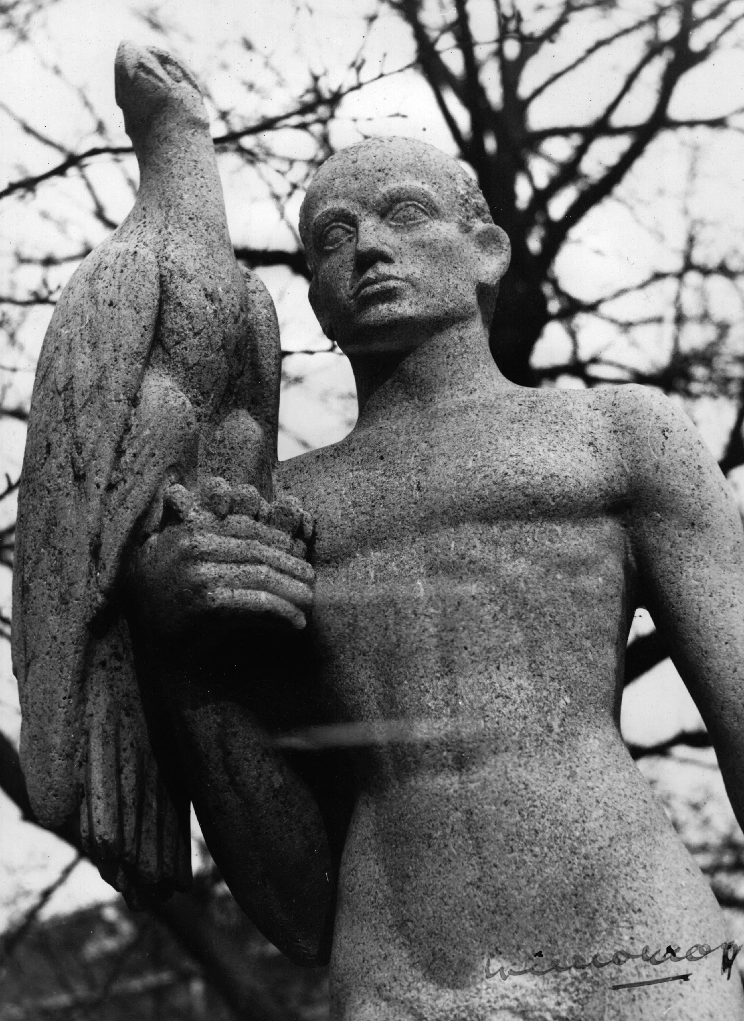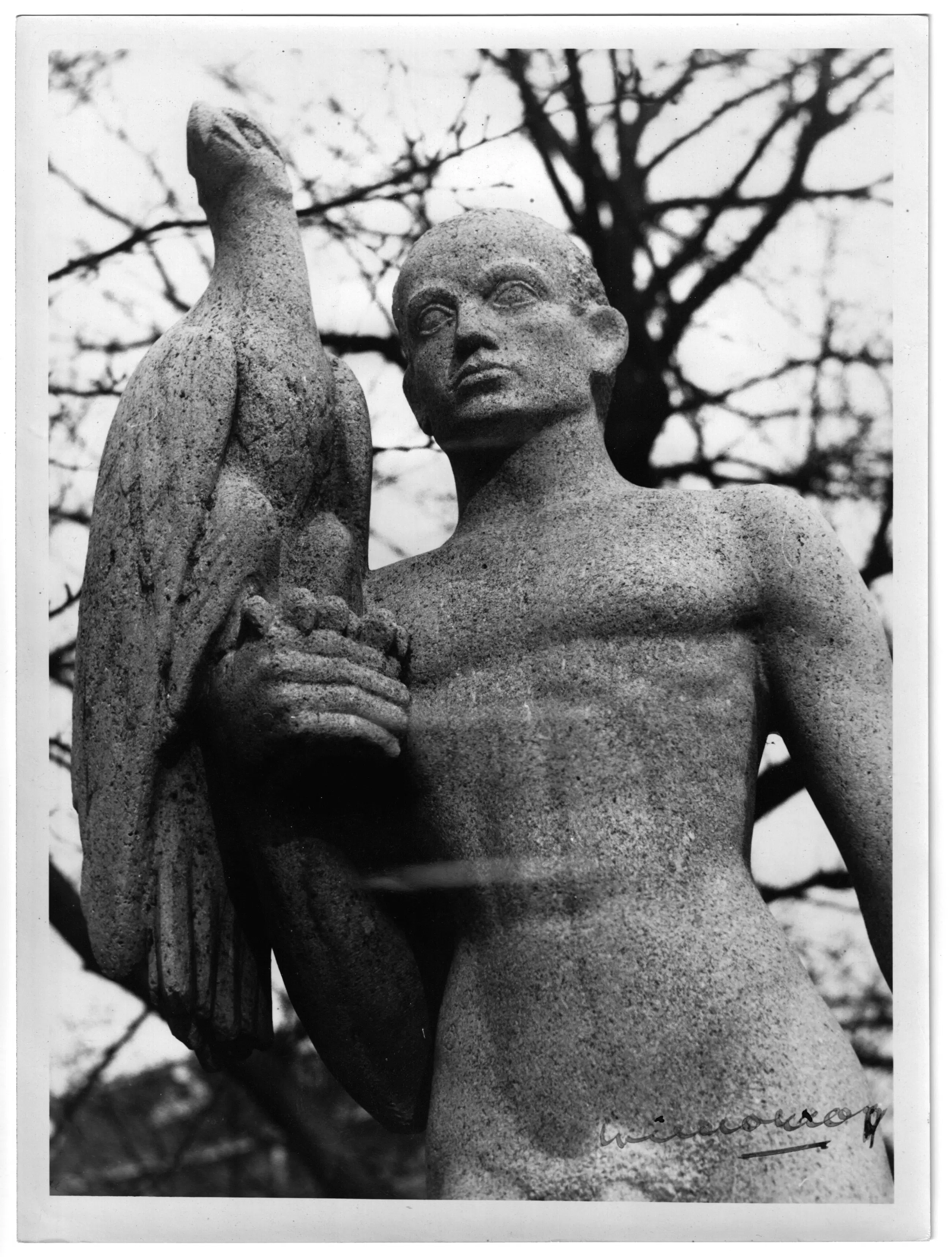 Foto van dit bekende beeld van Hildo Krop op zijn oorspronkelijke plaats in de tuin van het Wilhelmina Gasthuis in Amsterdam. Gelatinezilverdruk, gesigneerd rechtsonder door Hildo Krop zelf en met studiostempel van zijn zoon (Johan Krop) achterop. In goede conditie.
