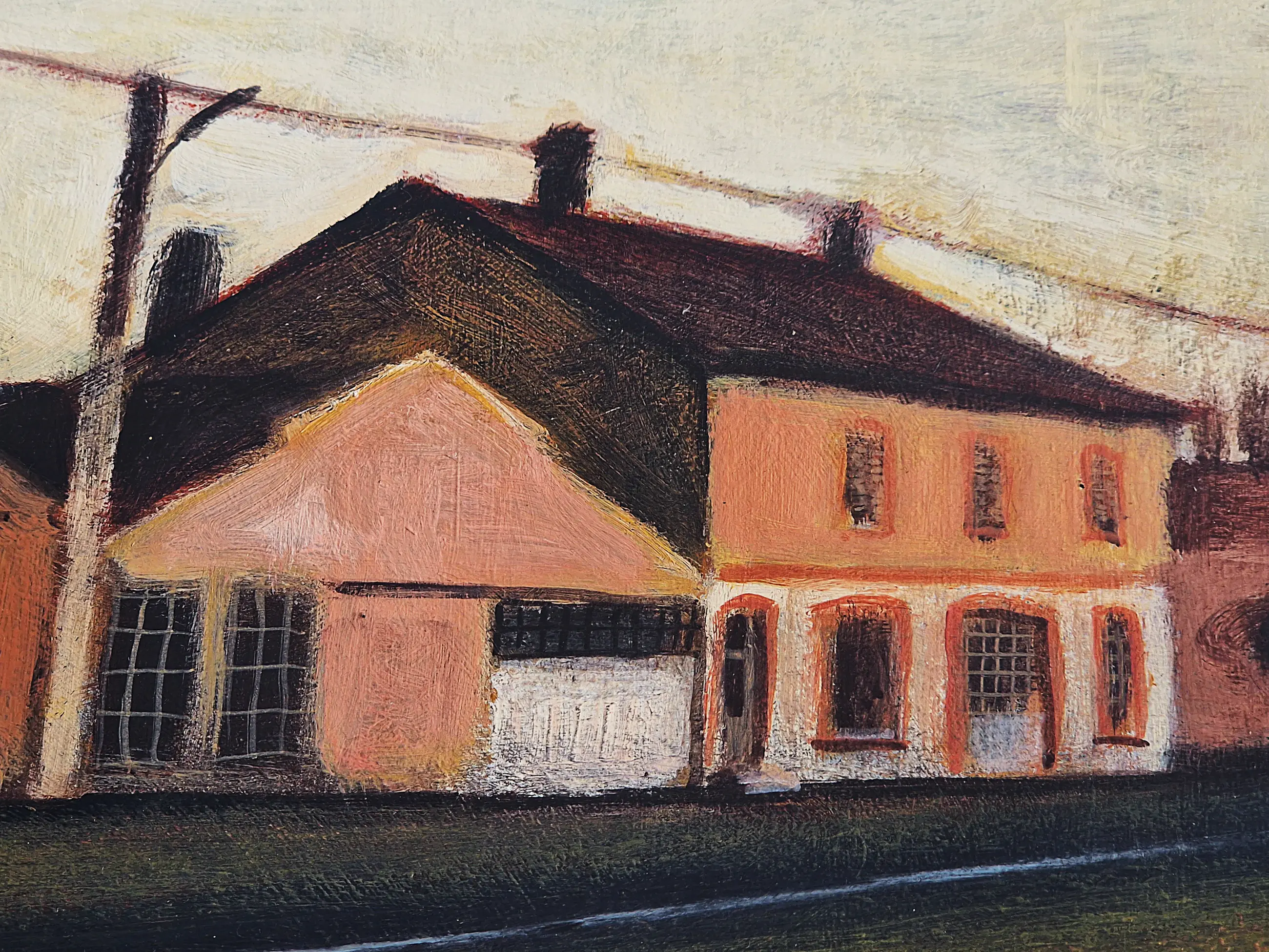 Dat komt misschien door elektriciteits- en telefoonpalen die een belangrijk verticaal bestanddeel in zijn doeken vormen. De heggen en wegen zorgen voor het horizontale element.