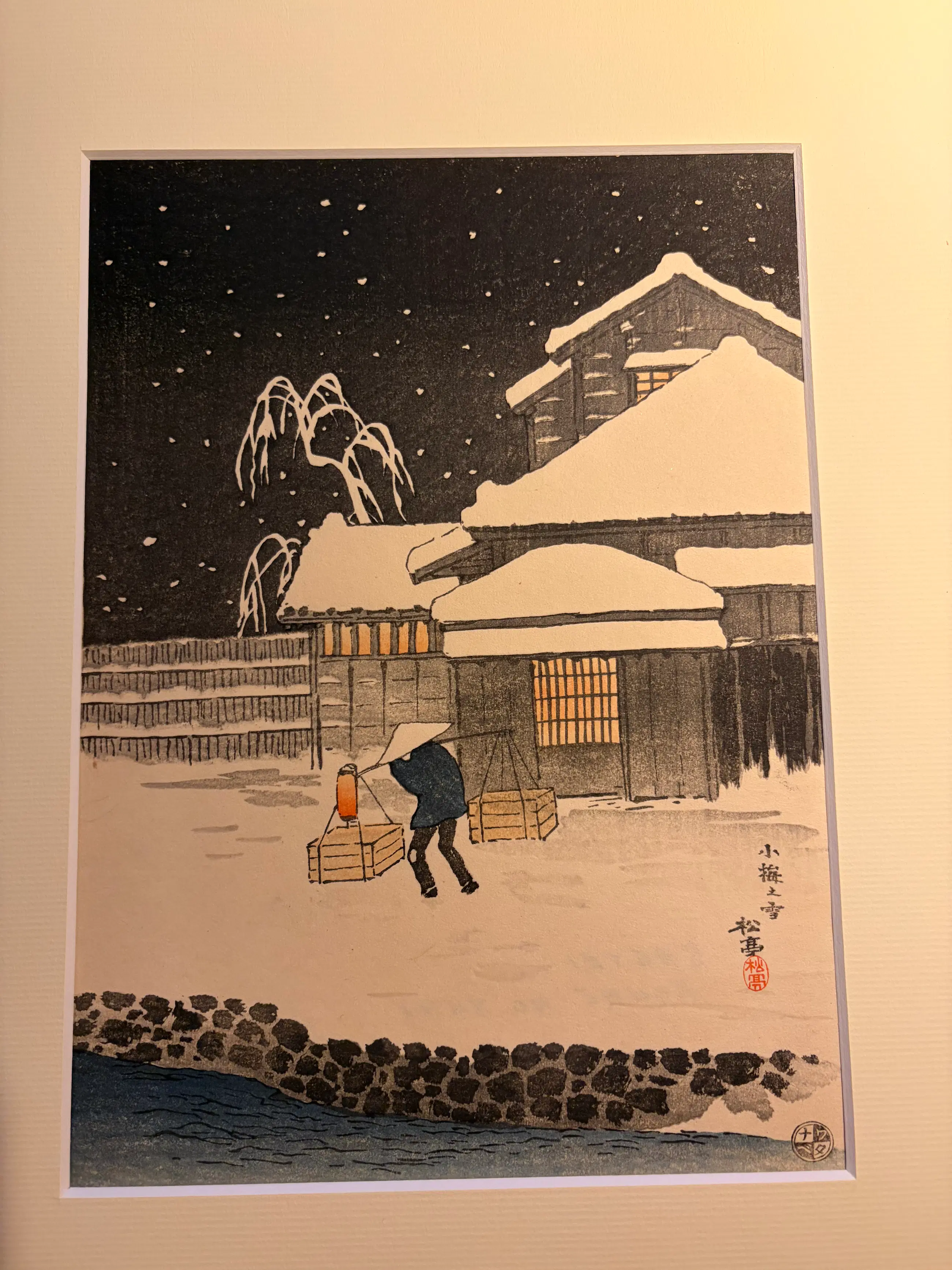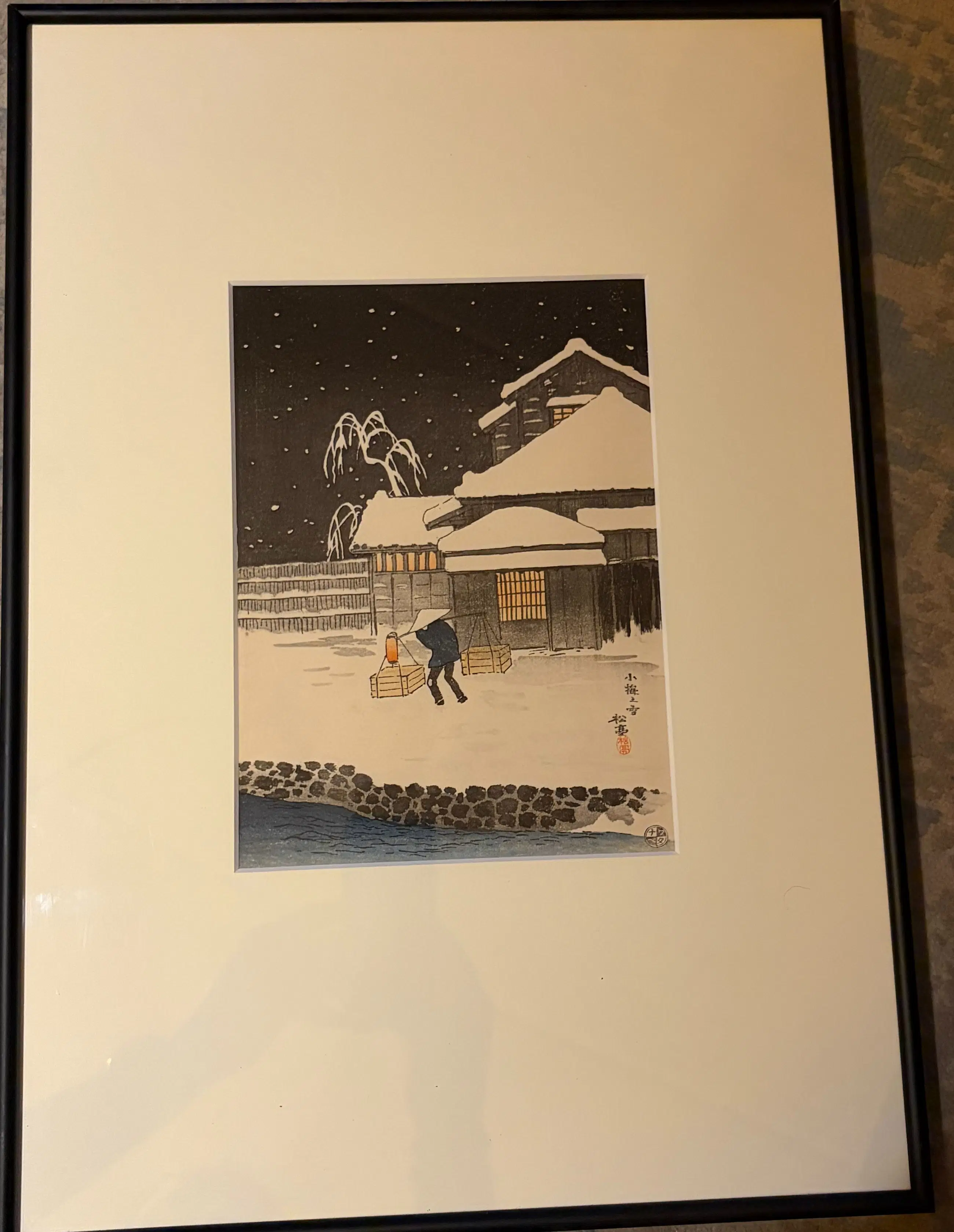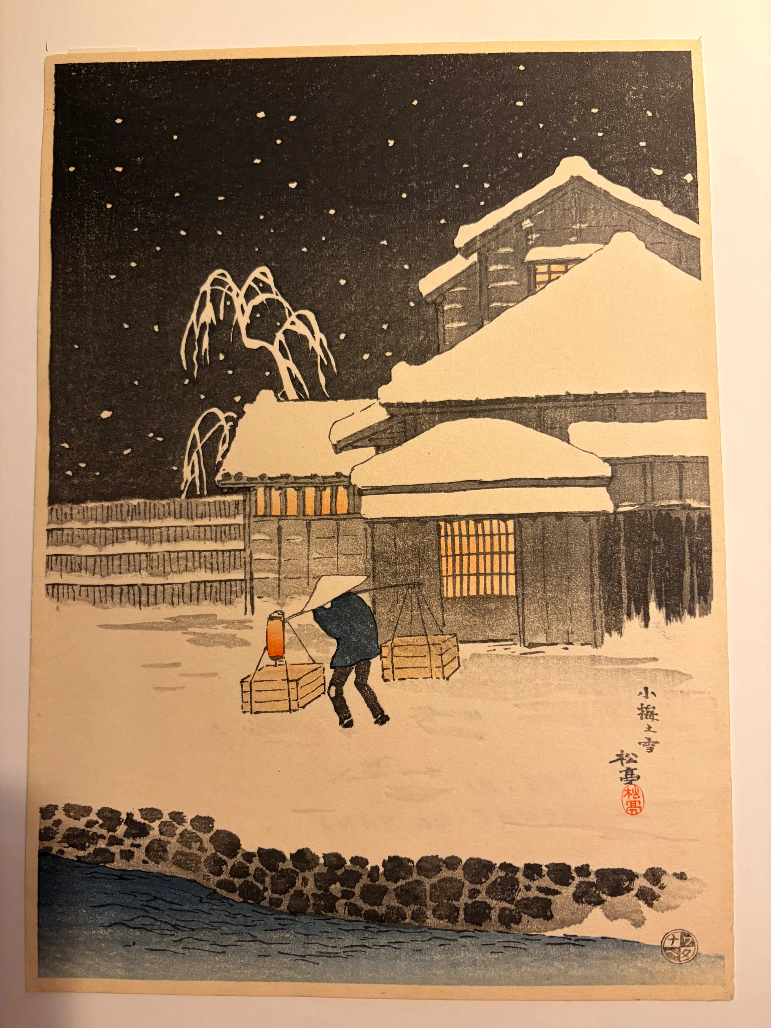 Een zeldzaam en sfeervol vroeg‑20e‑eeuws shin‑hanga meesterwerk van Takahashi Shotei. Koume in Snow toont een verstilde winteravond waarin een eenzame wandelaar zich een weg baant door een besneeuwd Japans dorp. De subtiele kleurgradaties, het vallende sneeuwmotief en de karakteristieke Watanabe‑signatuur maken dit werk een prachtig voorbeeld van Shotei’s atmosferische landschappen.