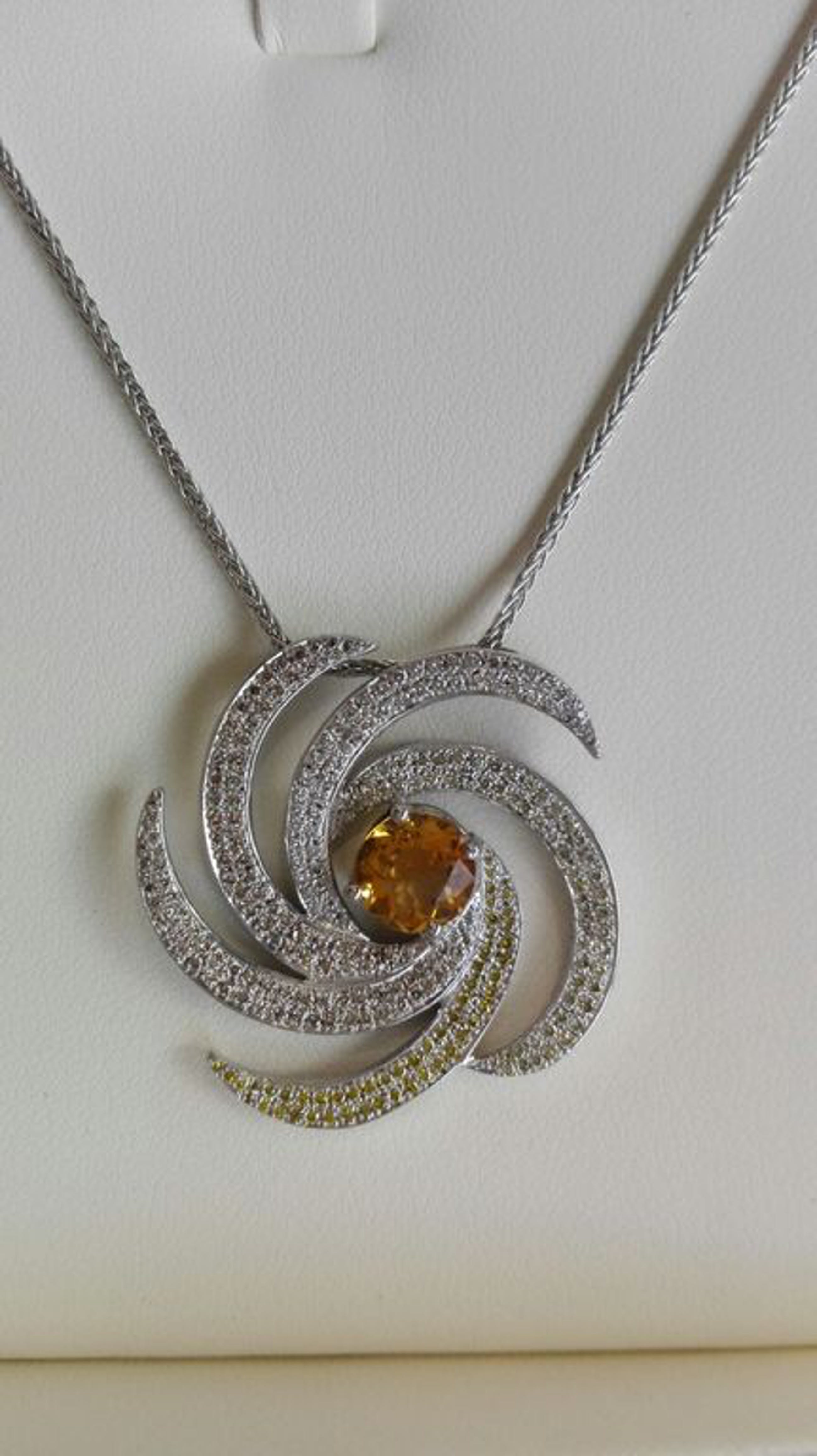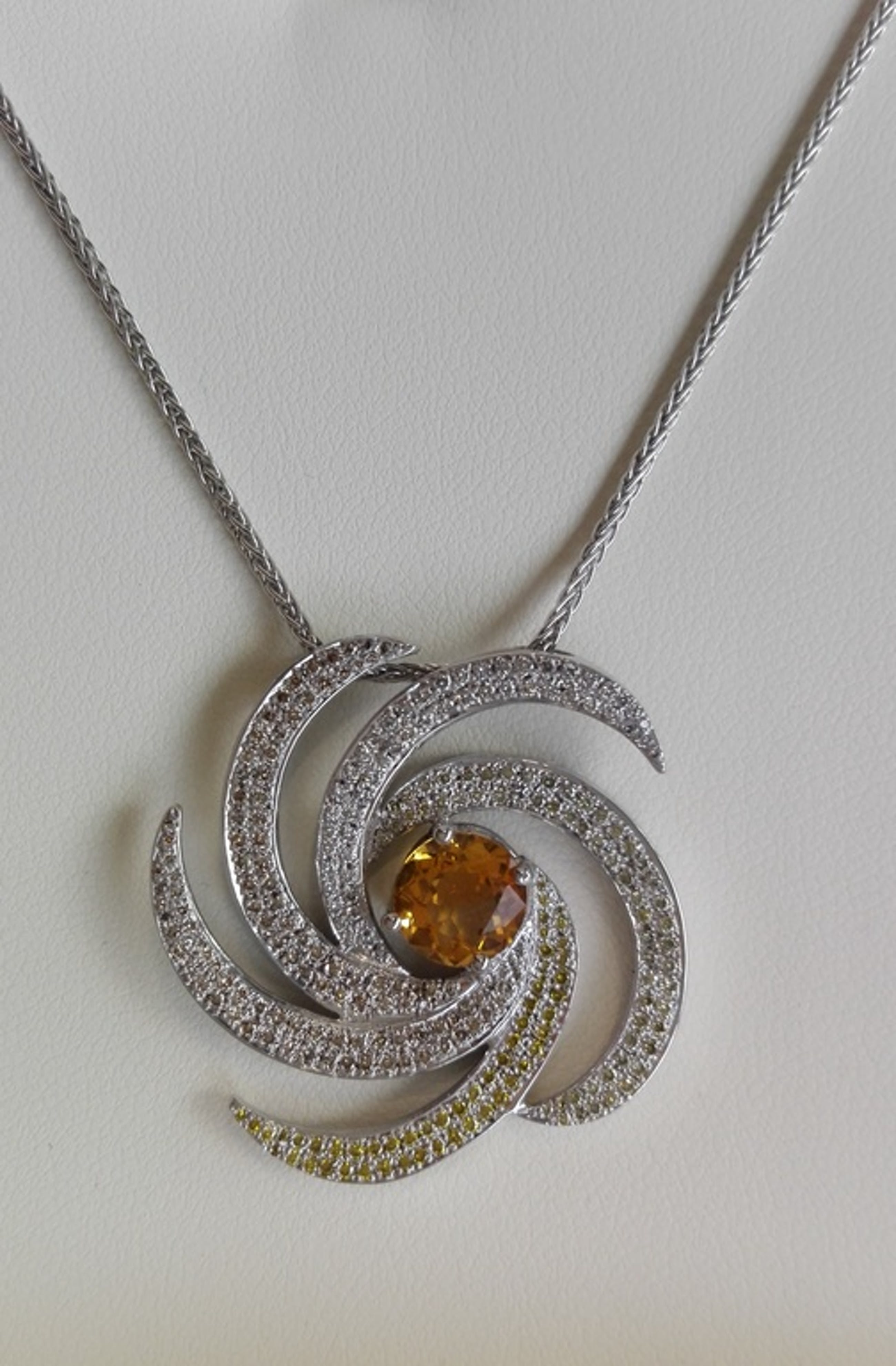 Technische fiche: 18 karaat wit AU (gouden) hanger zonmotief met centrale edelsteen