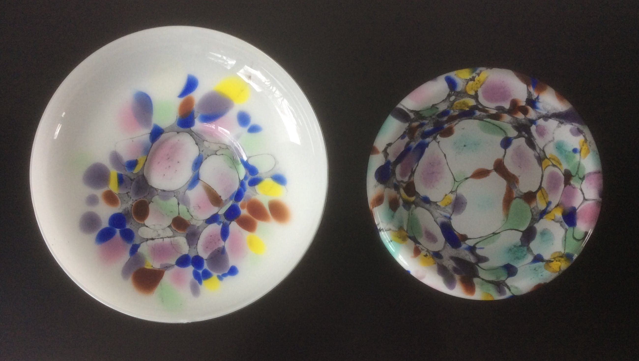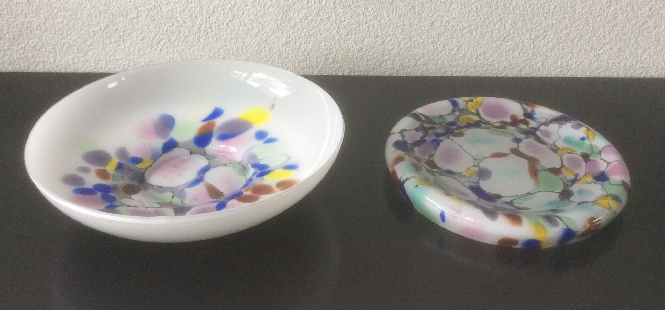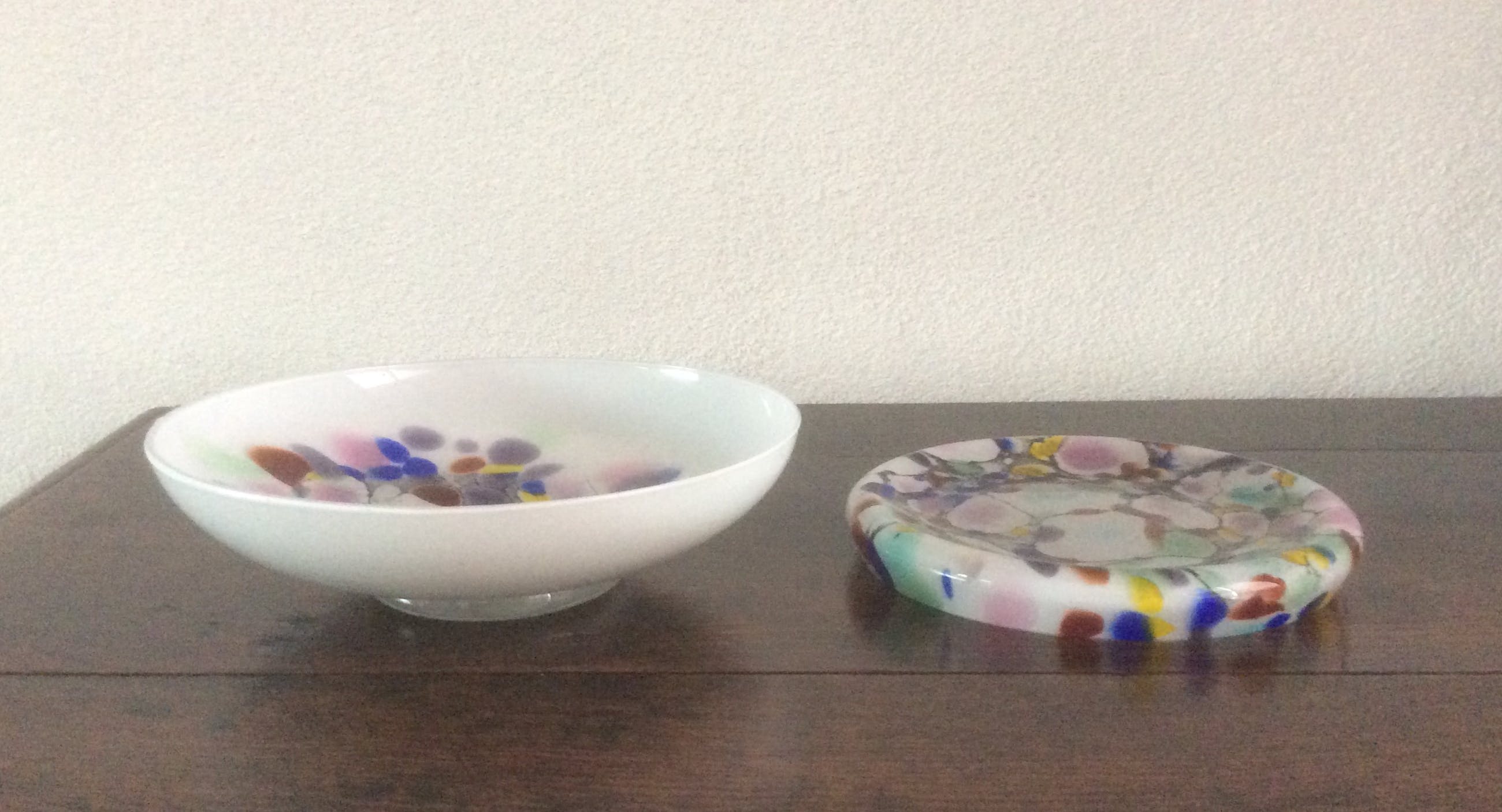 De twee glazen schalen zijn van glaskunstenaar Hans Jürgen Richartz. De kleuren van de schalen zijn in het glas ingesmolten.
