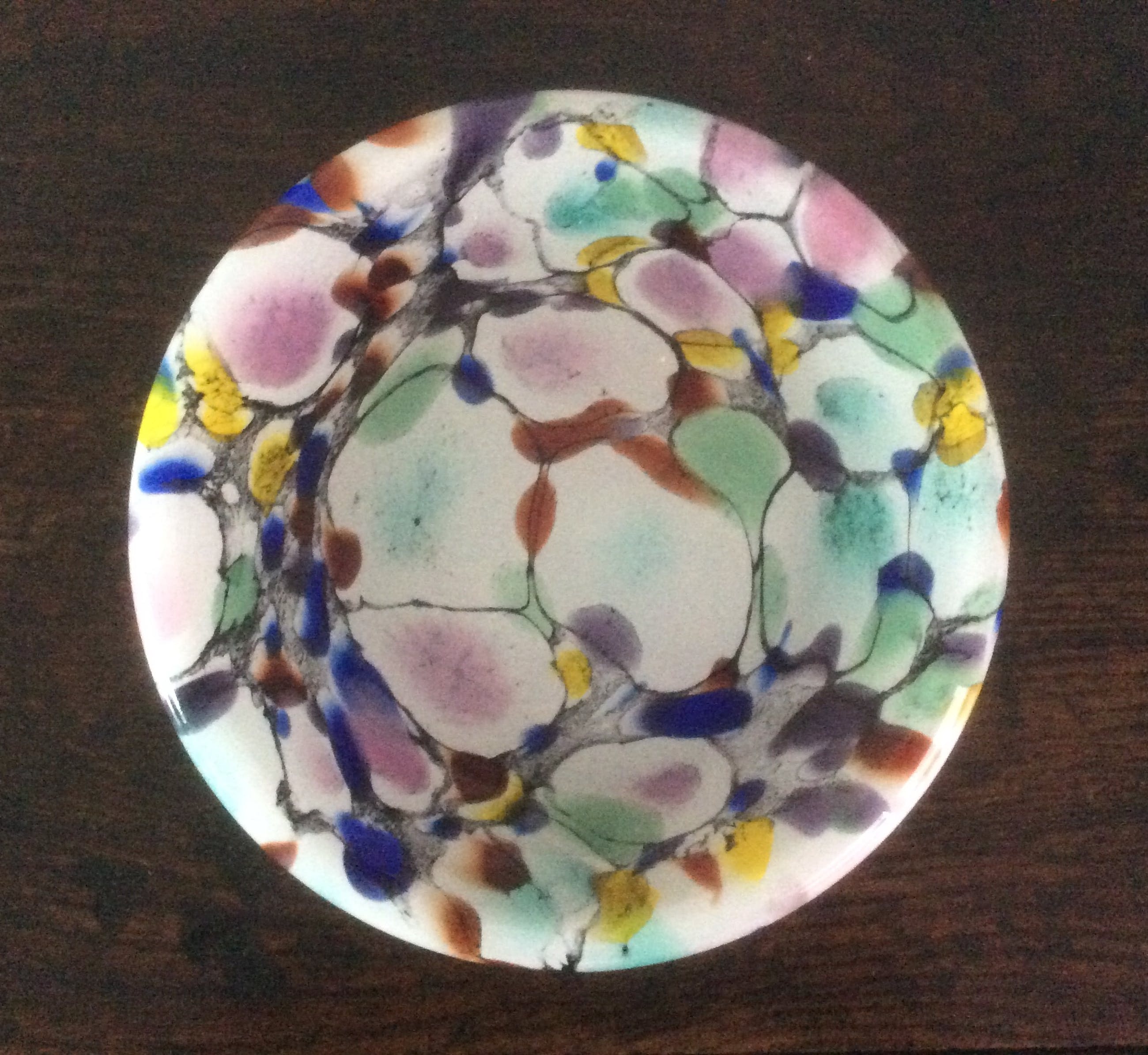 De ondiepe schaal heeft een omgevouwen rand, is 3 cm hoog en heeft een doorsnede van 22 cm.