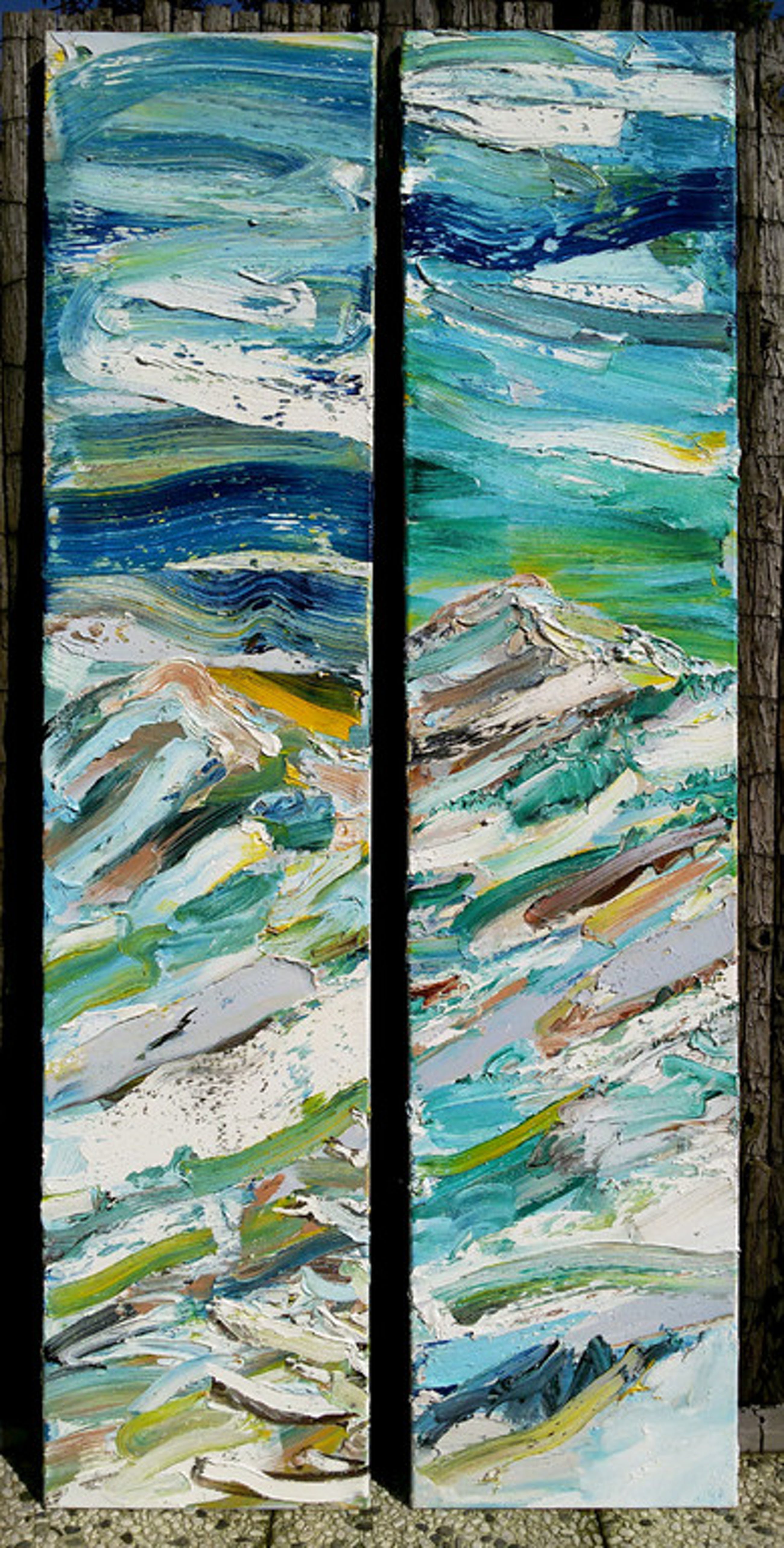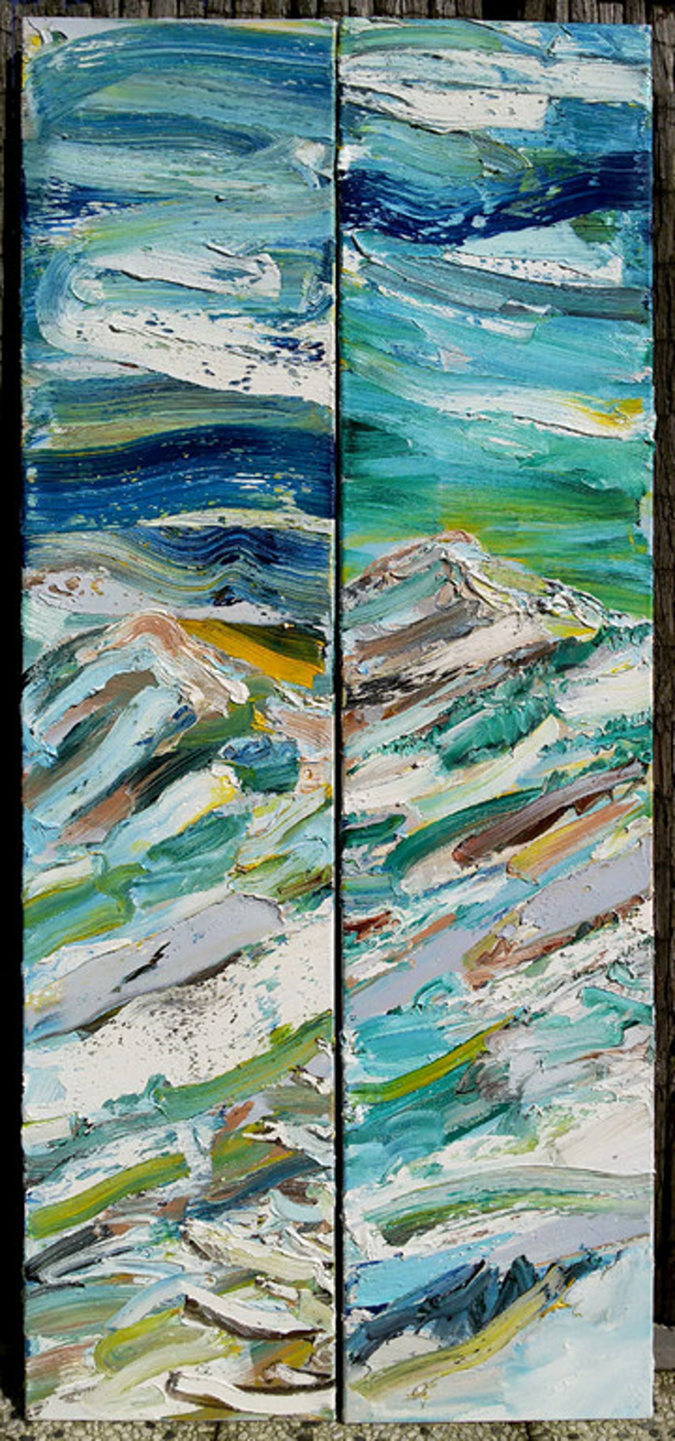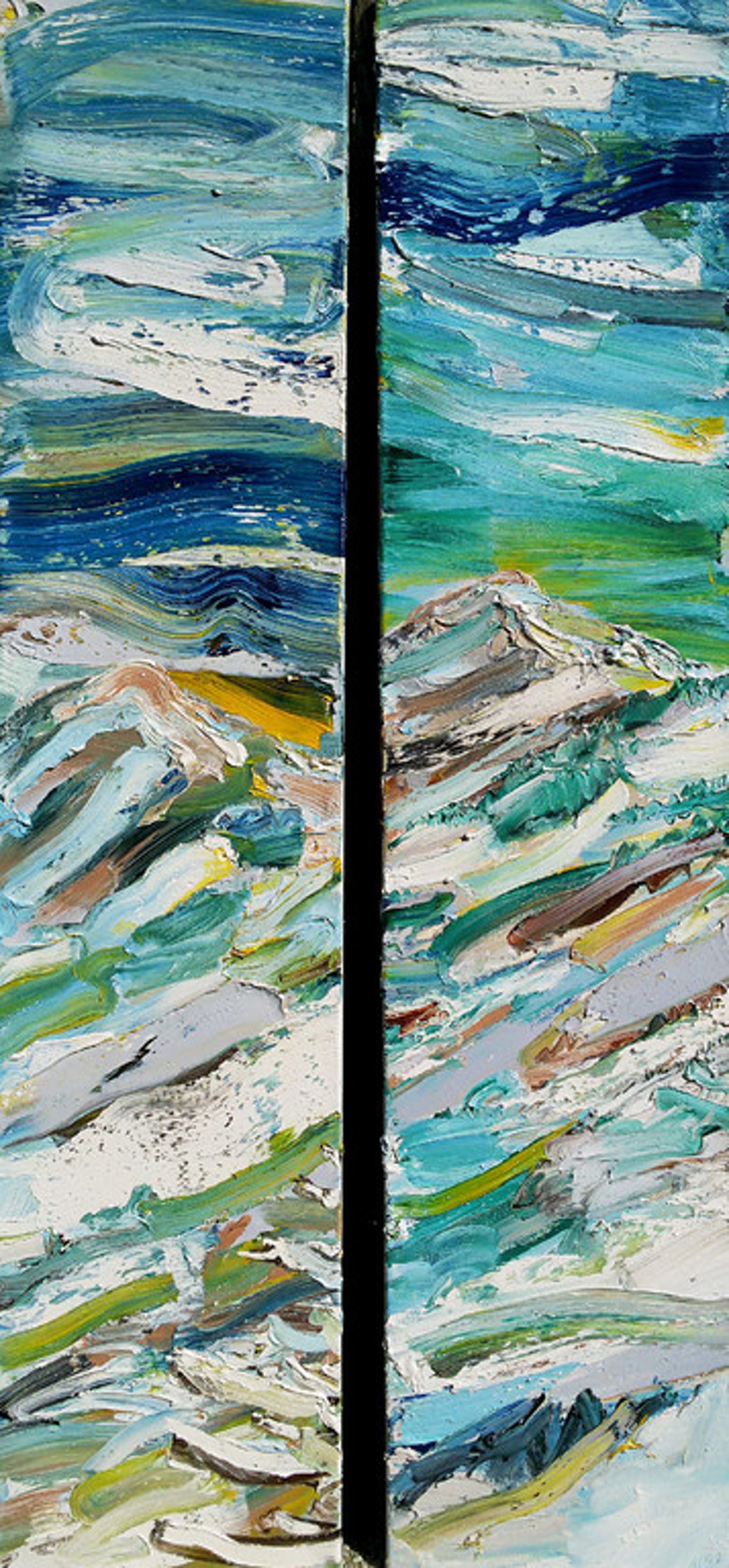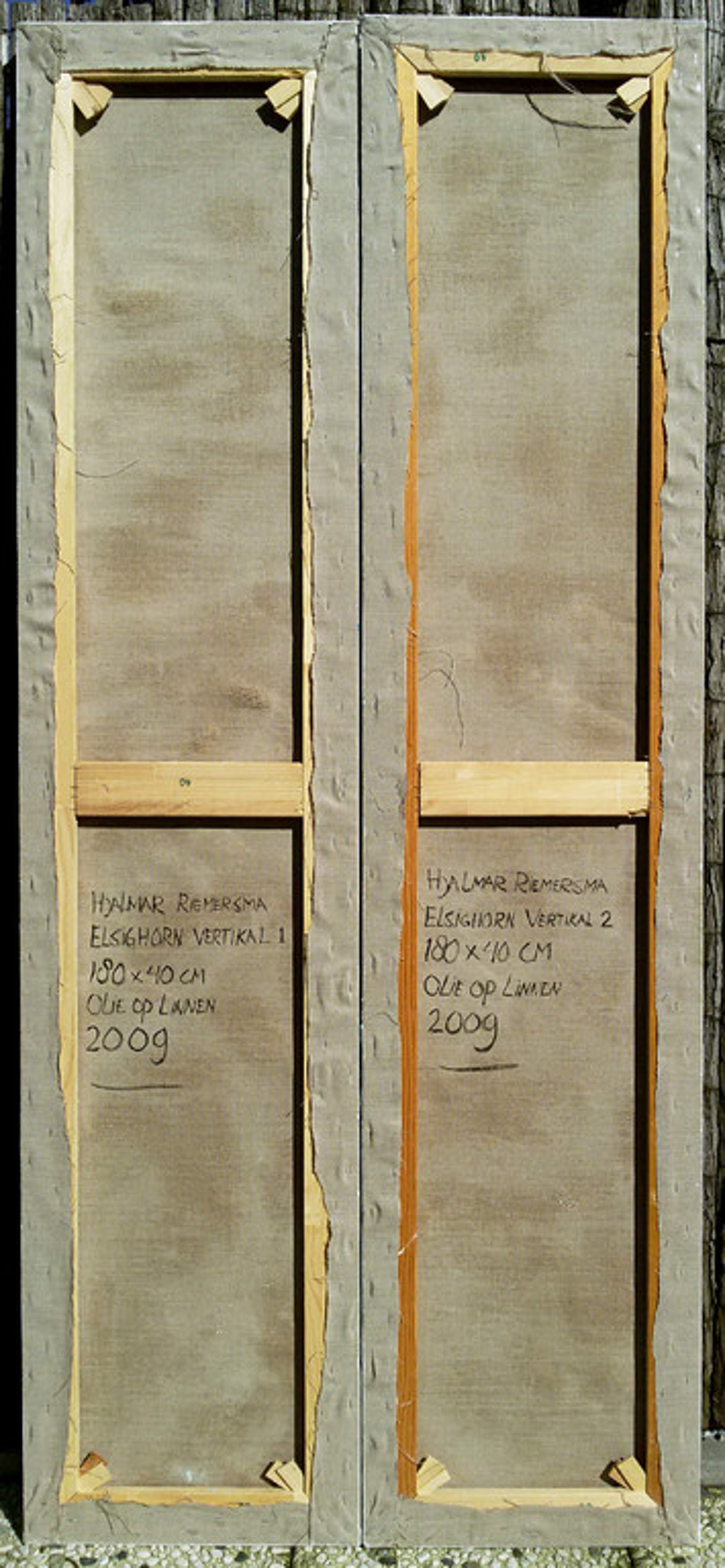 Ronduit schitterend werk van Hjalmar Riemersma, de kunstenaar die bijna geobsedeerd is door bergen. Zeer pasteus olieverf op doek, in verso gesigneerd, getiteld en gedateerd (2009). In uitstekende conditie. Op één van de foto’s is dit tweeluik te zien in Riemersma’s atelier toen hij het werk net had voltooid.