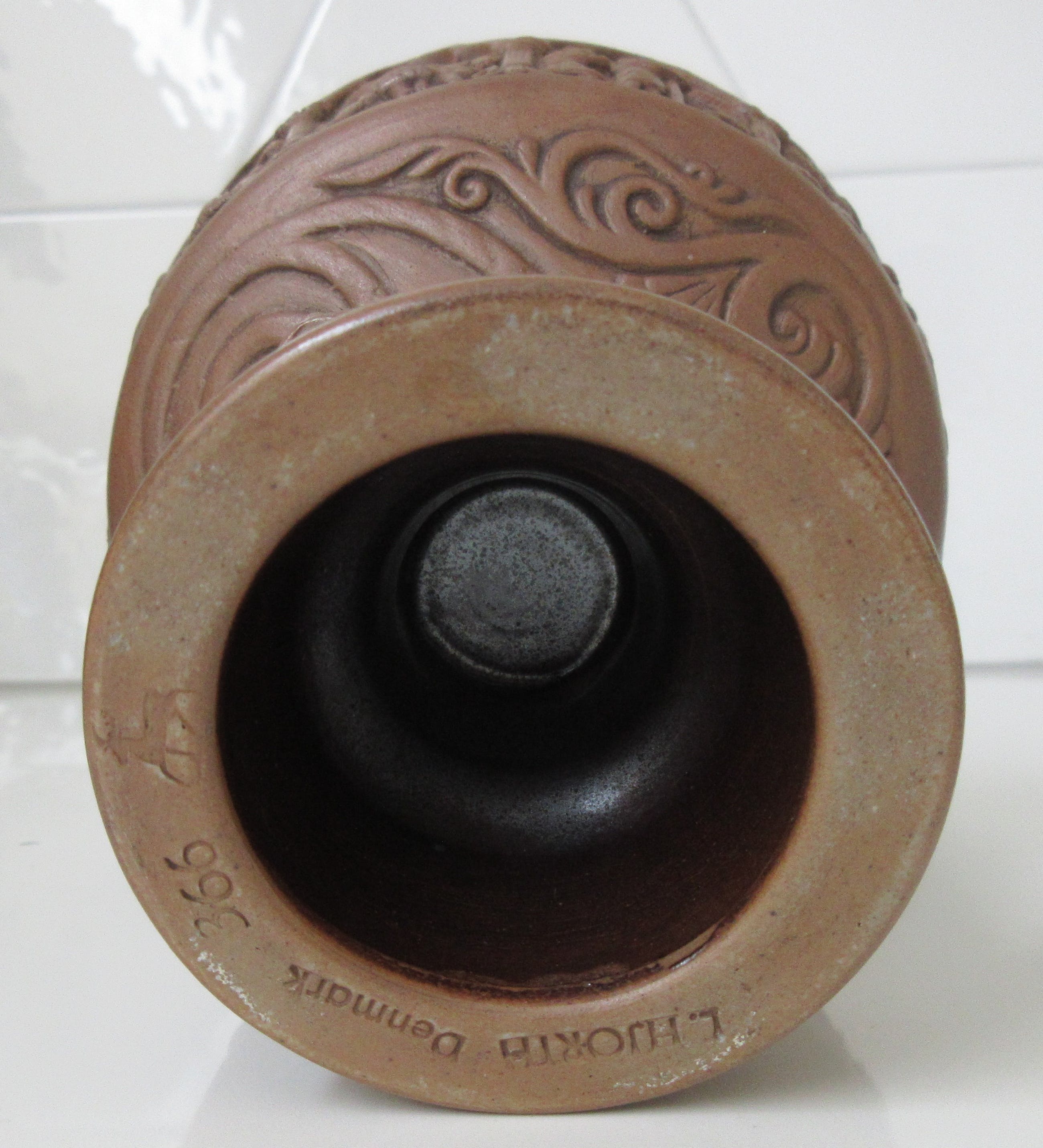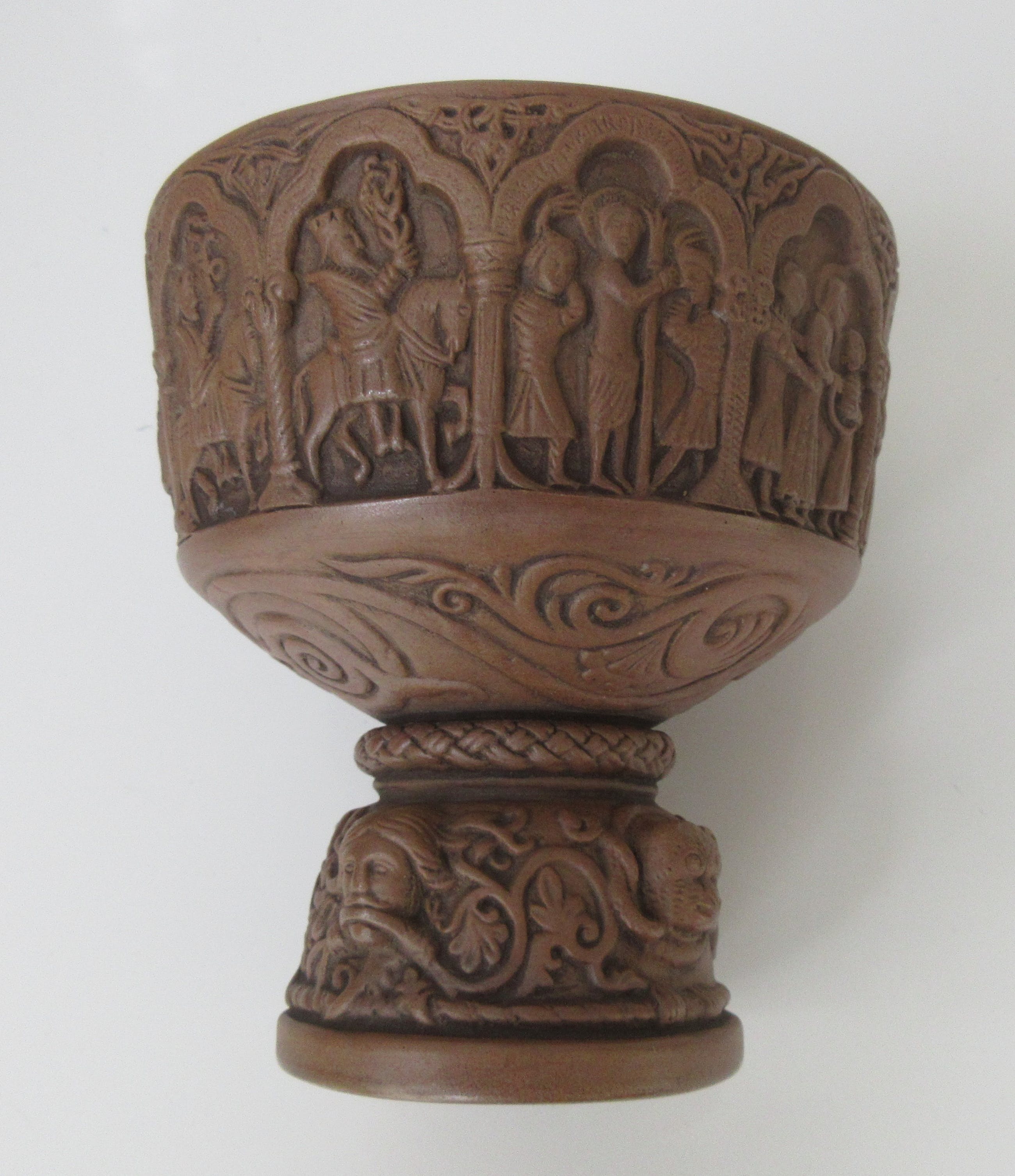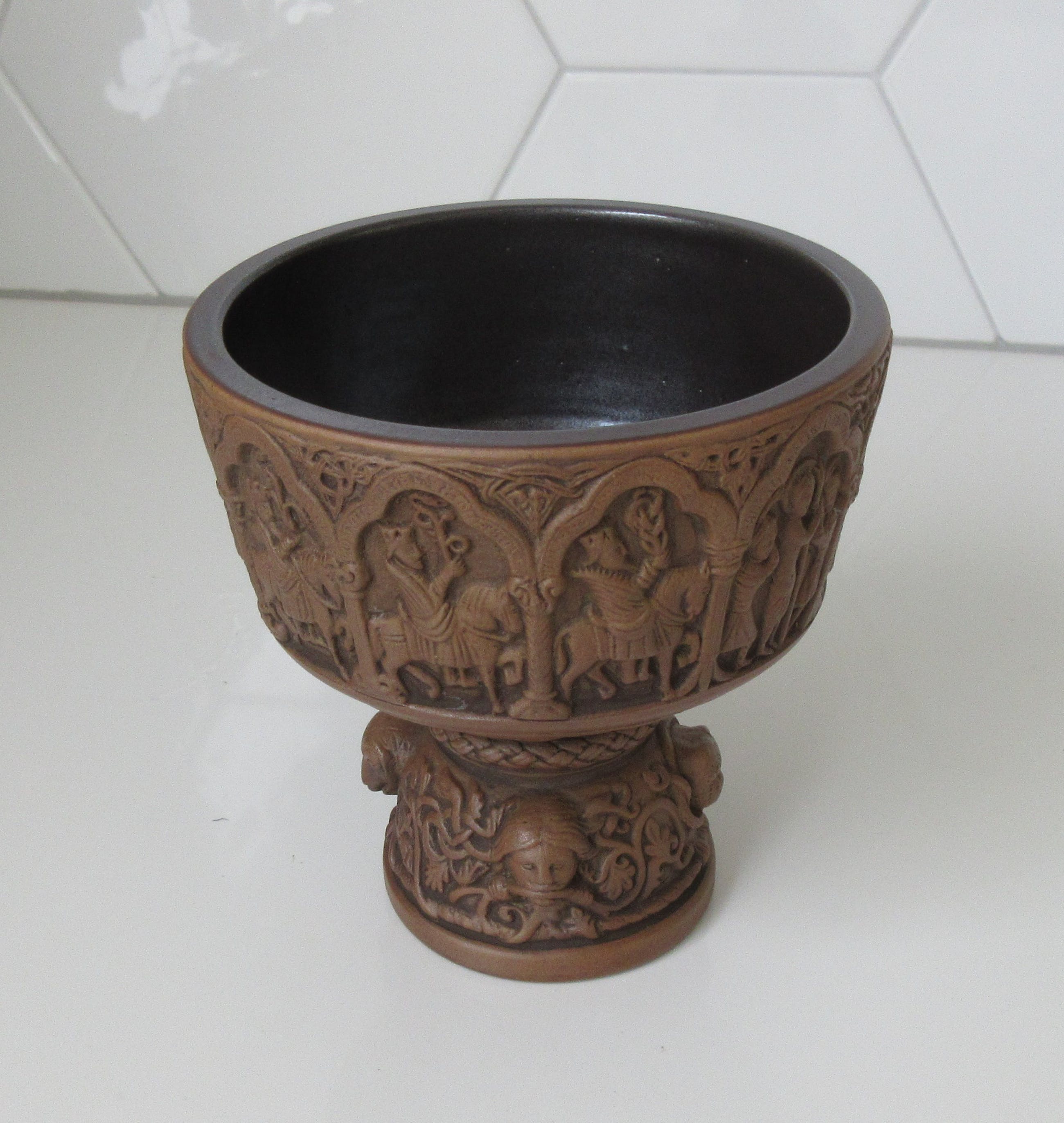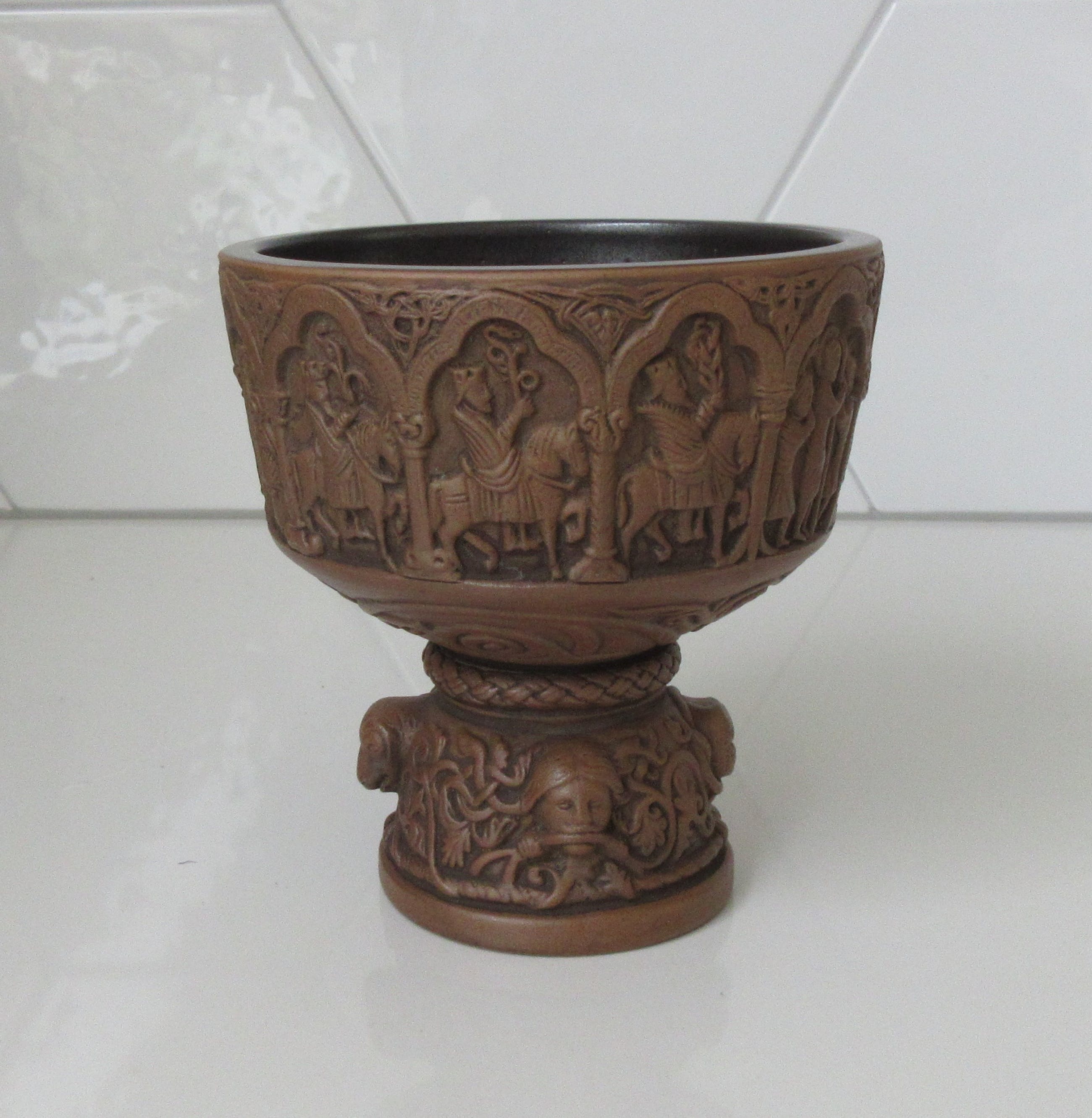 L. Hjorth - L. Hjorth - Art Nouveau Ceramic Baptist Goblet - CeramicDenmark - 1862 - 1880Between 1862 and 1880 Hjorth ware was represented in world exhibitions and was highly popular in the big departement stores of Paris, London, New York and far away as Australia and The United States. This has 11 different biblical scenens aroud The top. The Base has 3 serpents and a man wish snakes in their mouths.