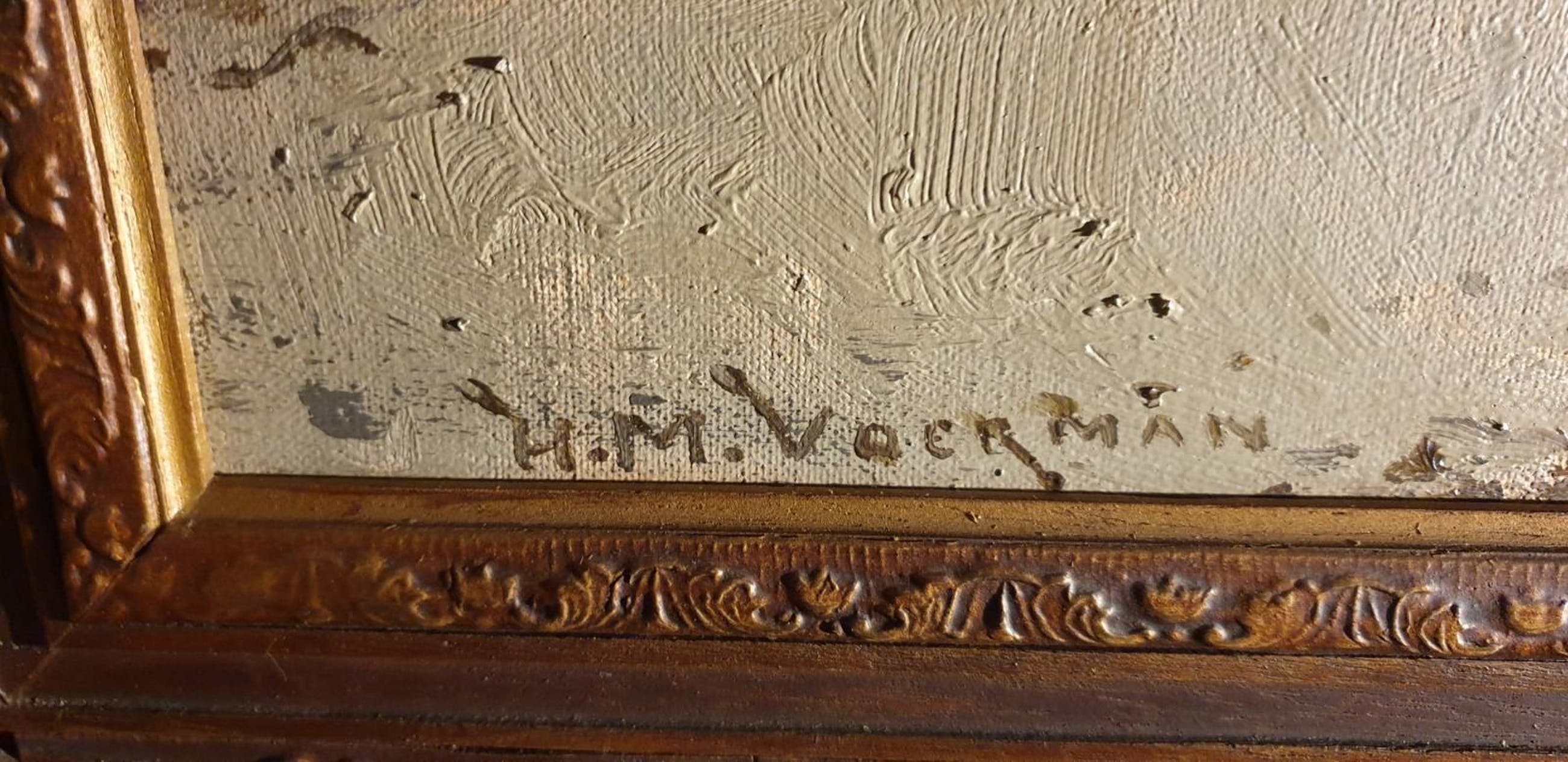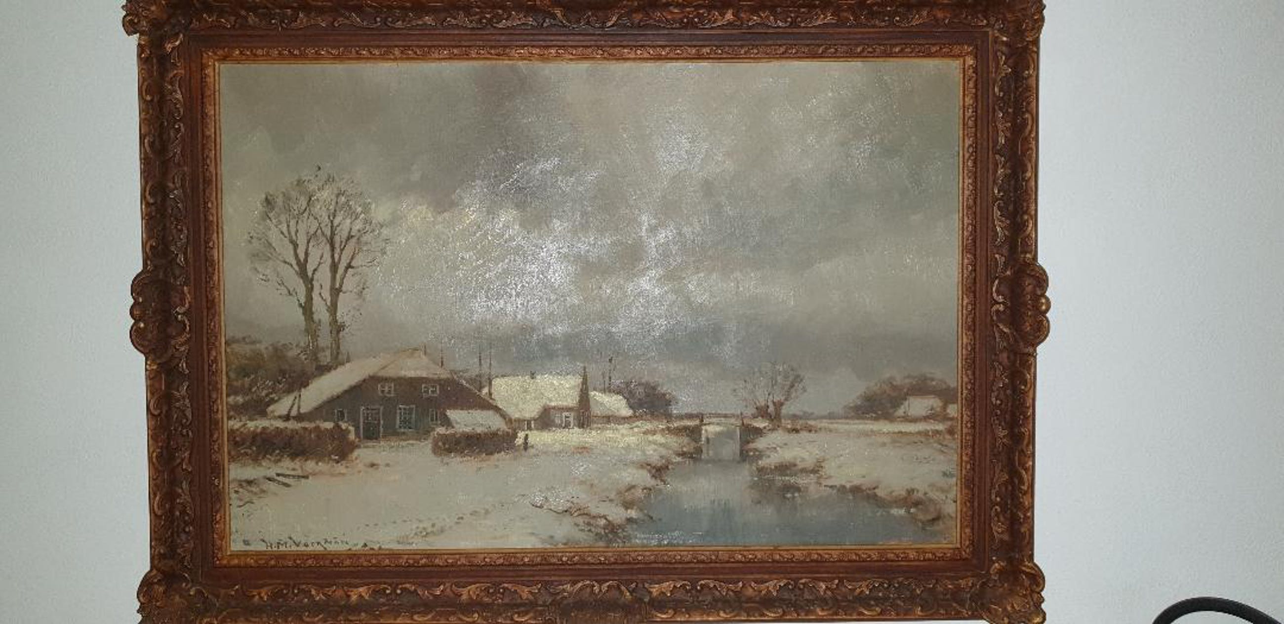Fraai wintergezicht van H.M. Voerman. Groot formaat schilderij. Ingesneeuwde boerderijen aan vaart met bruggetje. Zeer mooie wolkenlucht. Tafereel zoals we het in Nederland steeds minder zullen zien.