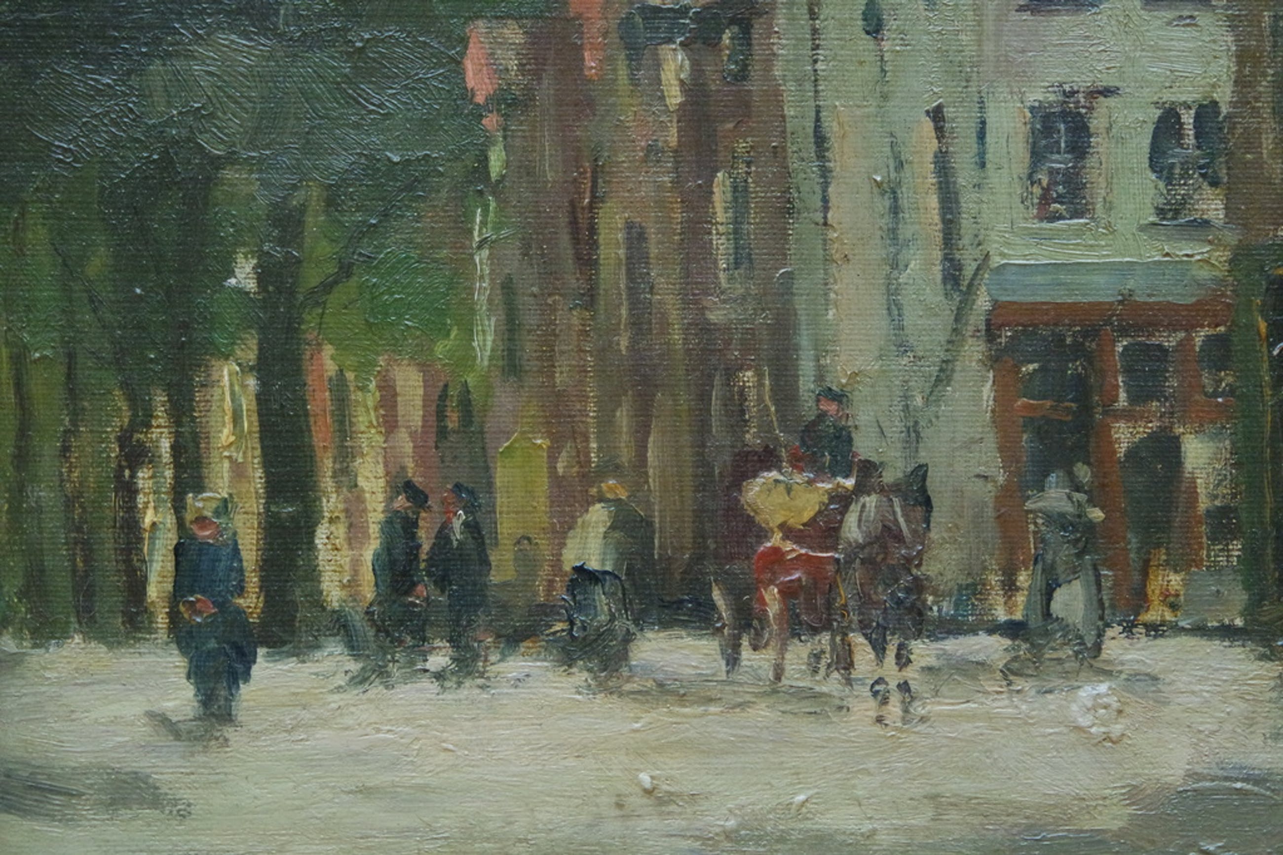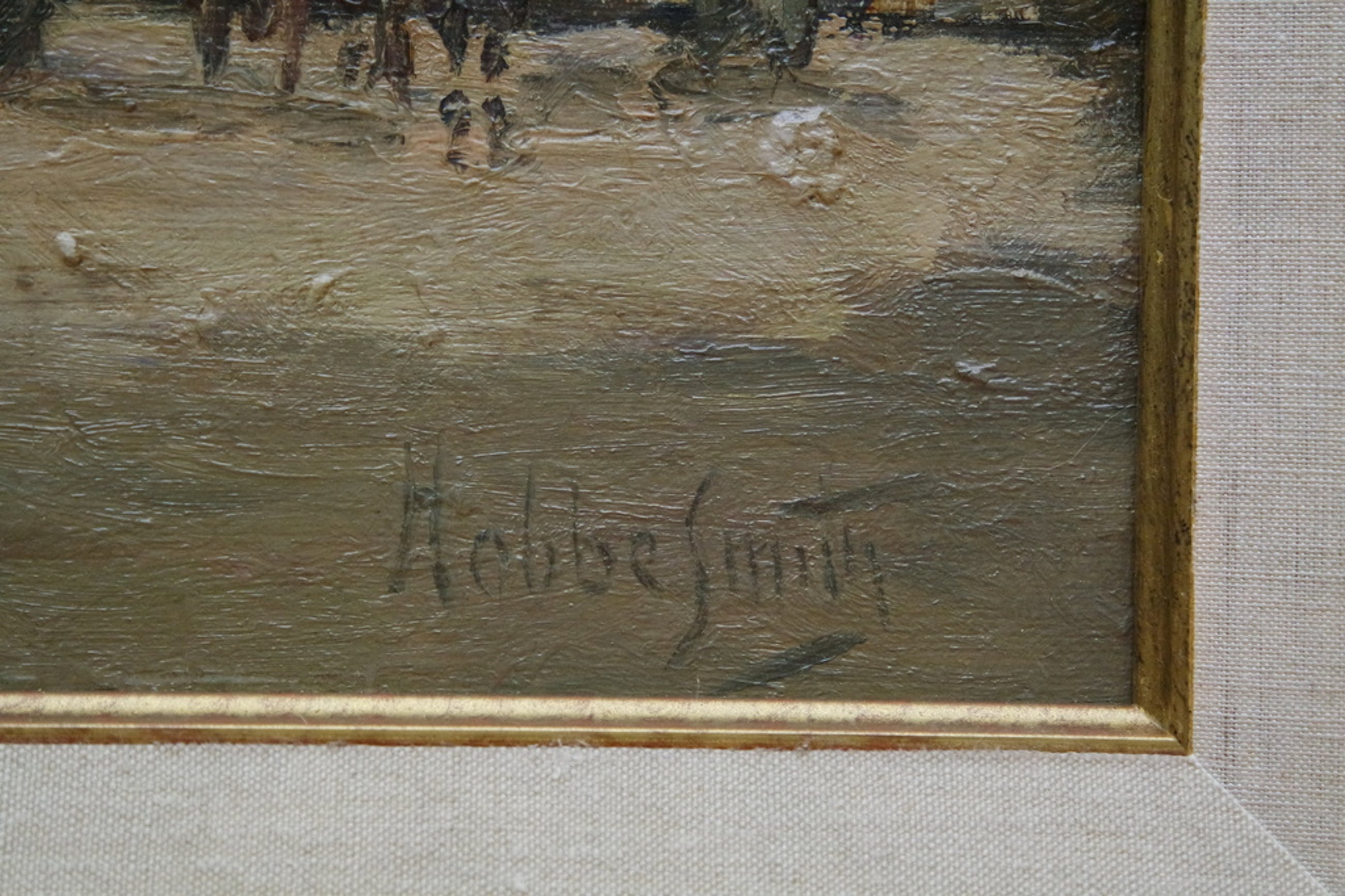 Een zeer fraai stadsgezicht van de Nederlandse kunstenaar Hobbe SMITH: (Witmarsum 1862 - Amsterdam 1942). Met een mooie goudkleurige lijst. Gesigneerd rechts onder. Afmetingen met lijst: 37 cm. x 59 cm. Paneelmaat: 22 cm. x 44 cm. Conditie: heel goed. Het kunstwerk wordt goed gepakt en GRATIS (binnen Nederland en Belgie) verzonden. Afhalen is ook mogelijk. Info: www.rkd.nl/smith.
