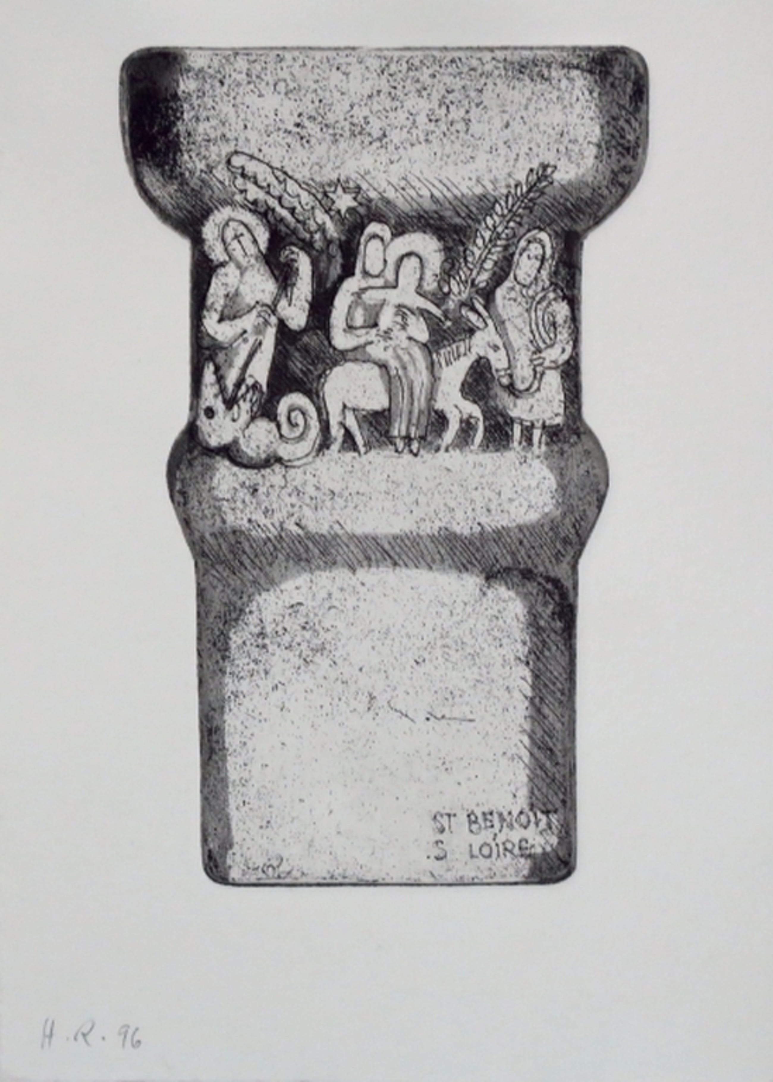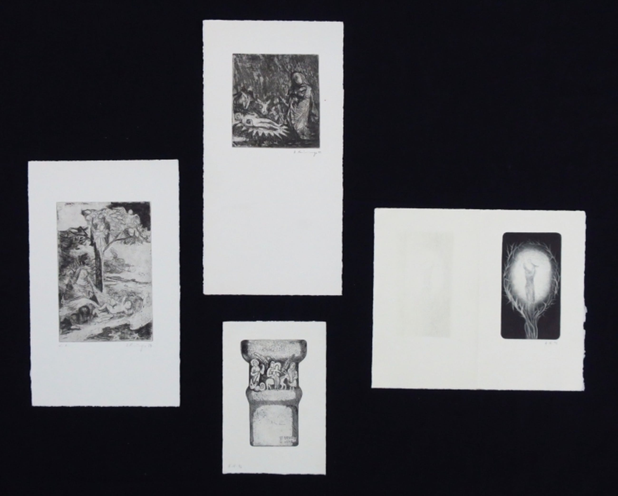 Lot met 4 etsen, waaronder St. Benoit S. Loire en 3 afbeeldingen van Madonna met kind.