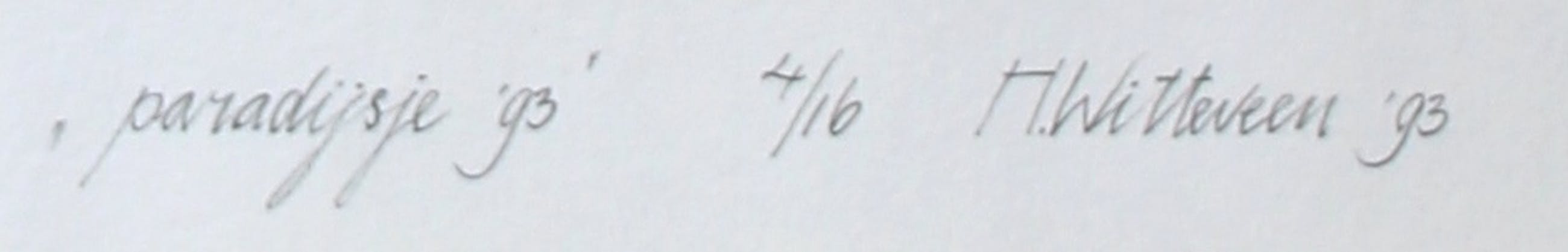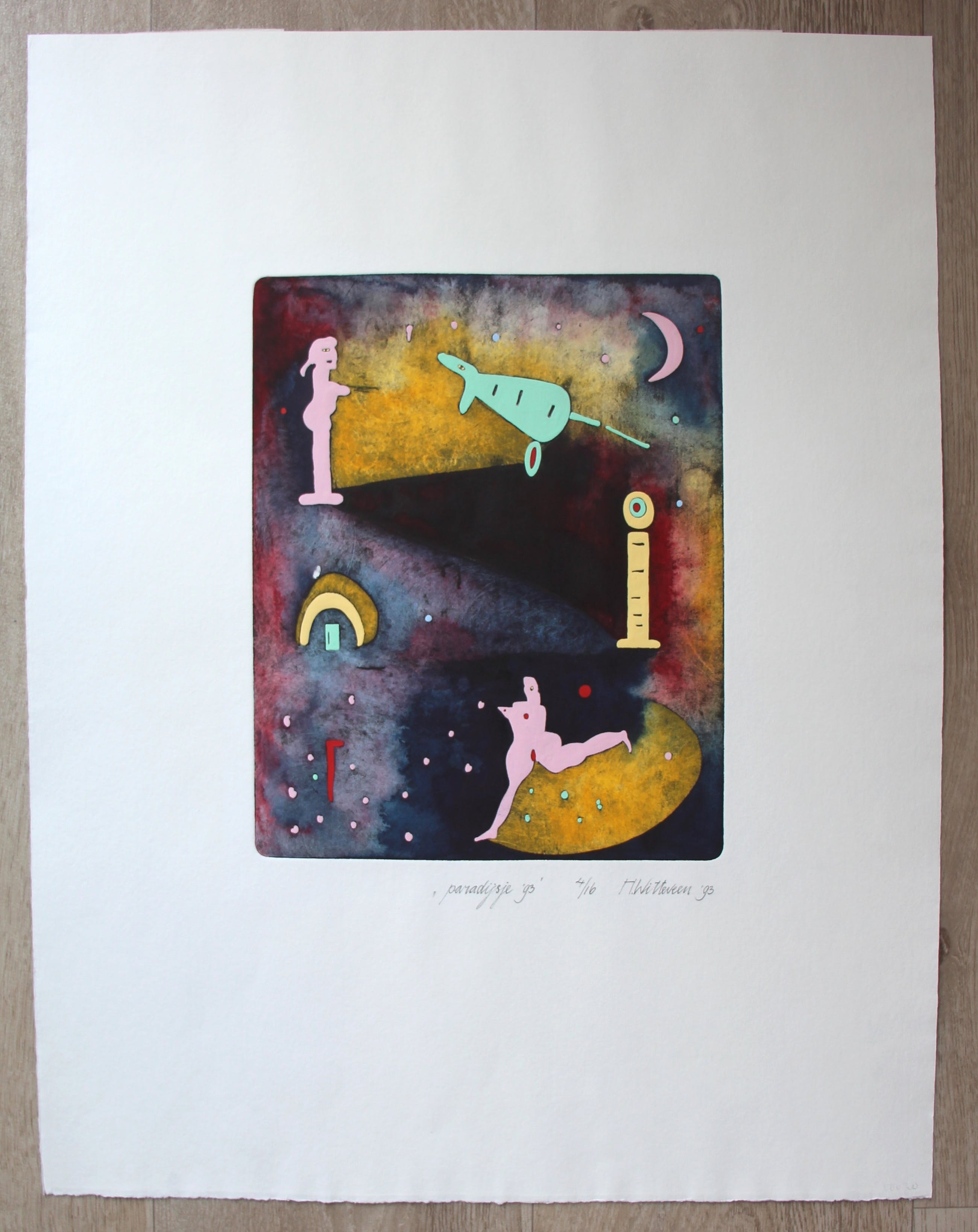 Mooie kleurrijke ets van Hollie Witteveen uit 1993.. Titel: Paradijsje. Nummer 4/16. Afmetingen blad: H60.5 x b47 cm. Afmetingen voorstelling: H29.5 x b24 cm. Het werk is rechtsonder met potlood gesigneerd door de kunstenares. De authenticiteit van dit werk wordt volledig gegarandeerd. Een certificaat van echtheid kan, op aanvraag, worden gemaild. Herkomst: collectie ABN AMRO.