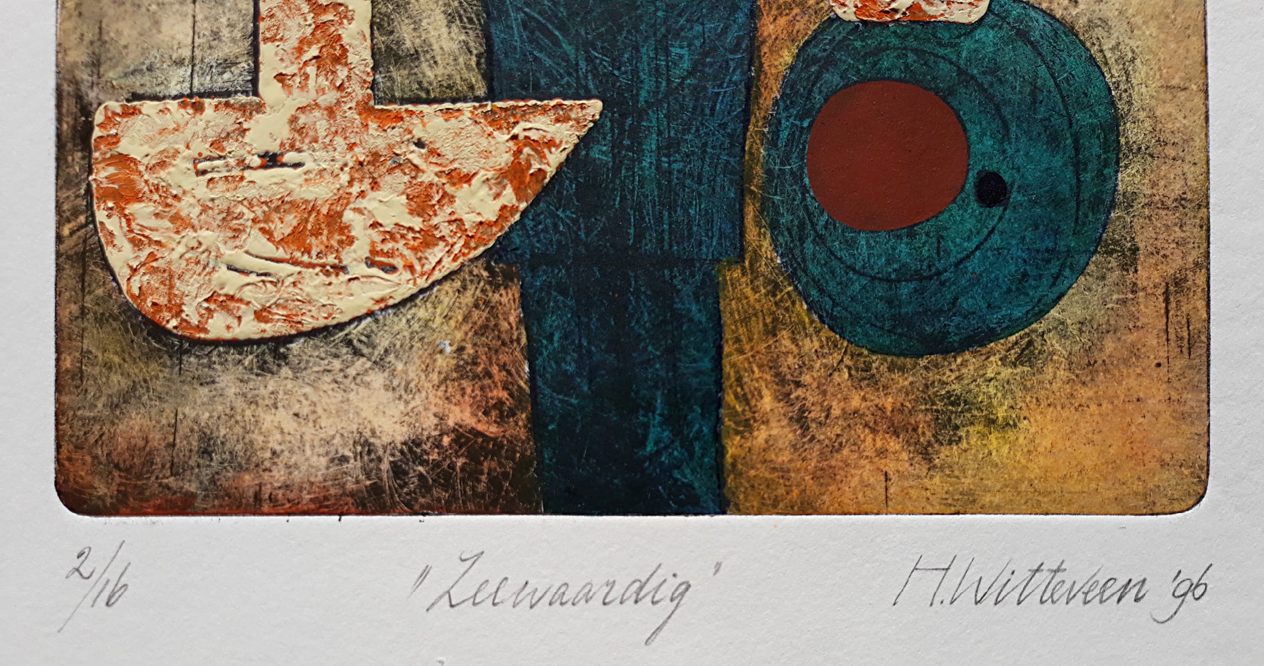 Leuk, ambachtelijk werk van Hollie Witteveen. Met de hand ingeverfde ets op Rives papier, met potlood gesigneerd, gedateerd (‘96), getiteld en genummerd (2/16). Afkomstig uit de kunstcollectie van ABNAMRO, in uitstekende conditie. Blad heeft ingelijst gezeten want er is een nauwelijks waarneembare verkleuring van een vorig passe-partout.
