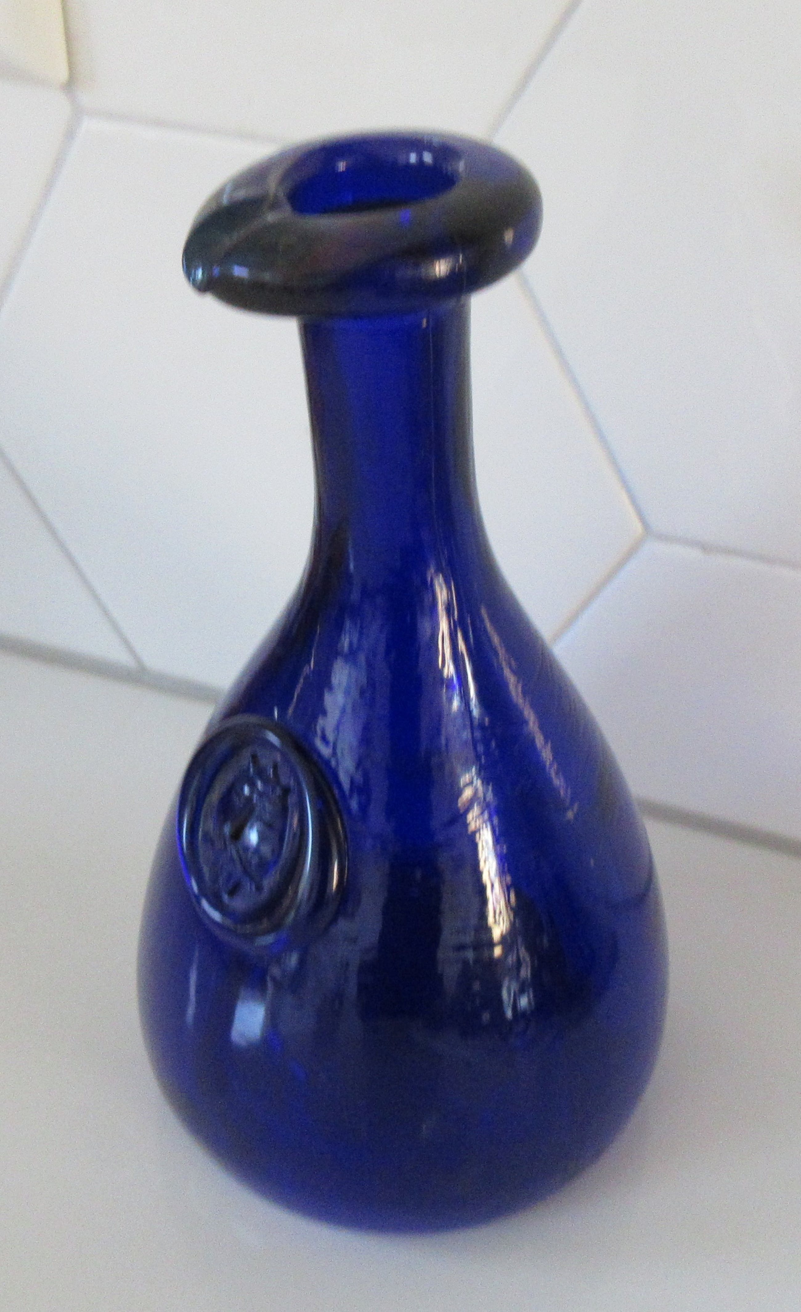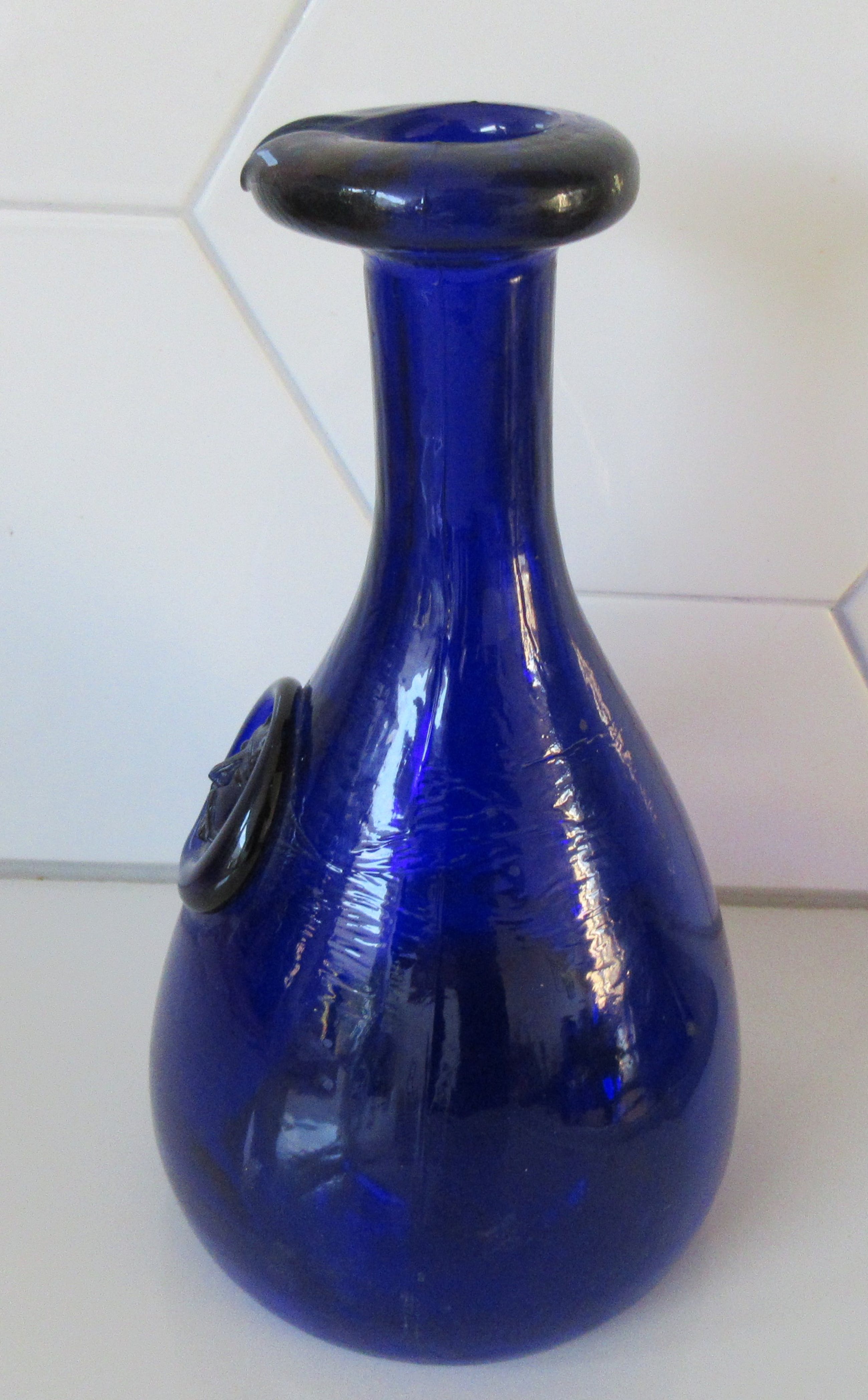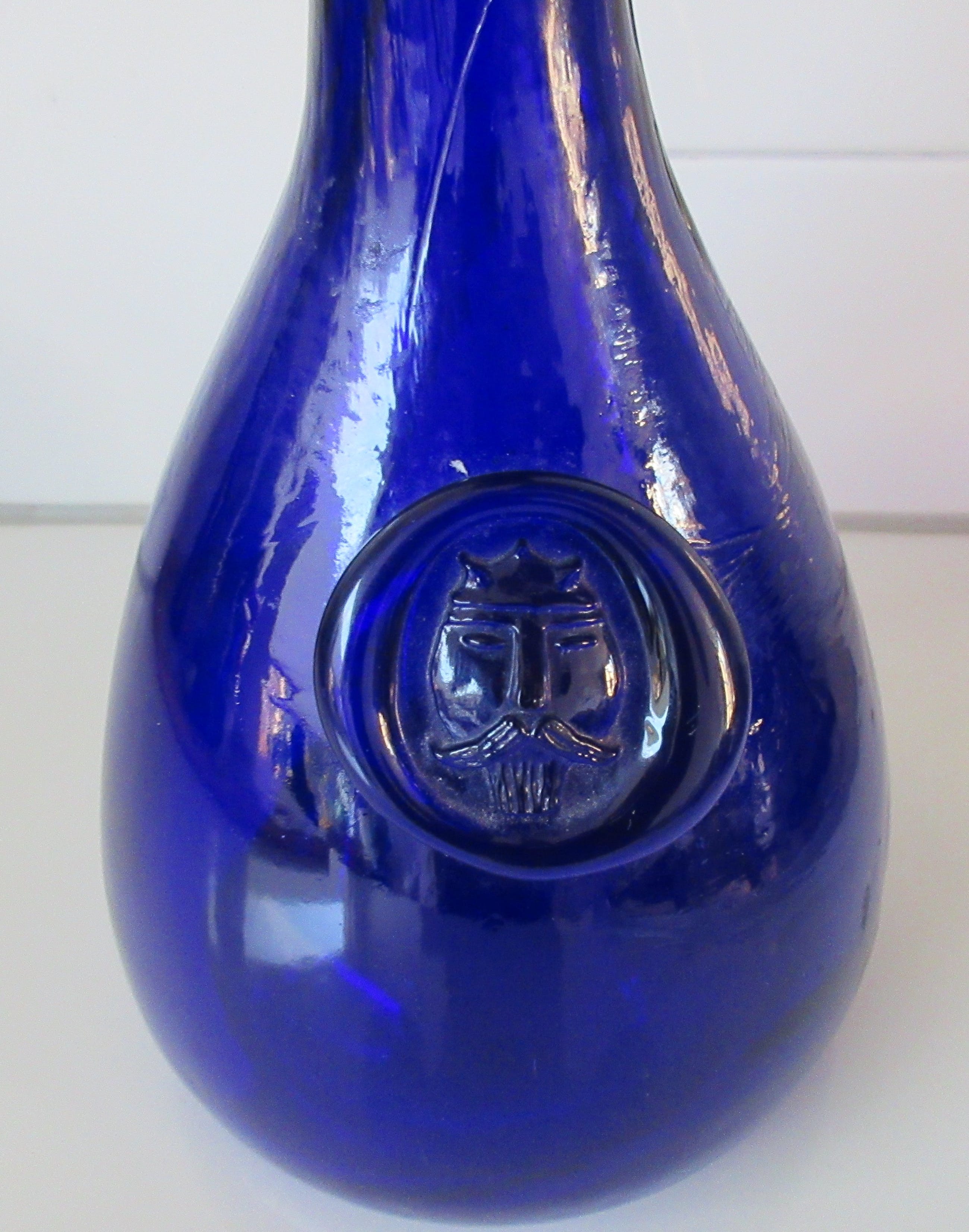Cobalt blauw Viking fles karaf ontwerp Ole Winther in 1955, deze karaf werd gebruik voor de Deense Kersenlikeur Helsingor. Aan de voorzijde een stempel van een Viking. Niet gemerkt.