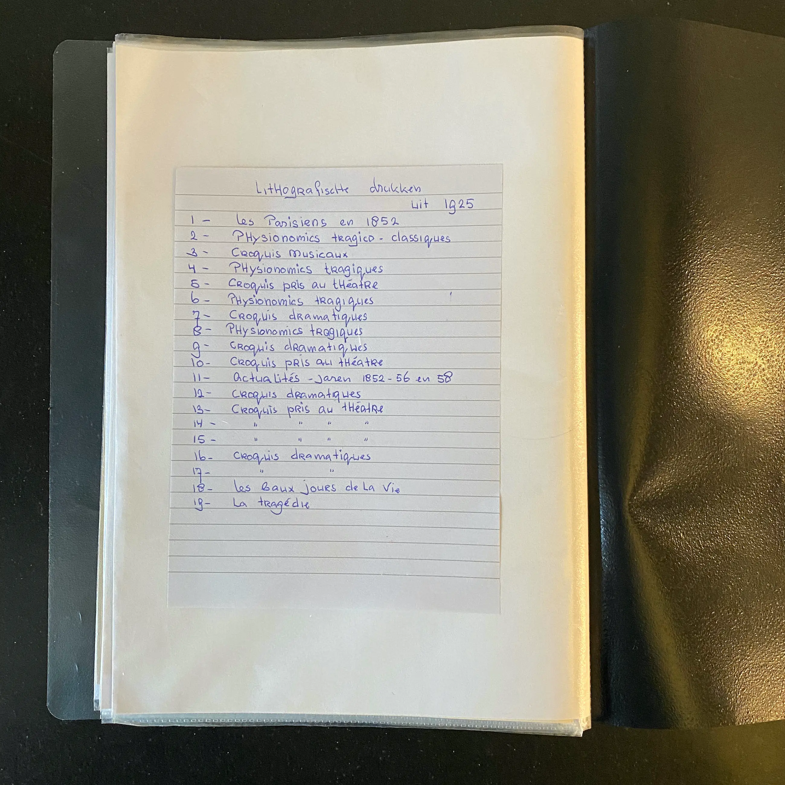 Foto's één en twee geven een overzicht van 16 van de in totaal 19 lithografische drukken. Omdat ik niet meer dan 16 foto's kan plaatsten dus als volgt......dan volgen drie 'gewone' foto's. En de laatste twee foto's zijn van de map die deel uit maakt van deze veiling. Op de één na laatste foto kunt u de herkomst van de desbetreffende items terug vinden.
