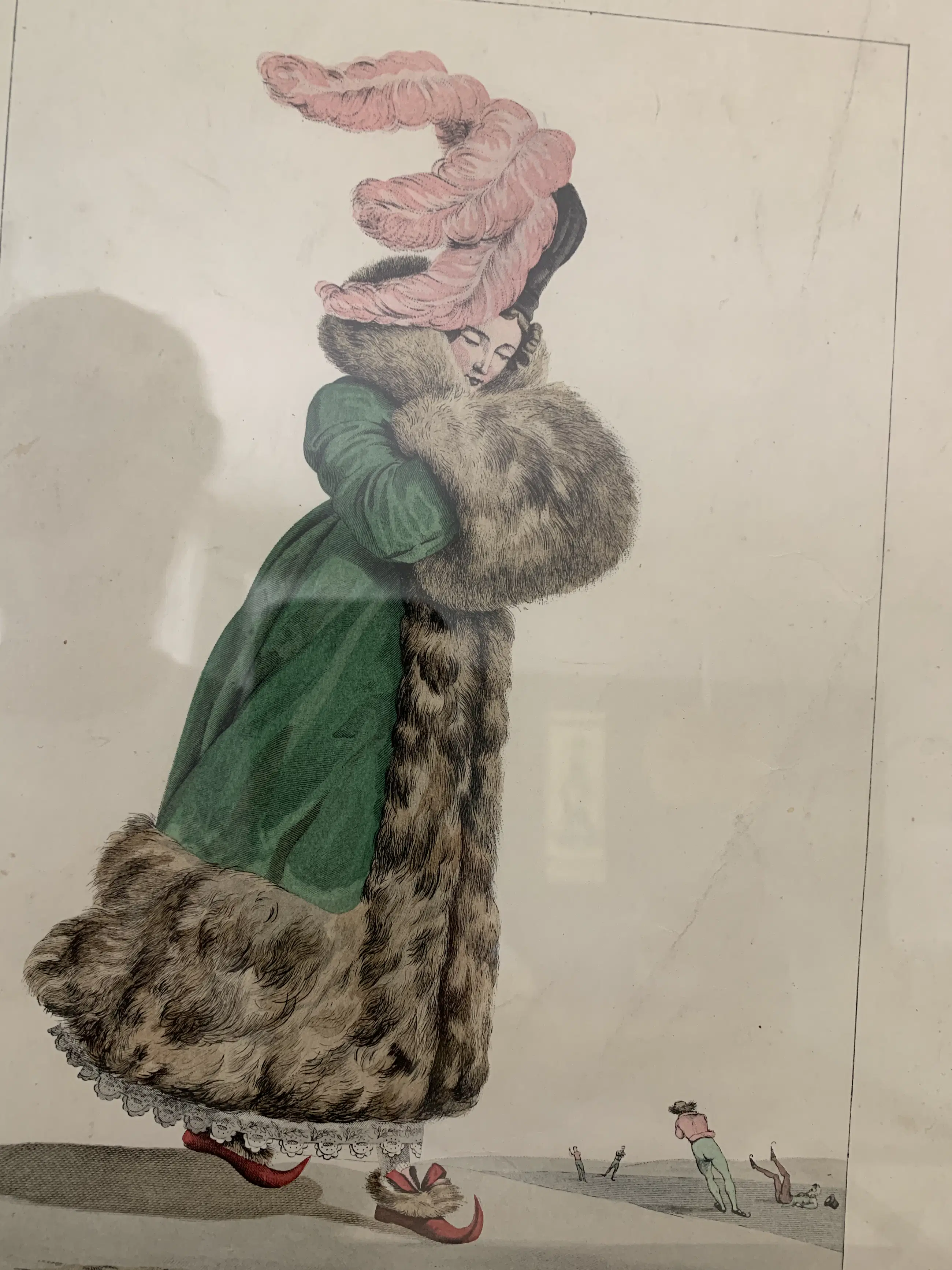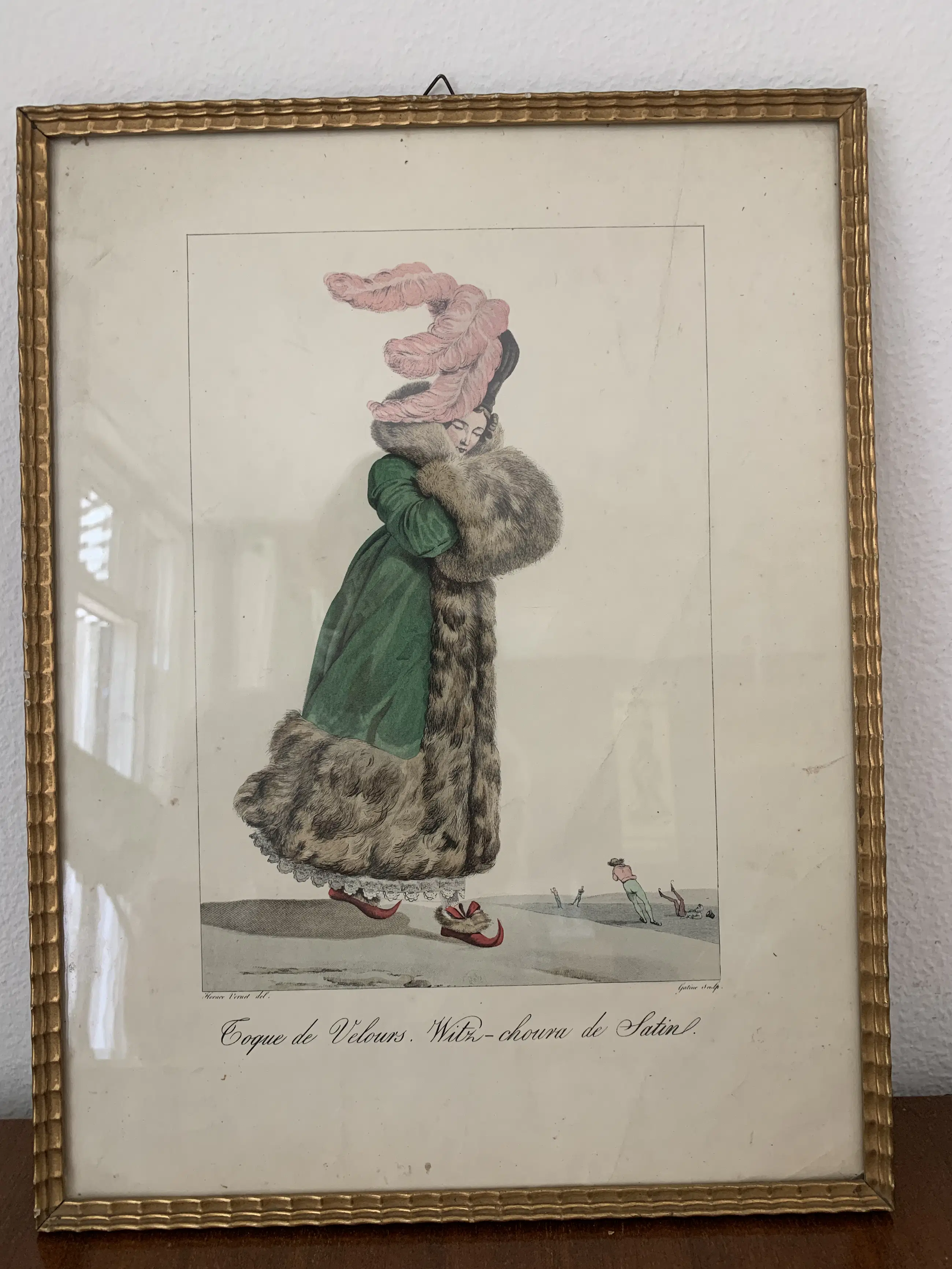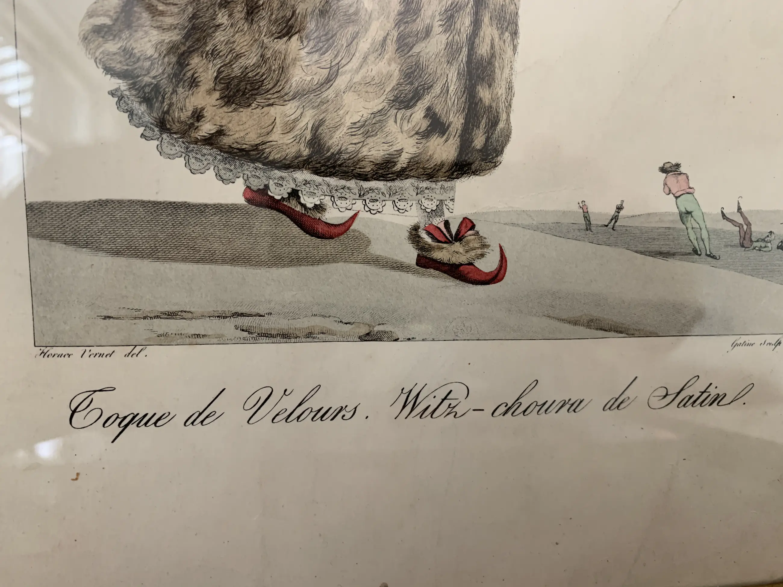 Een met de hand ingekleurde ingelijste gravure welke onderdeel uitmaakt van een set van 33 van de Incroyable et Merveilleuse serie, gepubliceerd in 1814 met afbeeldingen van uiterst modieuze Franse mannen en vrouwen.