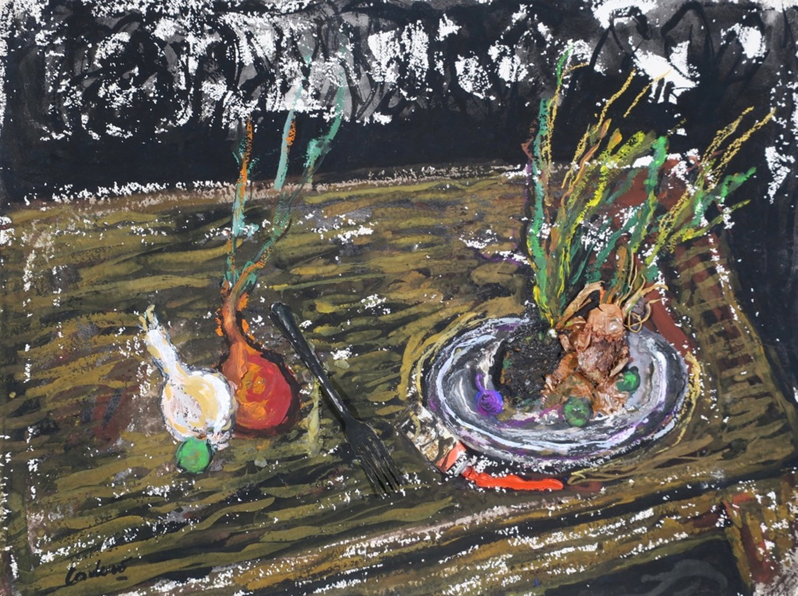 Materiaal: Acryl en assemblage van o.a. ui op handgeschept papier
