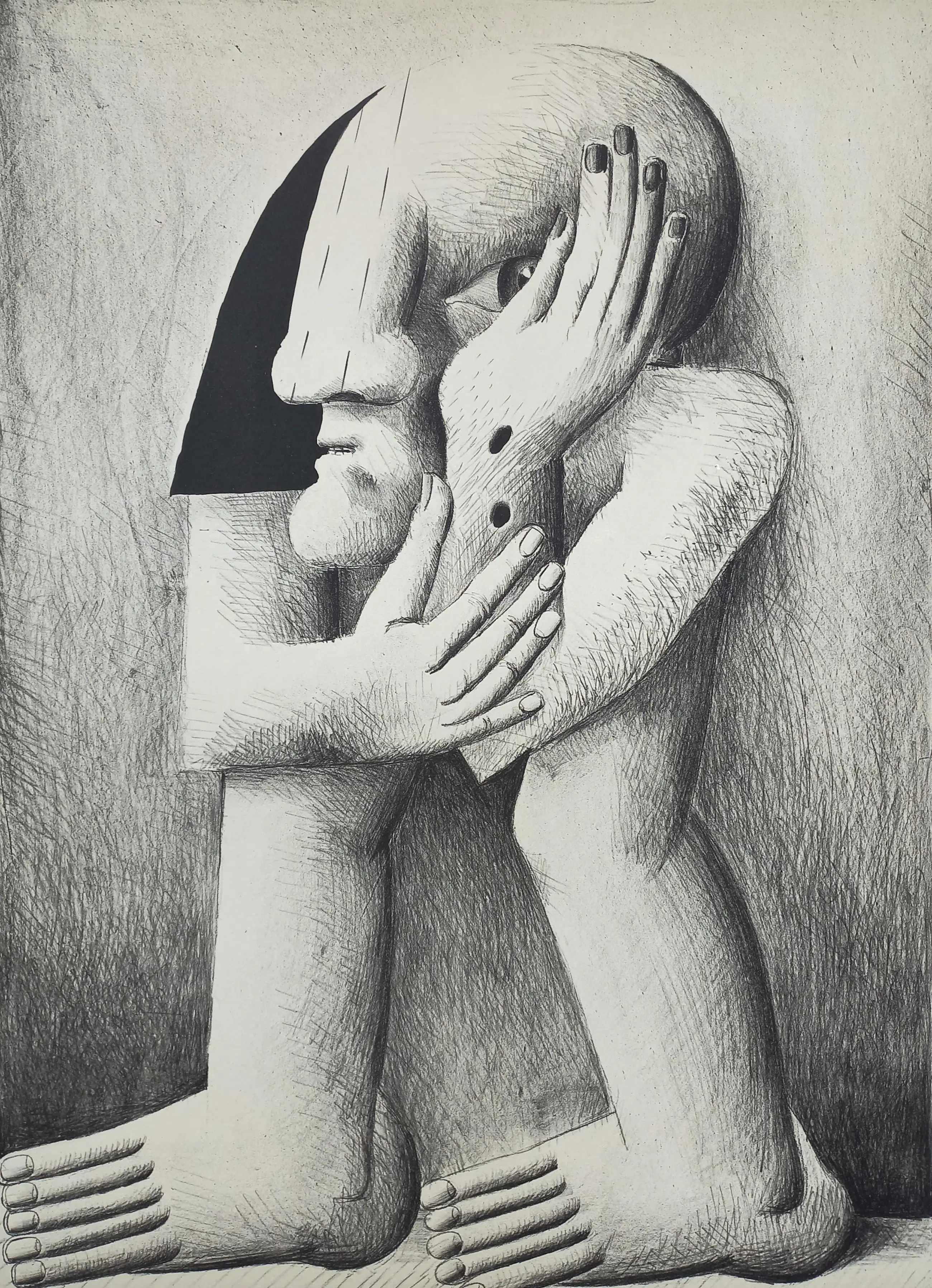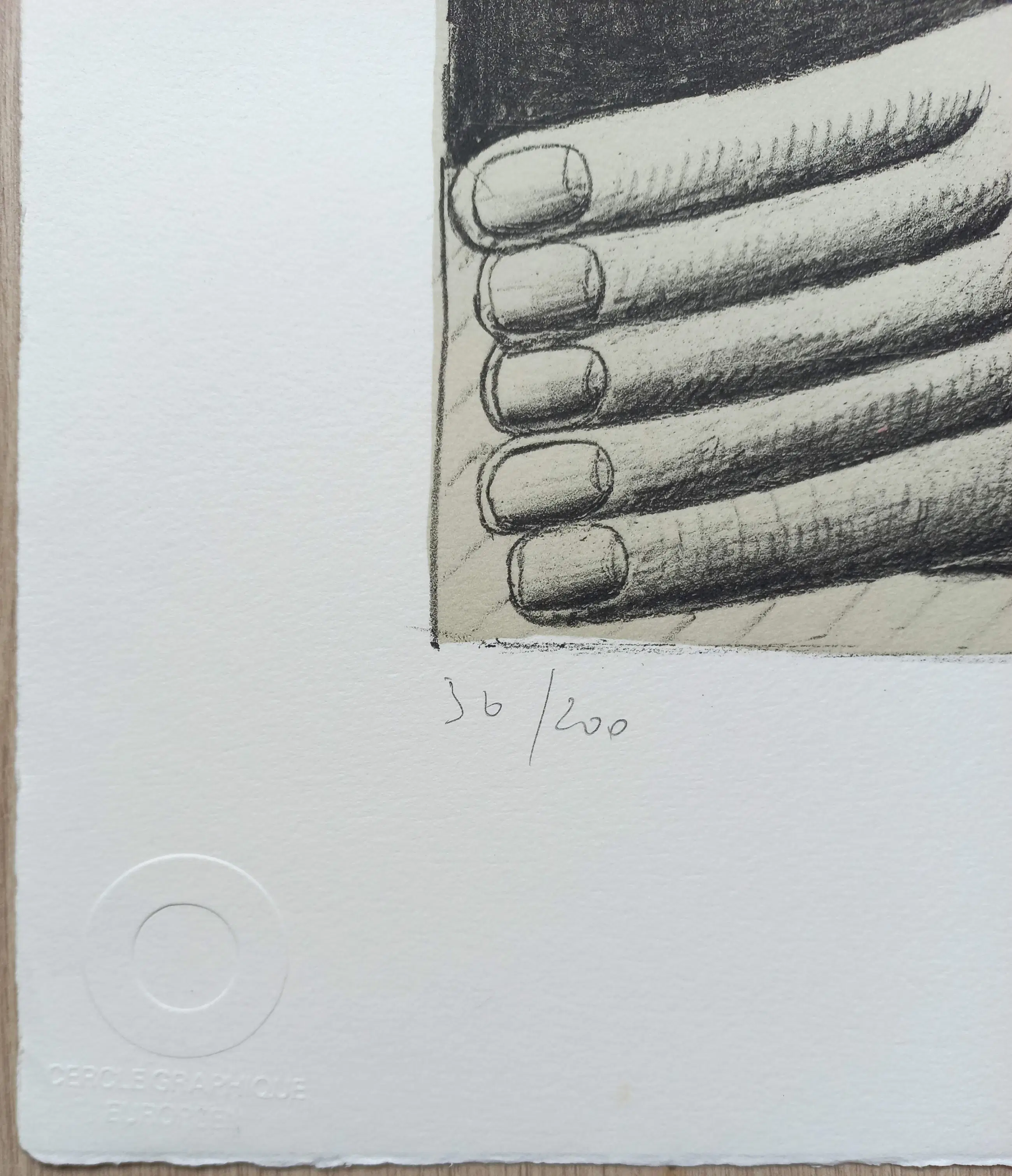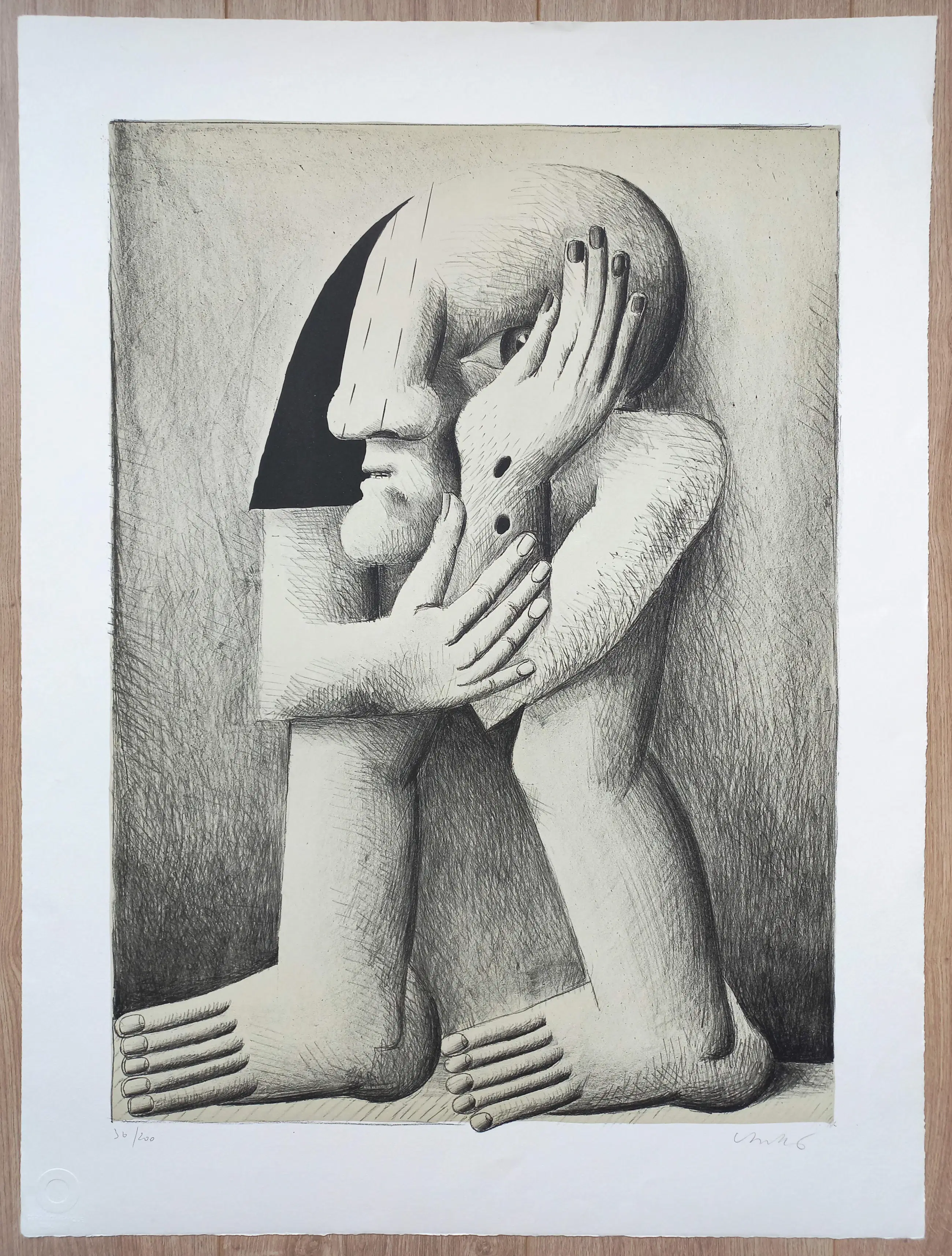 Karakteristieke 'Kopffüßler' (Hoofdvoeter) van Horst Antes, uitgegeven door Cercle Graphique Européen in 1970. Litho op Rives papier, met potlood gesigneerd en genummerd (30/200) en met blindstempel van Cercle Graphique Européen. Literatuur: Lutze 647. In uitstekende conditie.
